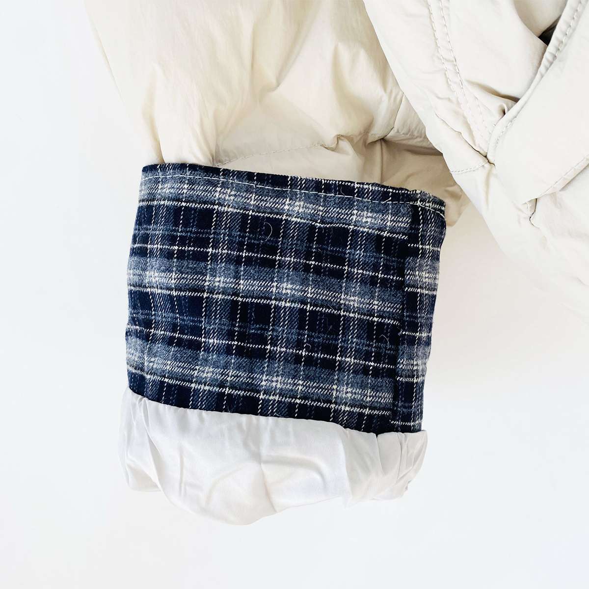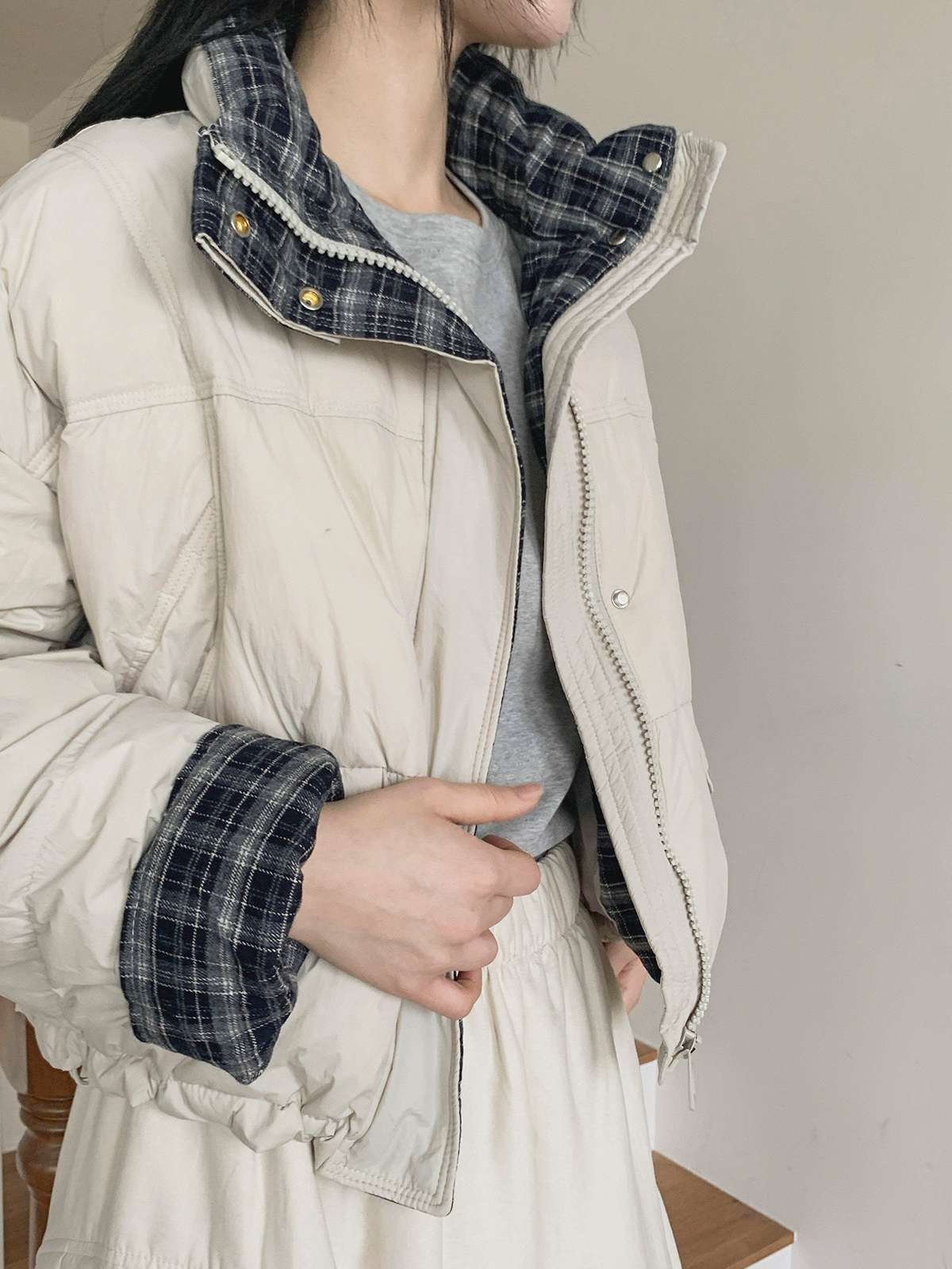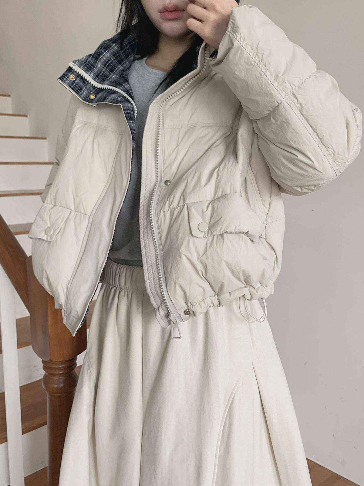 하이넥 디자인의 배색 체크 카라가 포인트인 덕다운 숏 패딩
