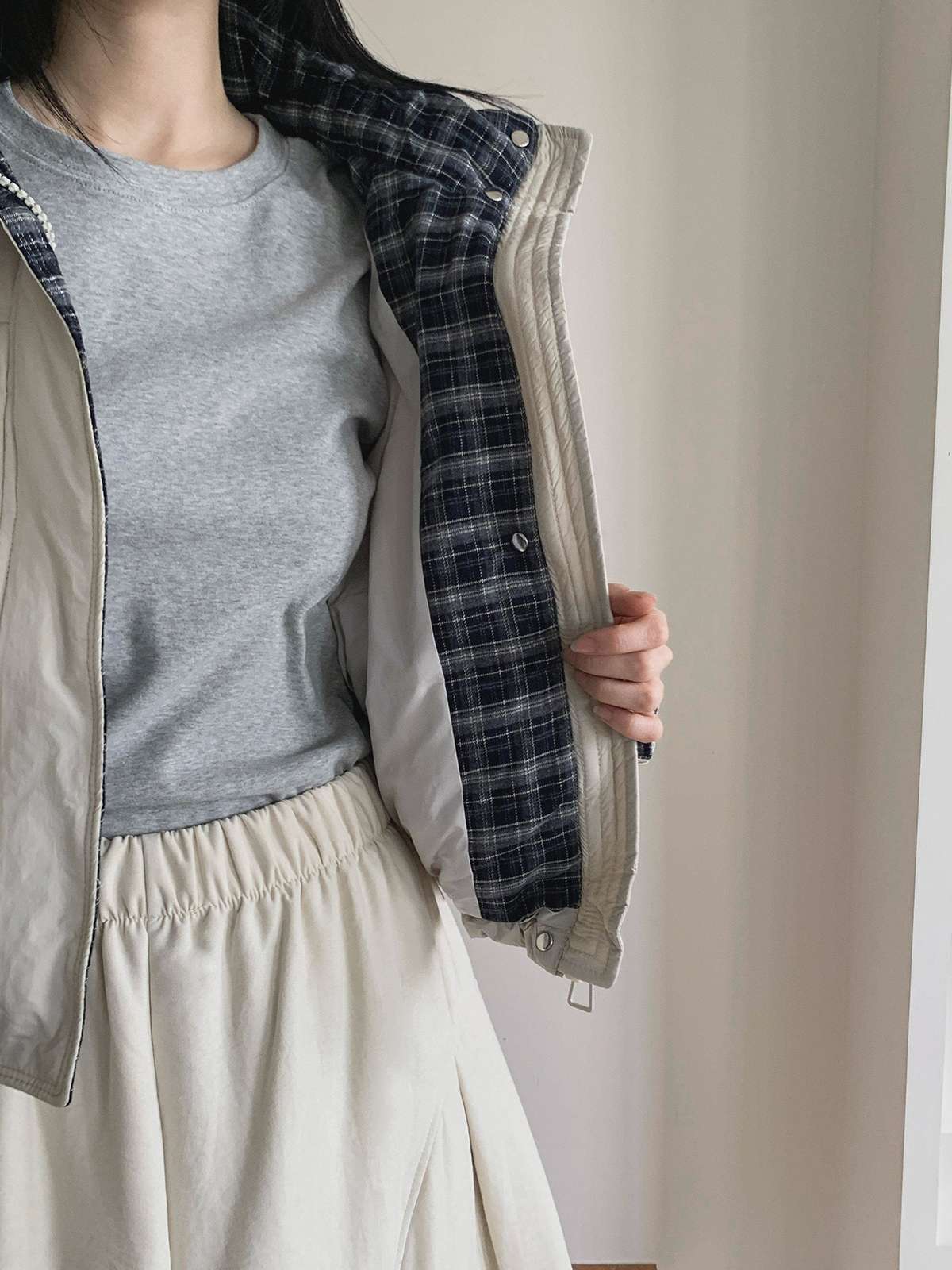 카라와 소매 안쪽에 클래식한 체크 패턴을 더해 포인트를 주었으며,