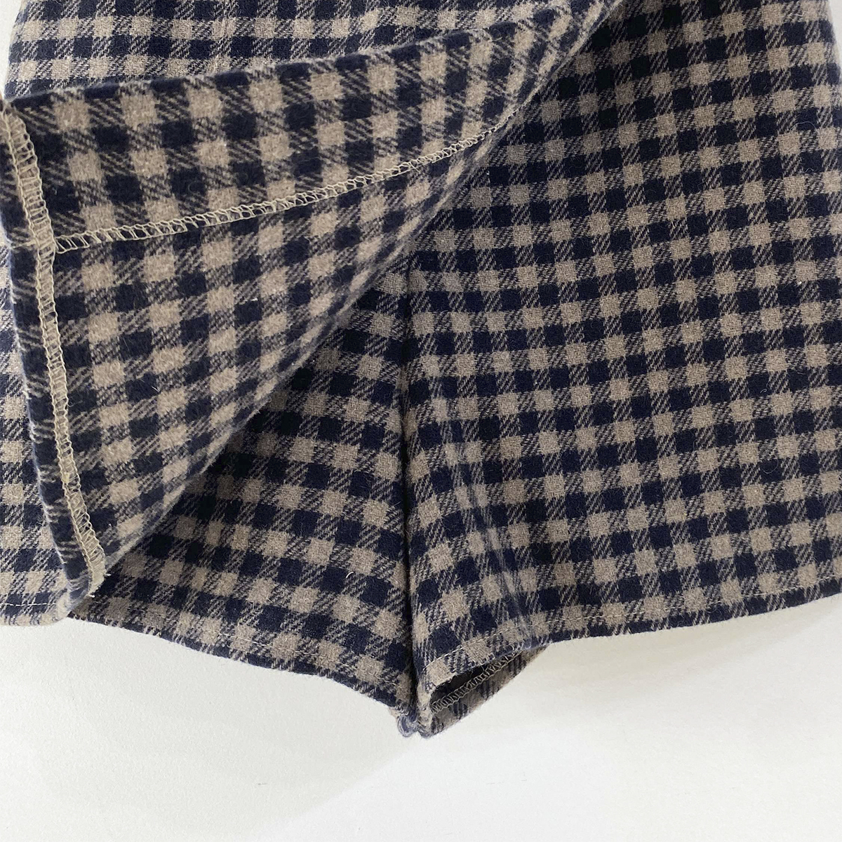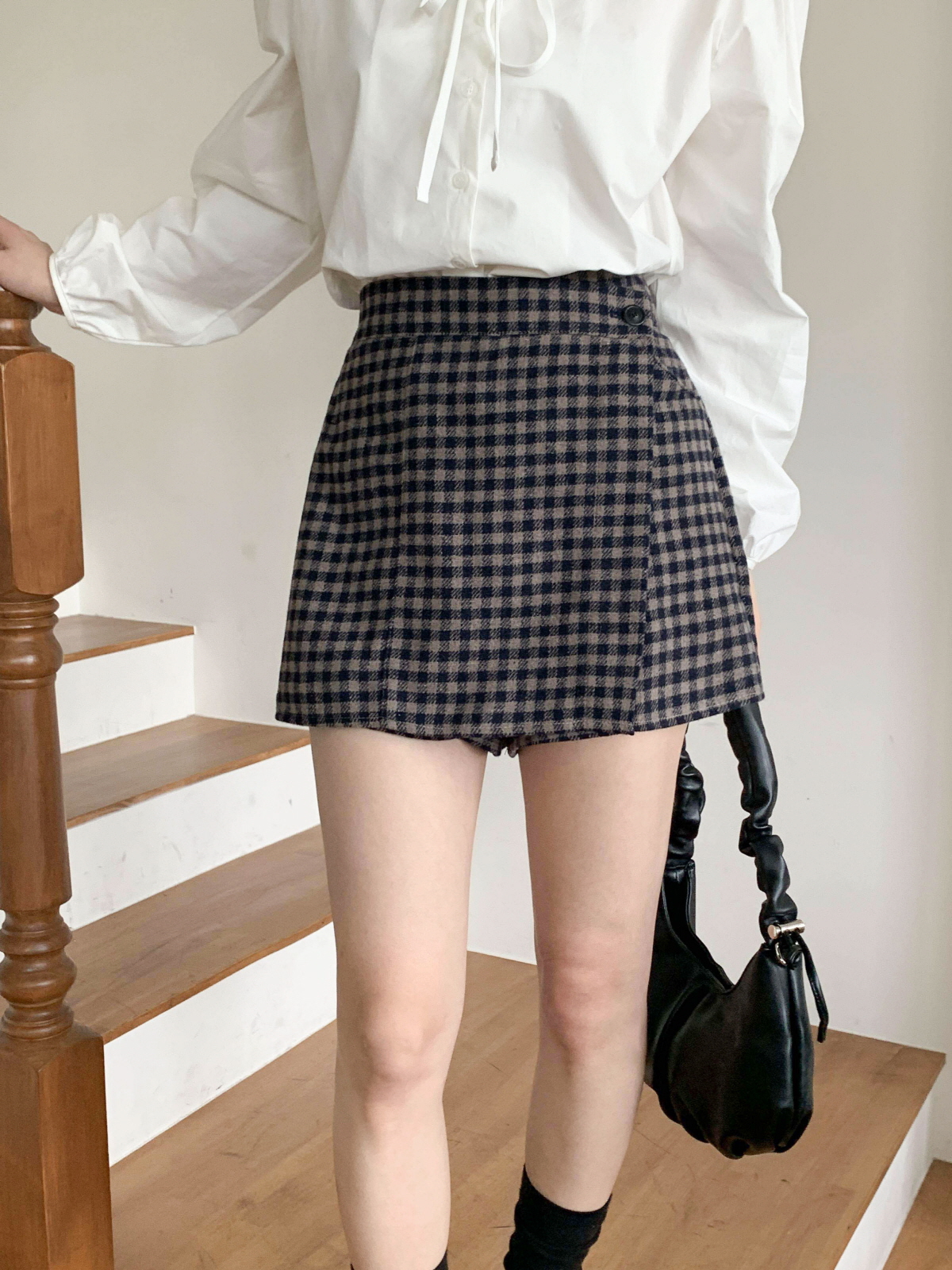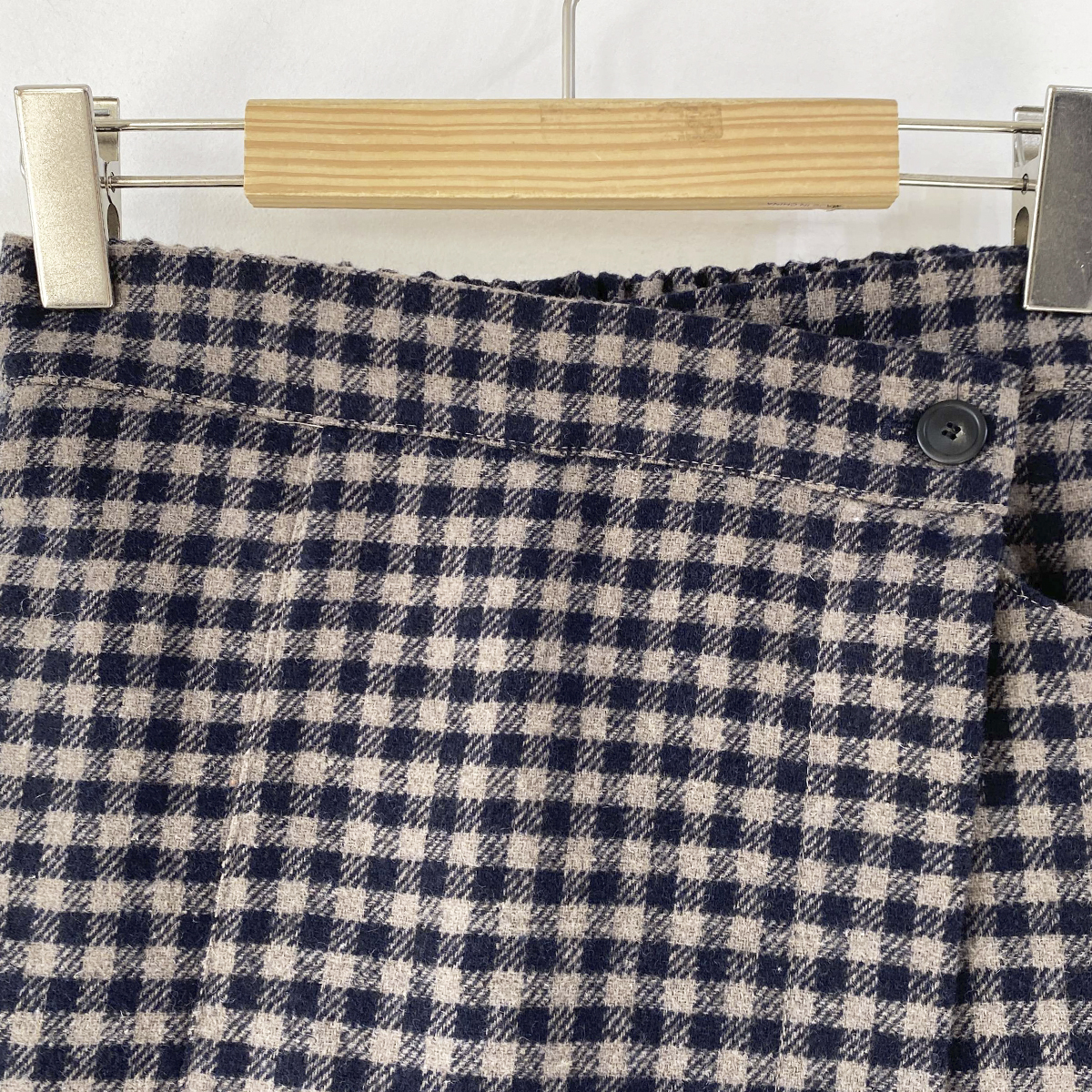 도톰한 소재의 체크 패턴이 돋보이는 랩 스타일 치마바지