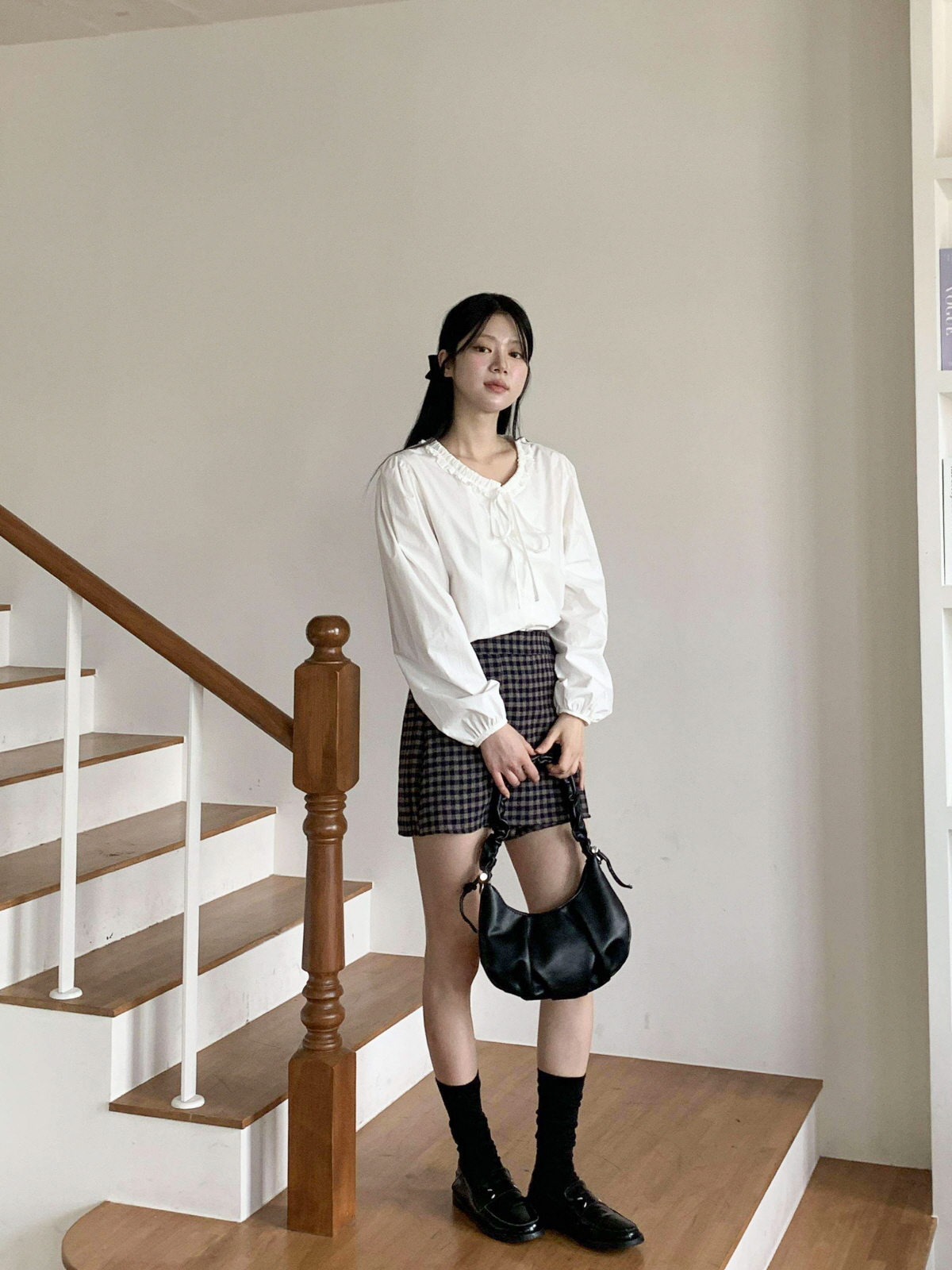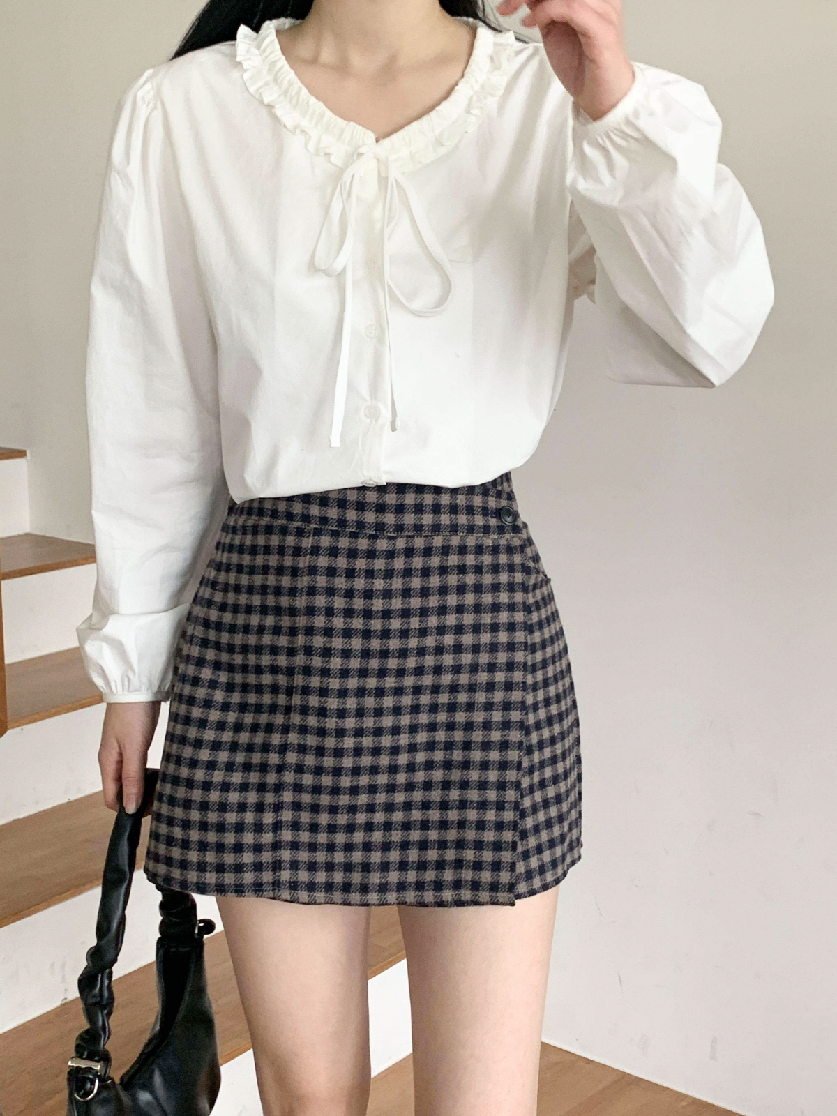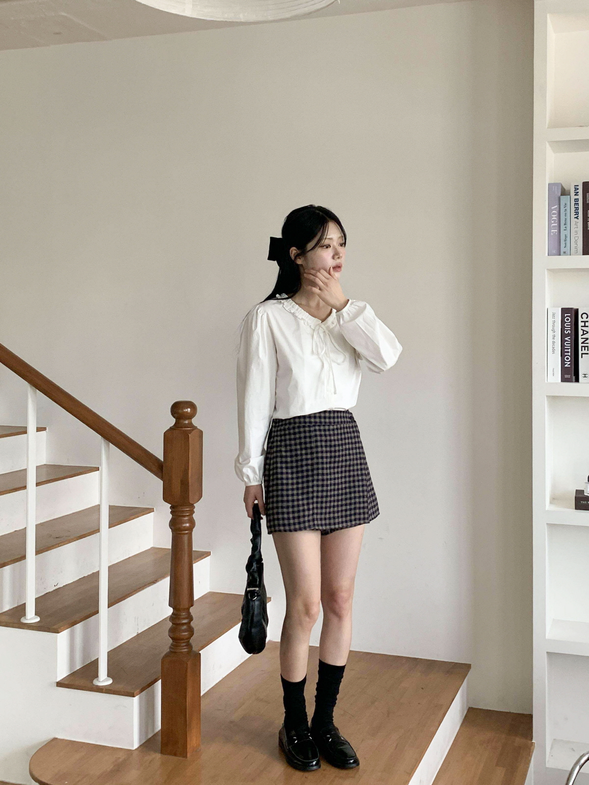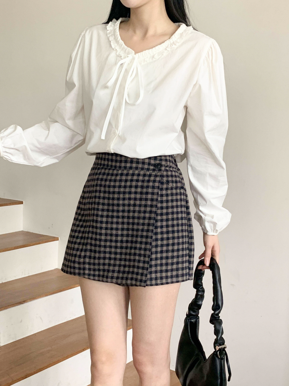 도톰한 소재의 체크 패턴이 돋보이는 랩 스타일 치마바지