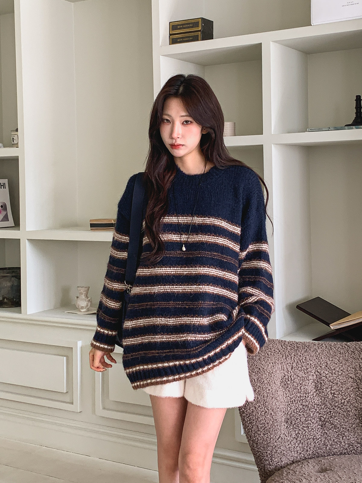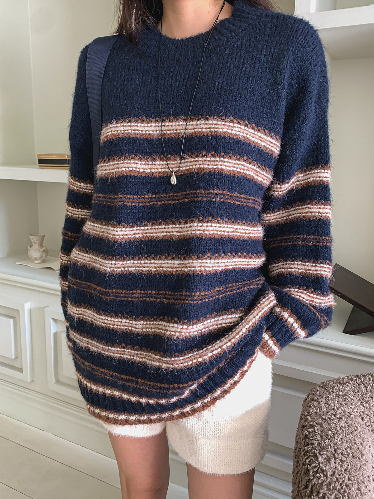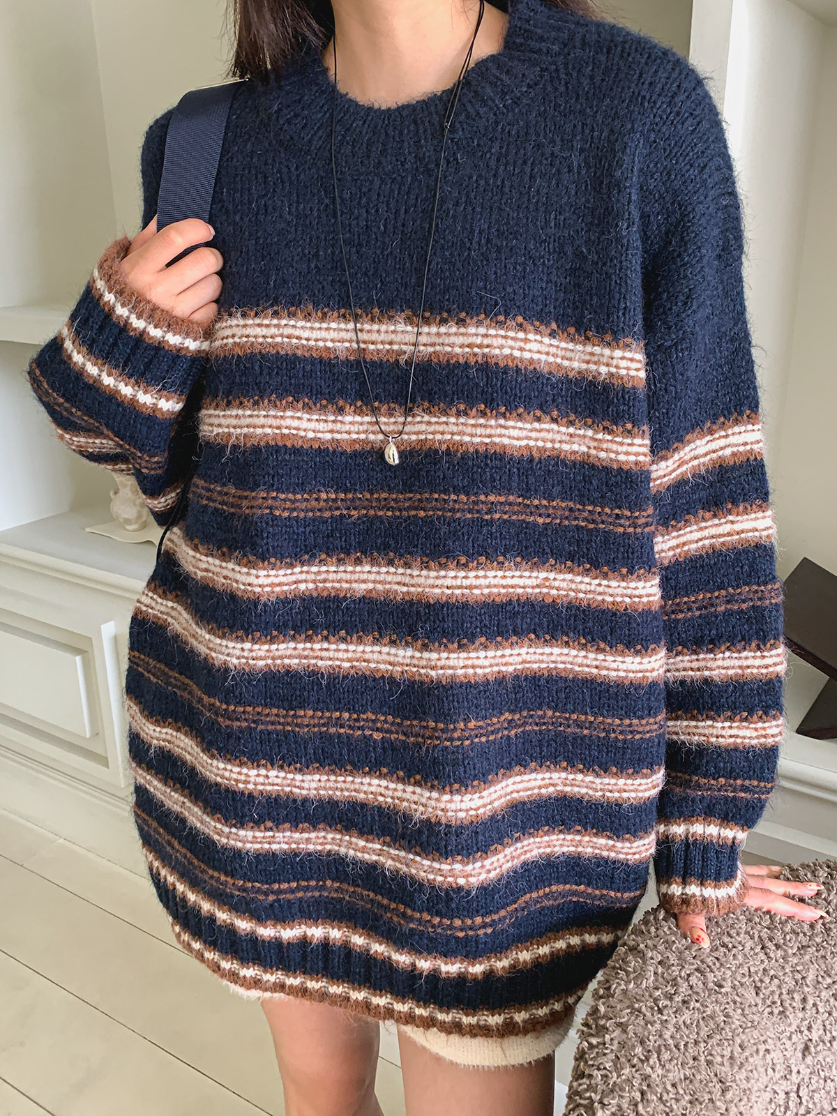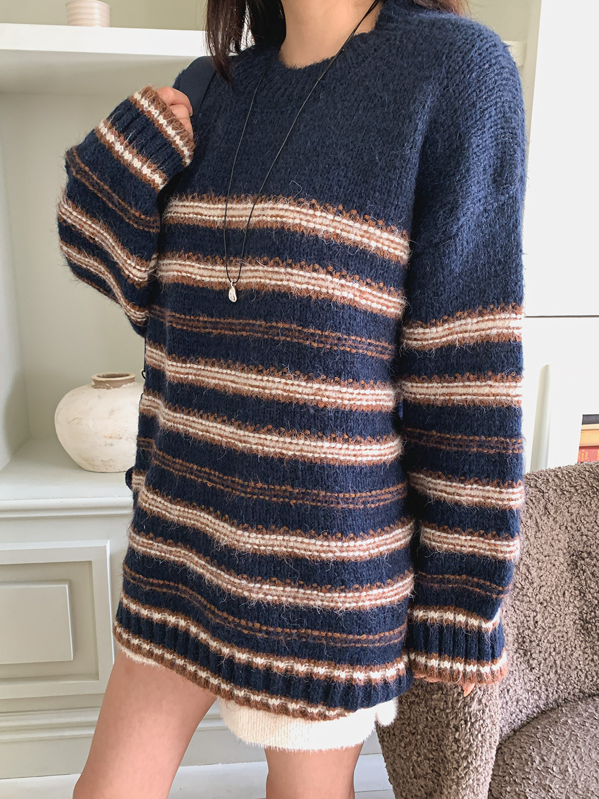 스트라이프 배색이 조화로운 루즈핏 라운드넥 니트