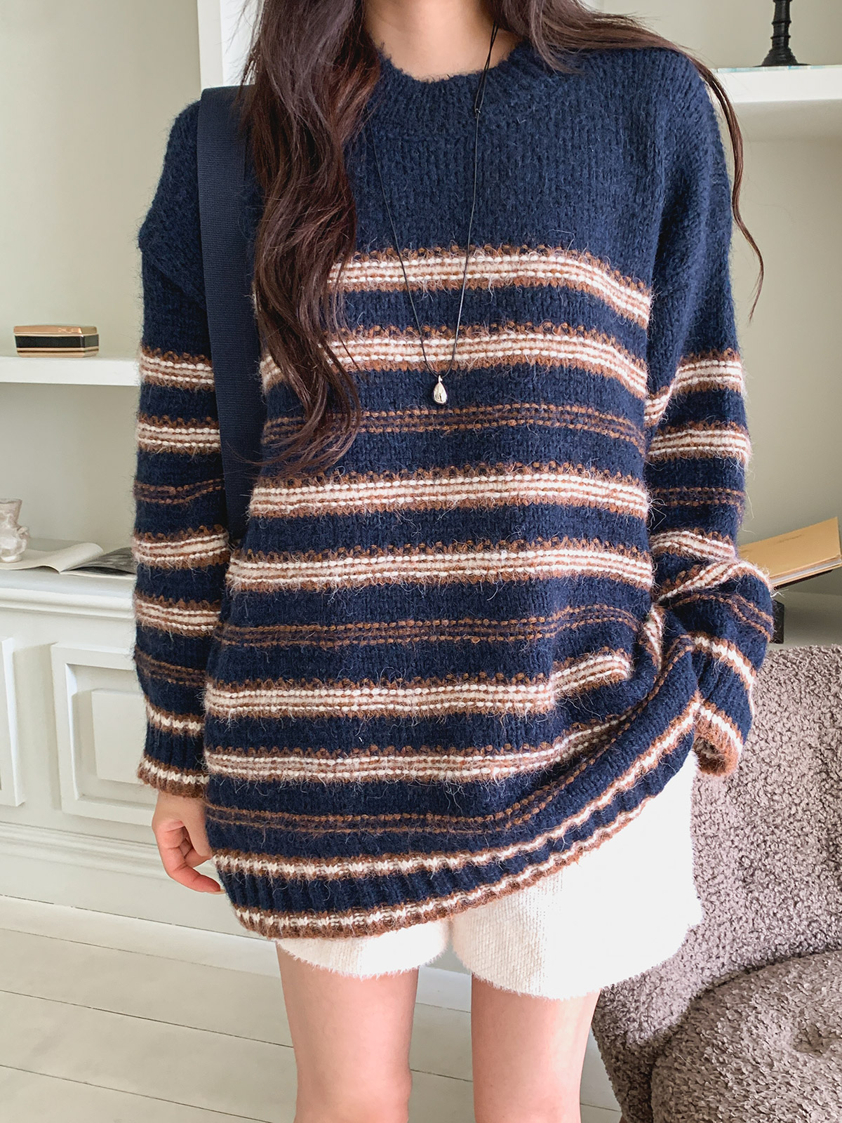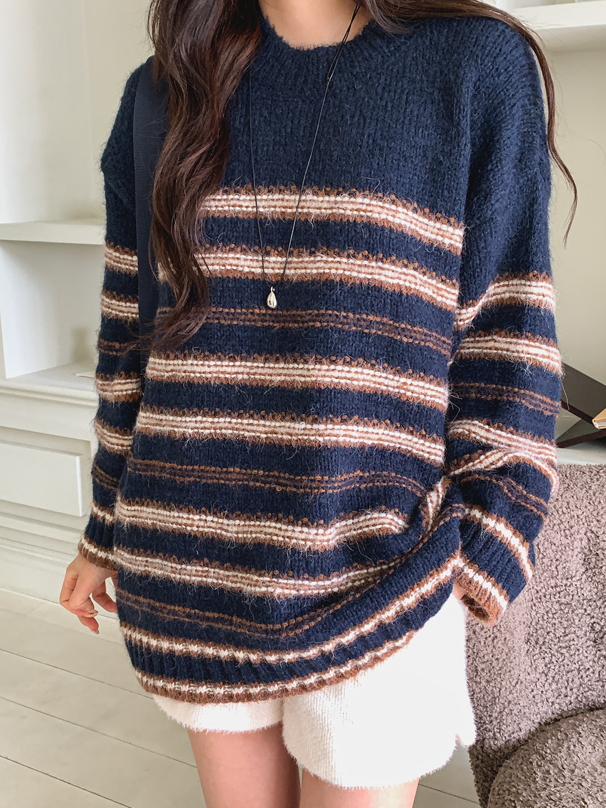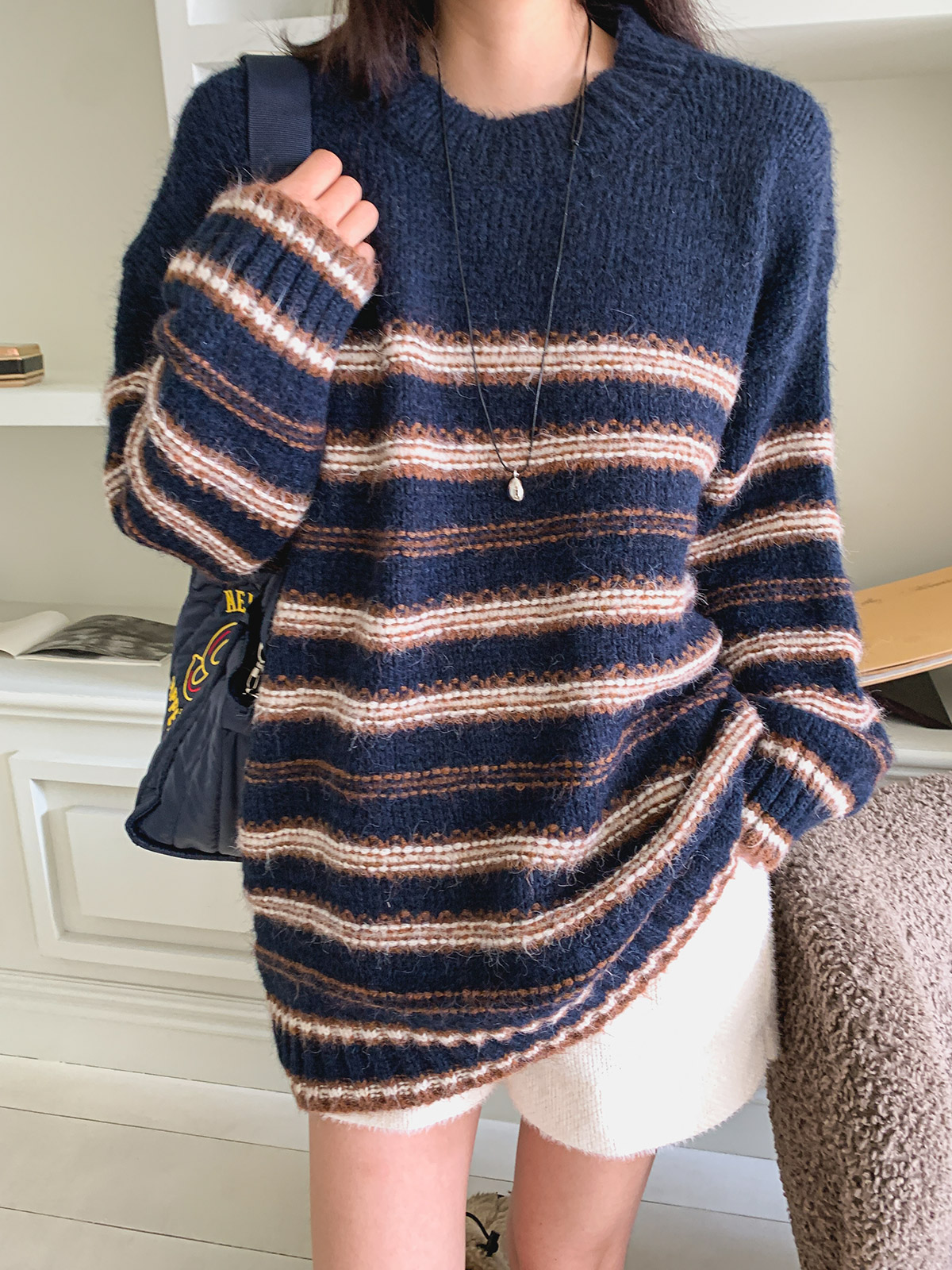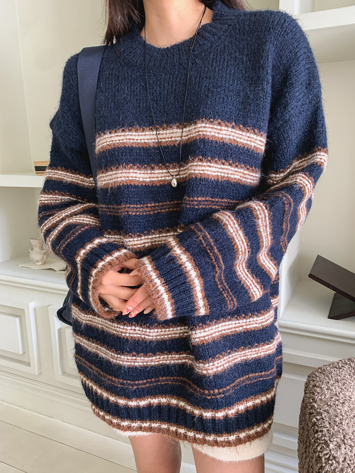 스트라이프 배색이 조화로운 루즈핏 라운드넥 니트