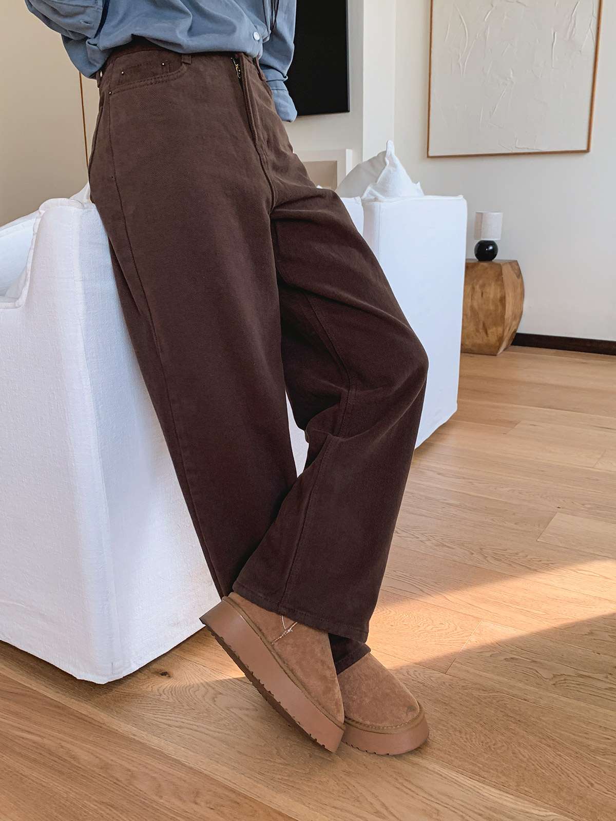 도톰한 피치 기모 코튼 소재로 제작되어 따뜻한 와이드 팬츠