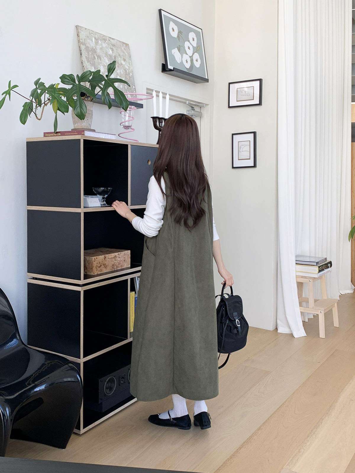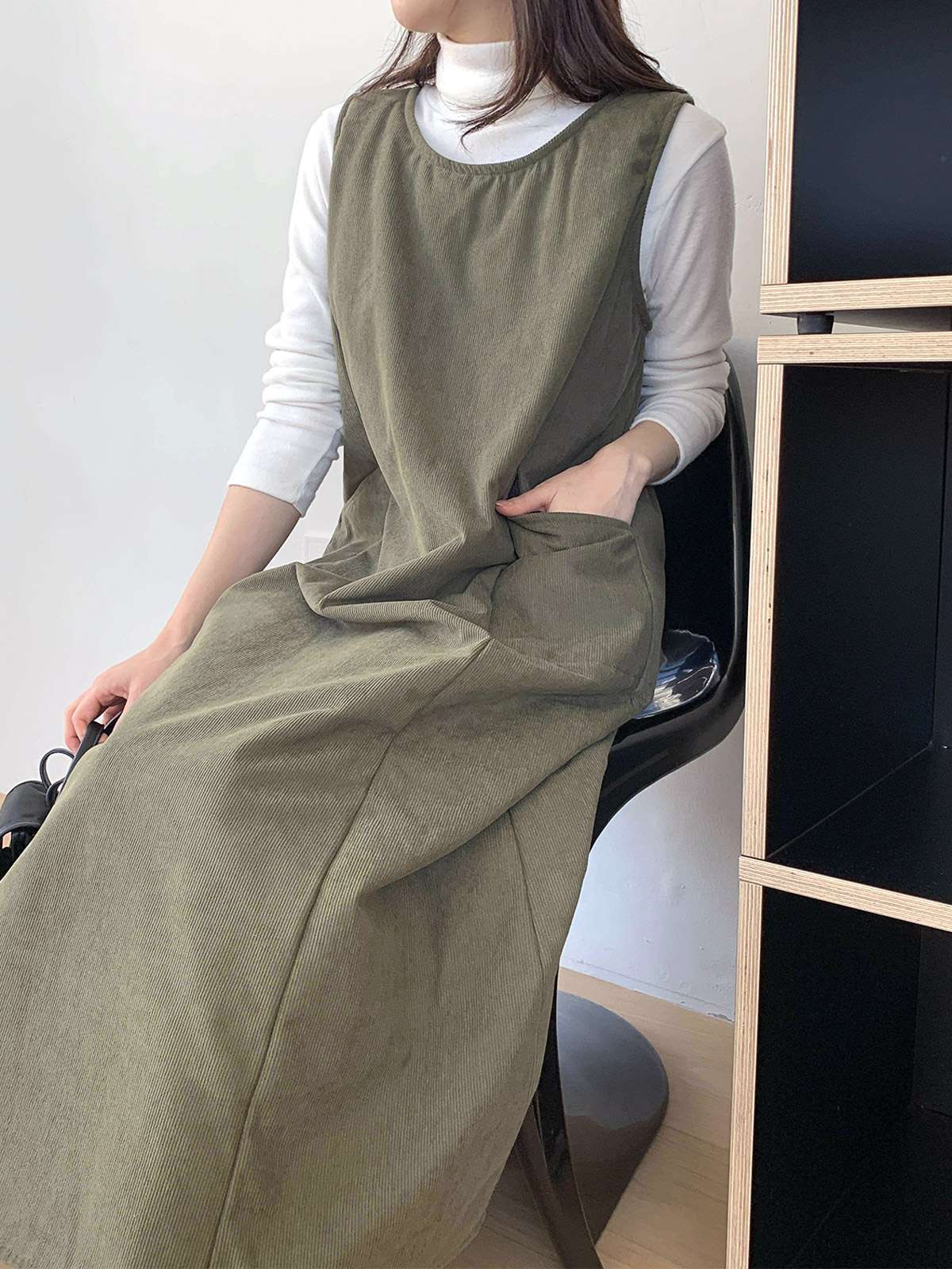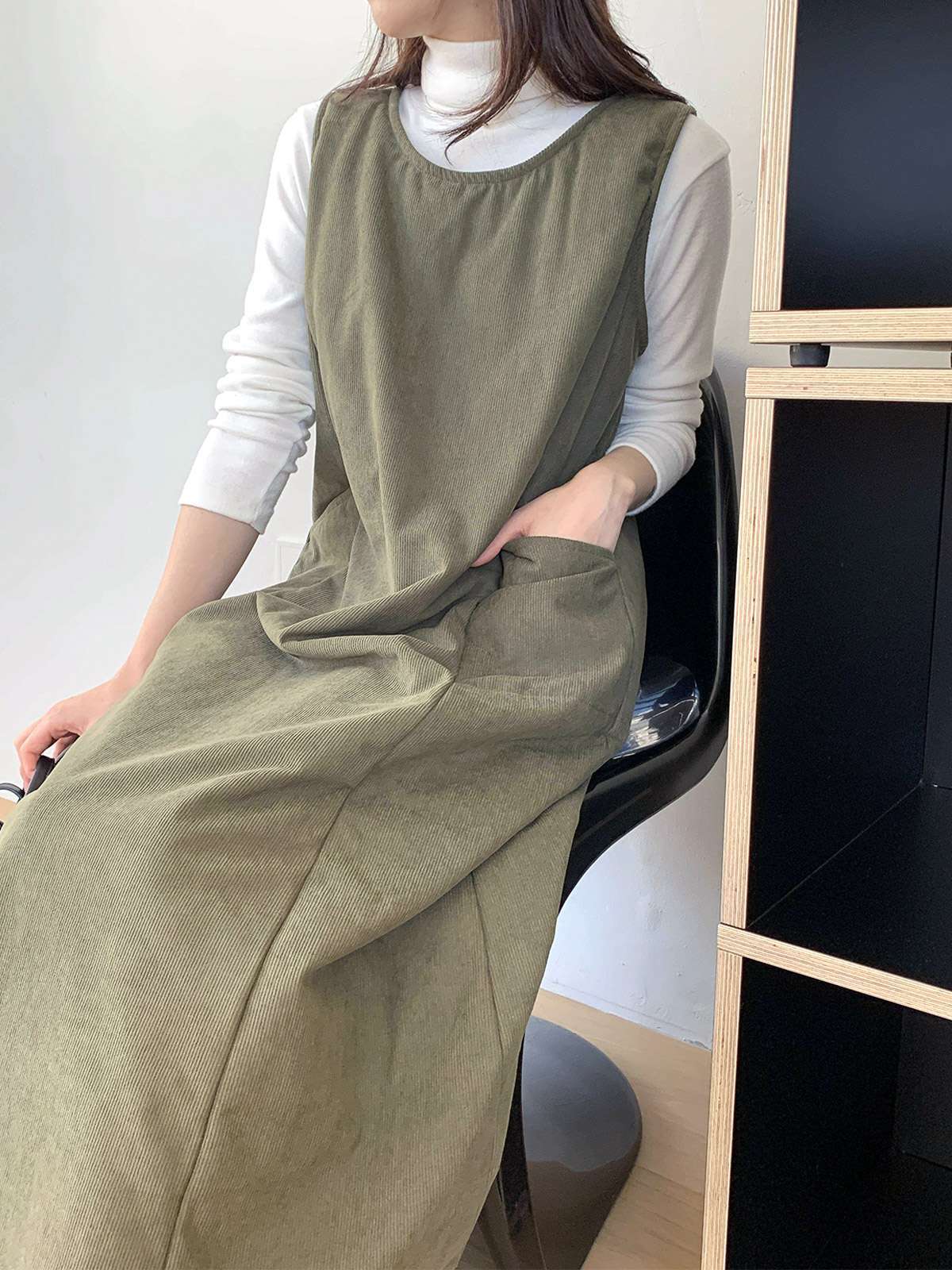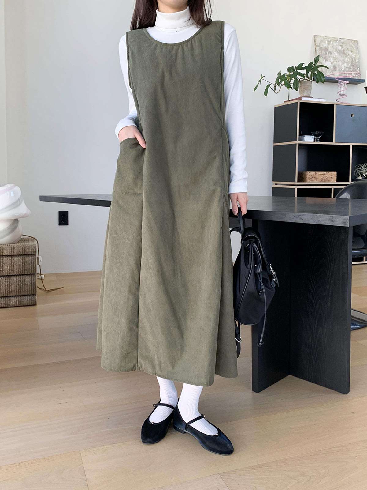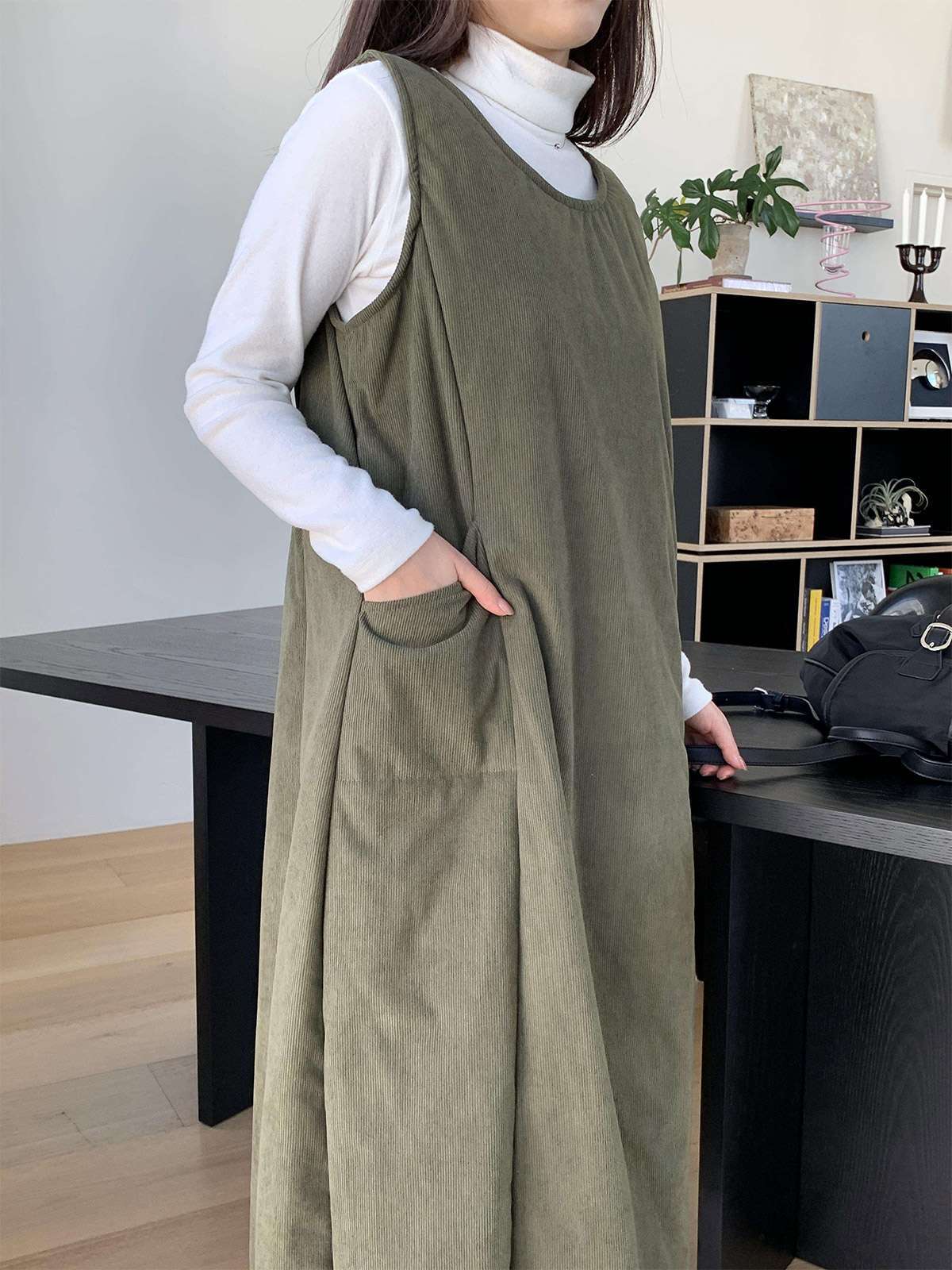 따뜻하고 부드러운 골덴 소재에 누빔 안감을 더해 포근하게 착용하기 좋은 민소매 롱 원피스