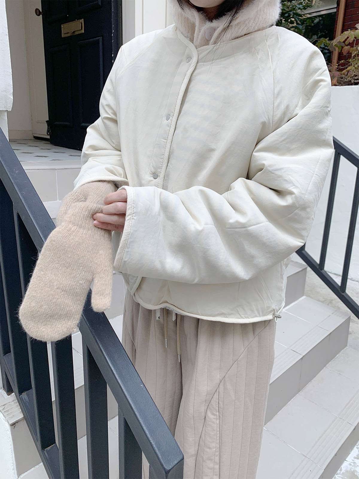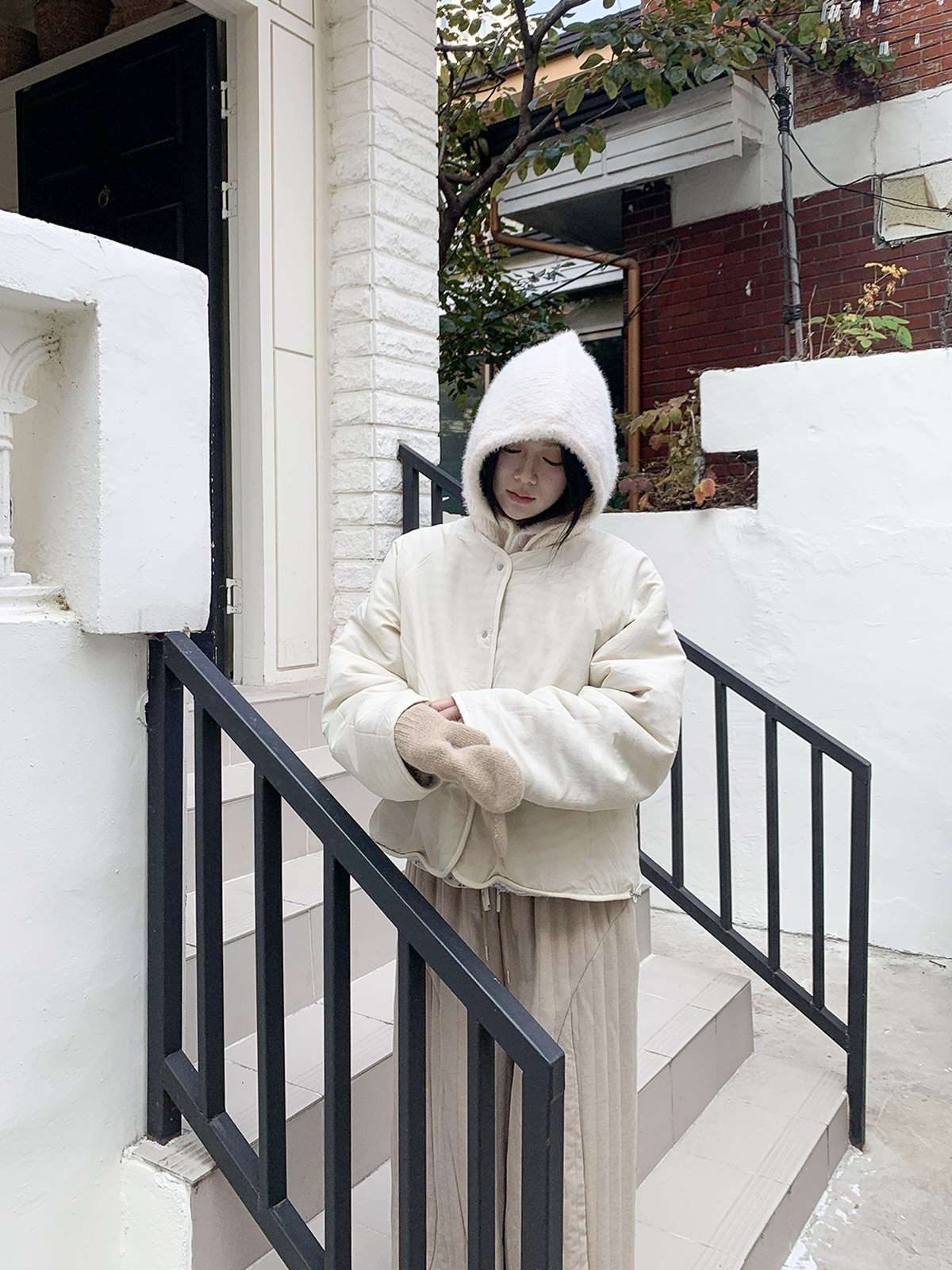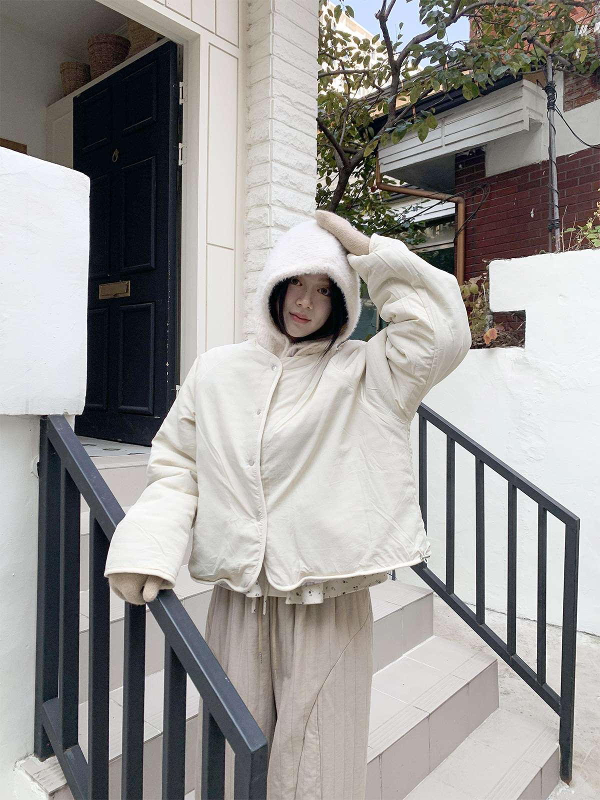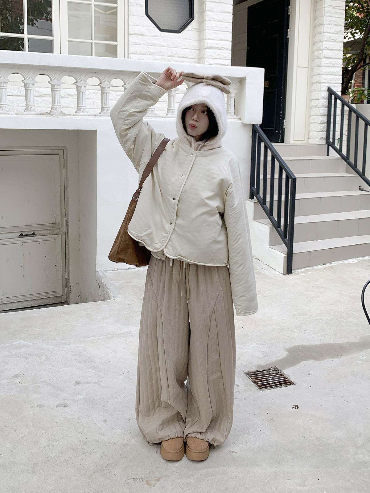 따뜻한 뽀글이 소재로 캐주얼한 포인트를 주며,
