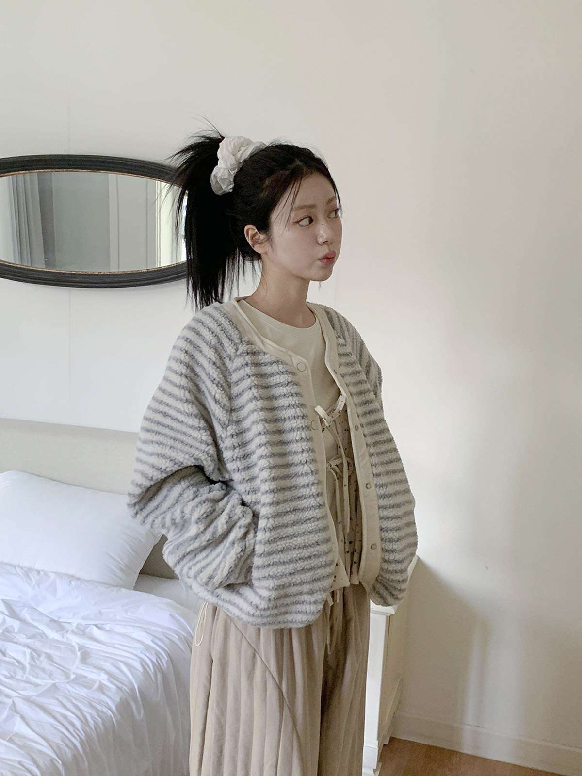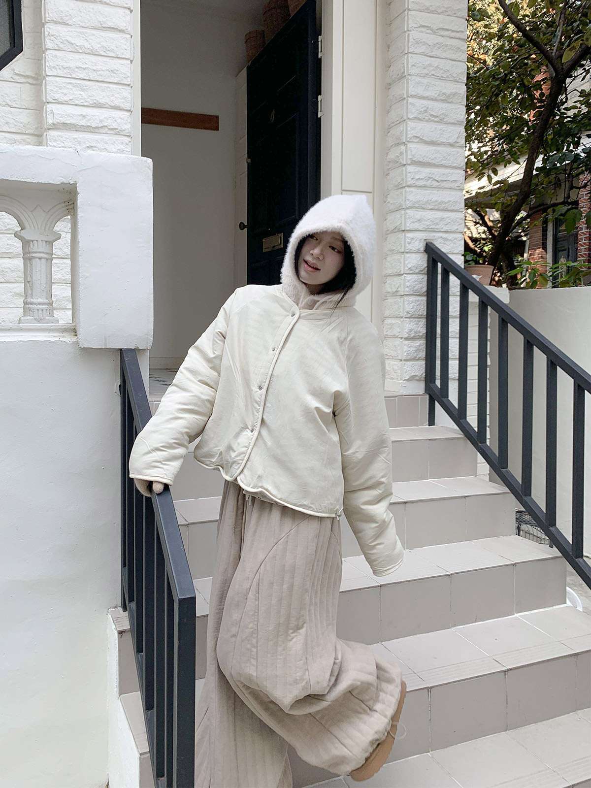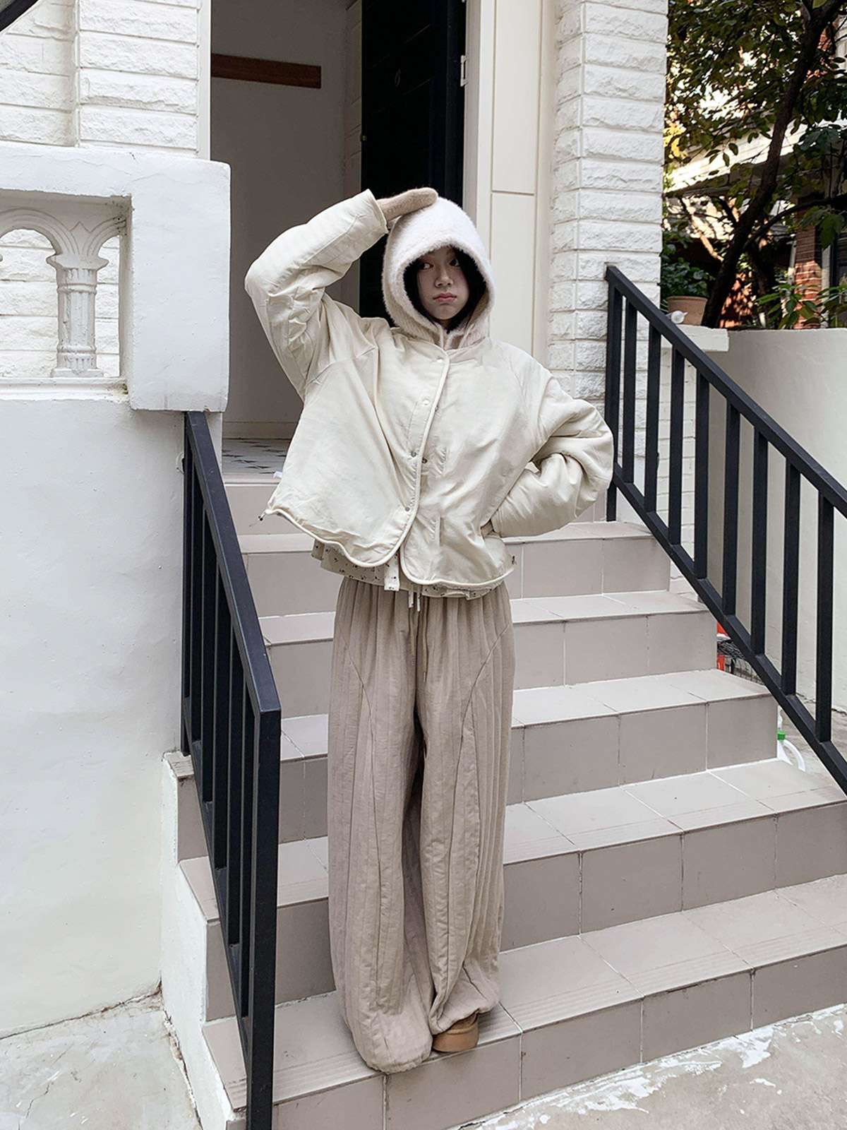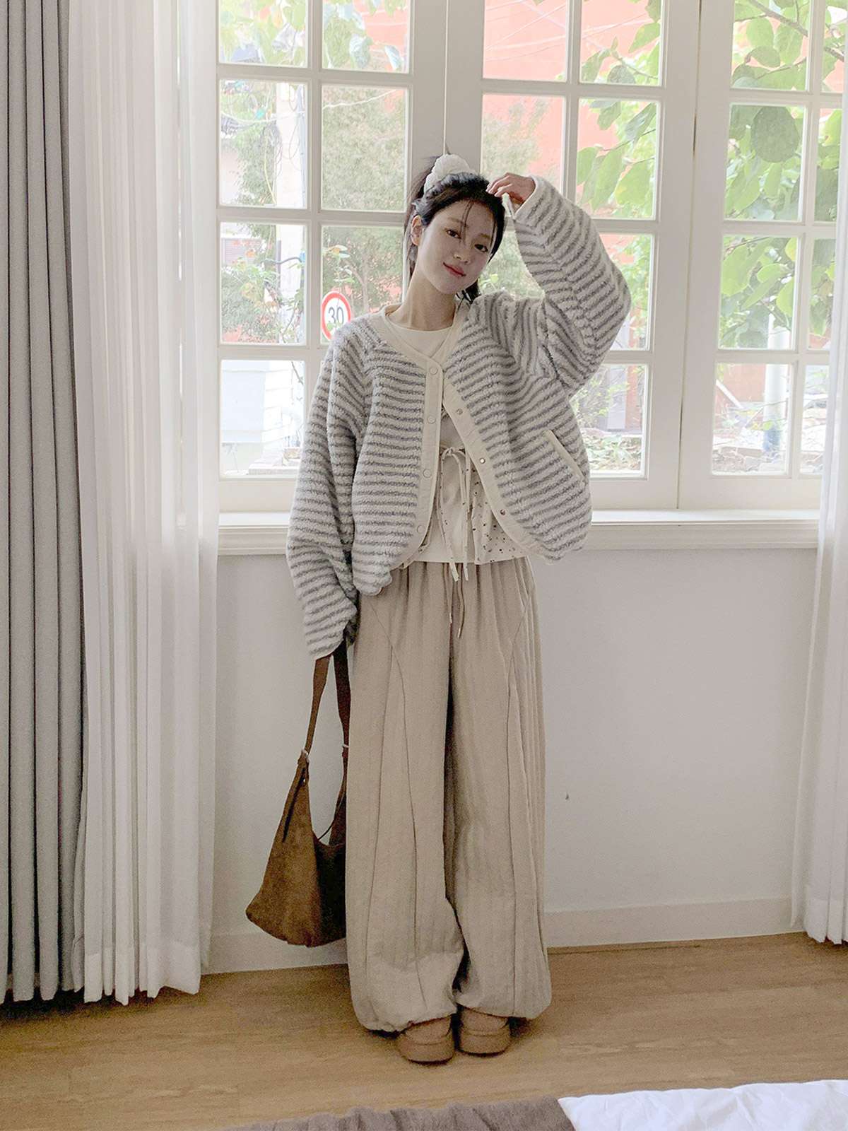 따뜻한 뽀글이 소재로 캐주얼한 포인트를 주며,