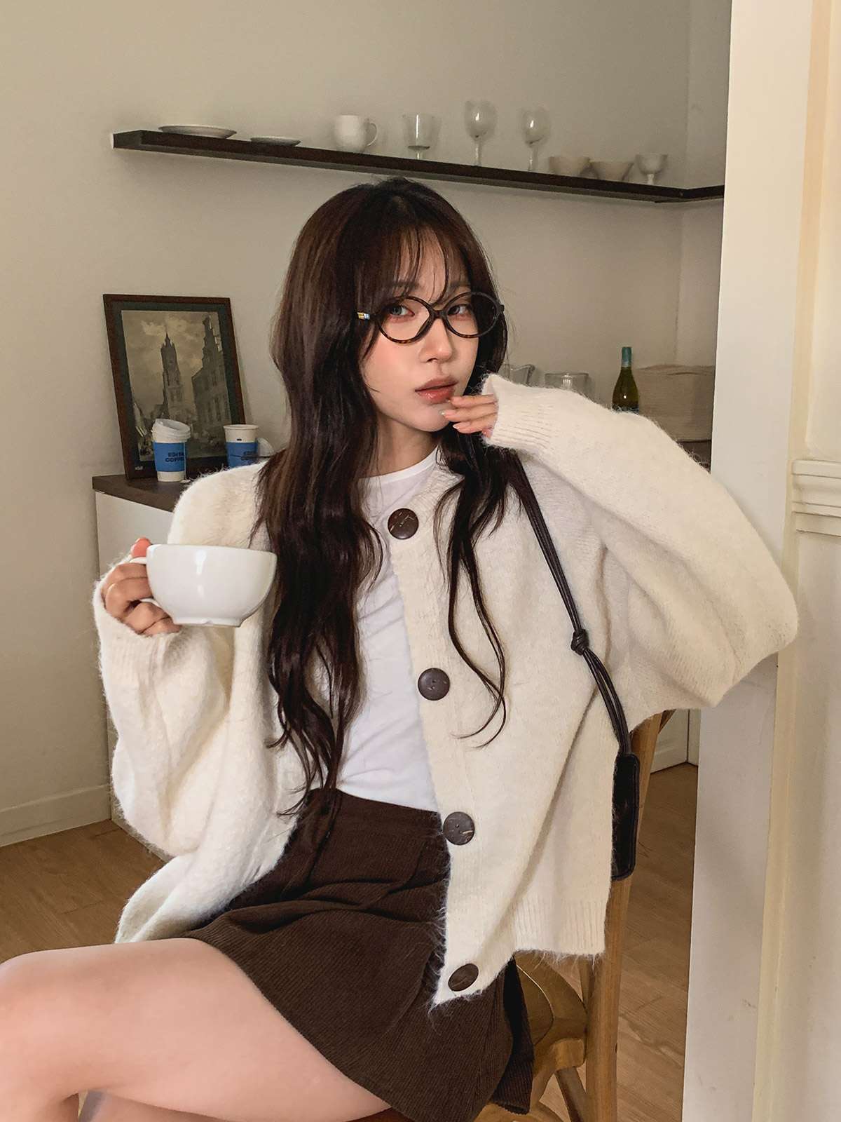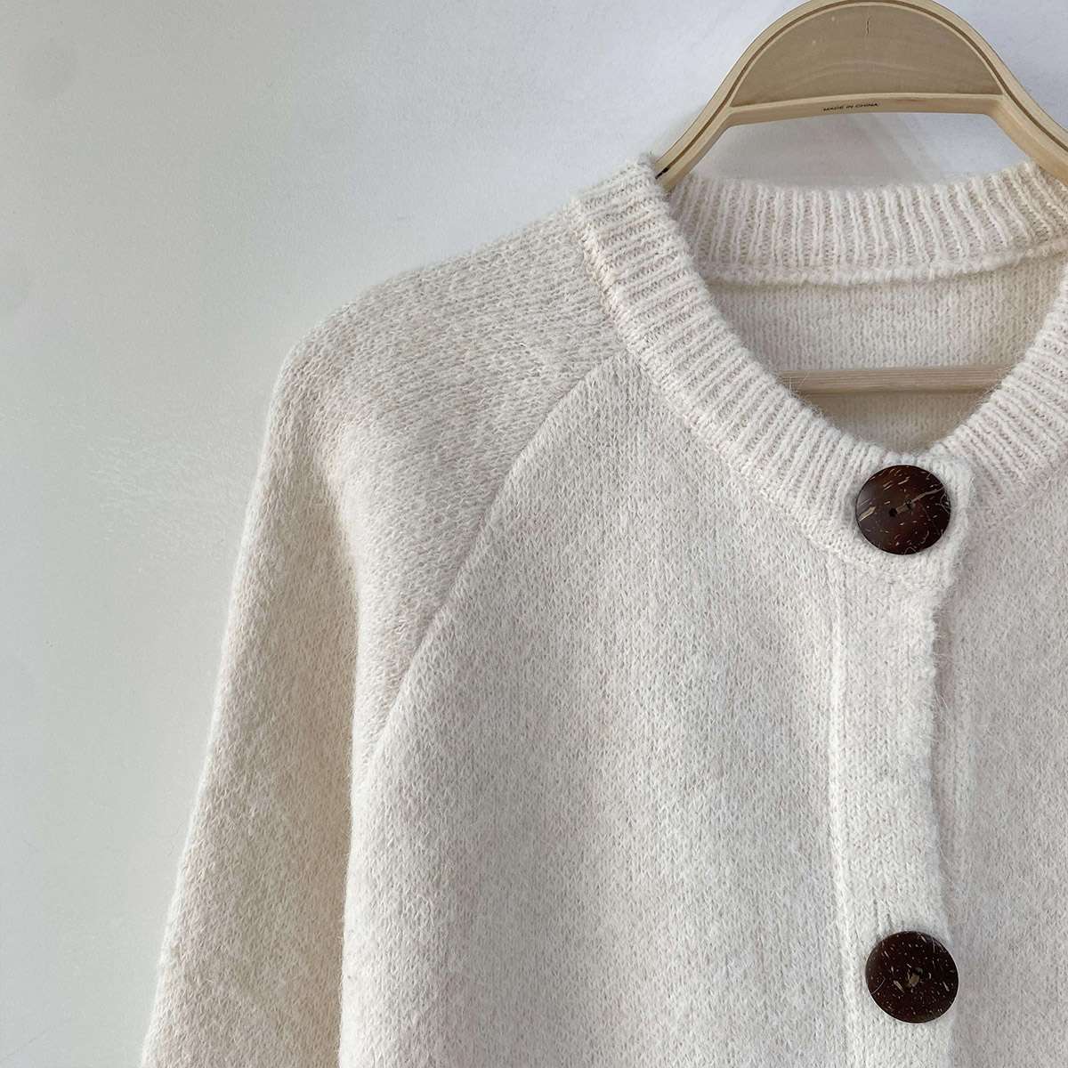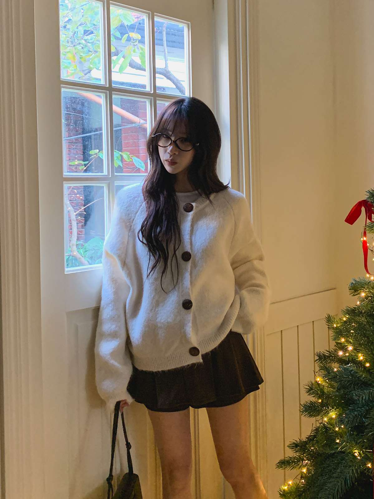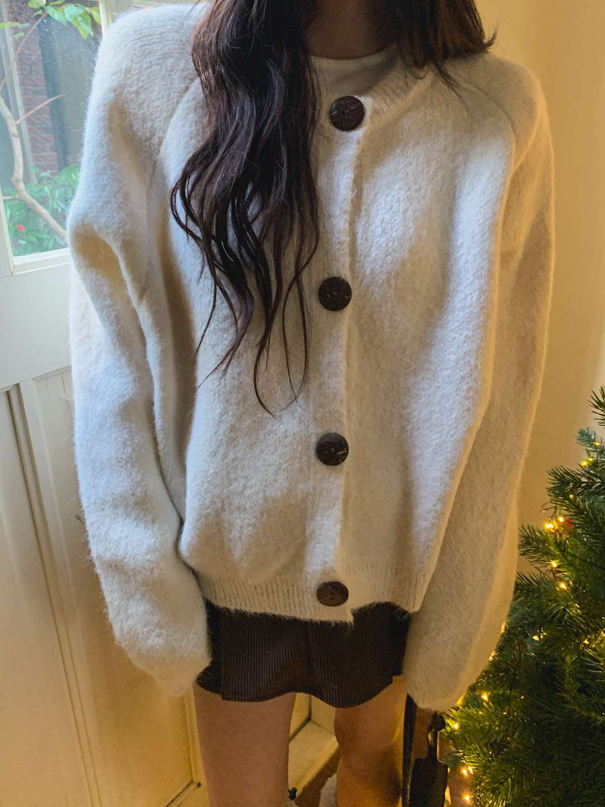 울 혼방 니트 소재의 부드럽고 따듯한 아방핏 라운드넥 가디건