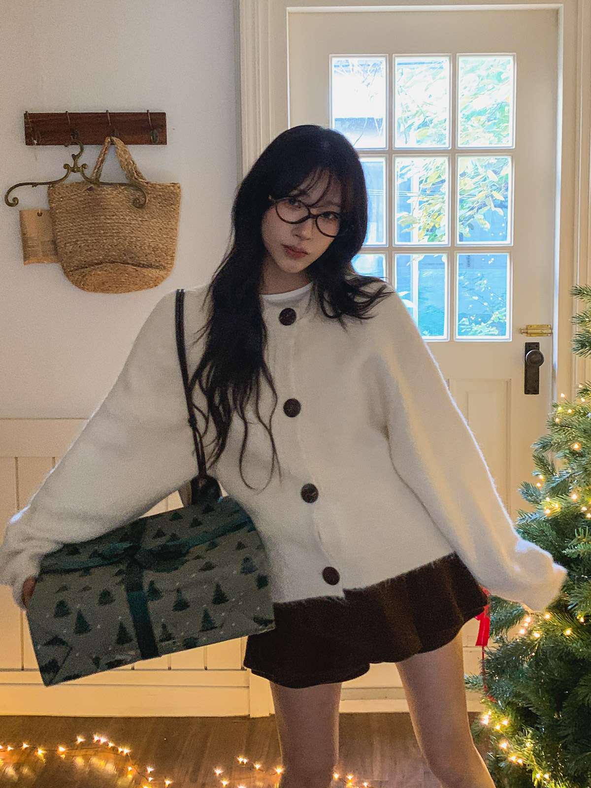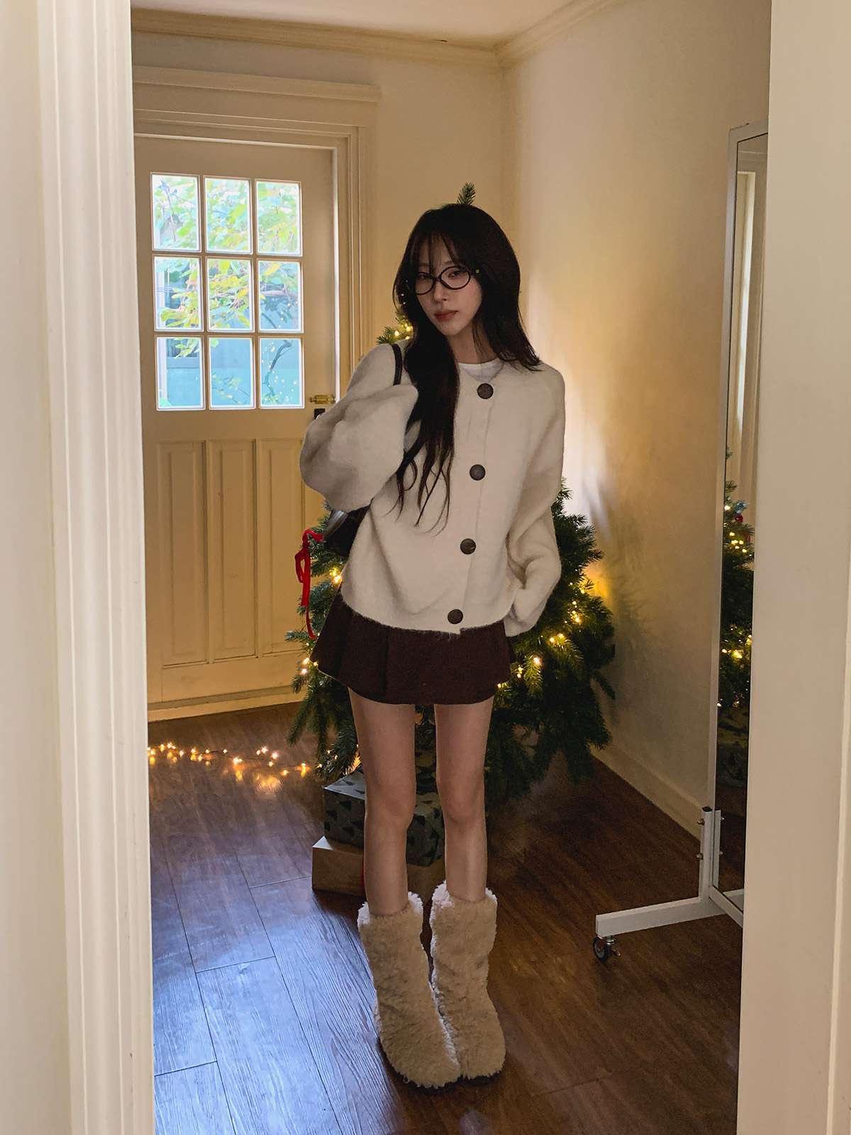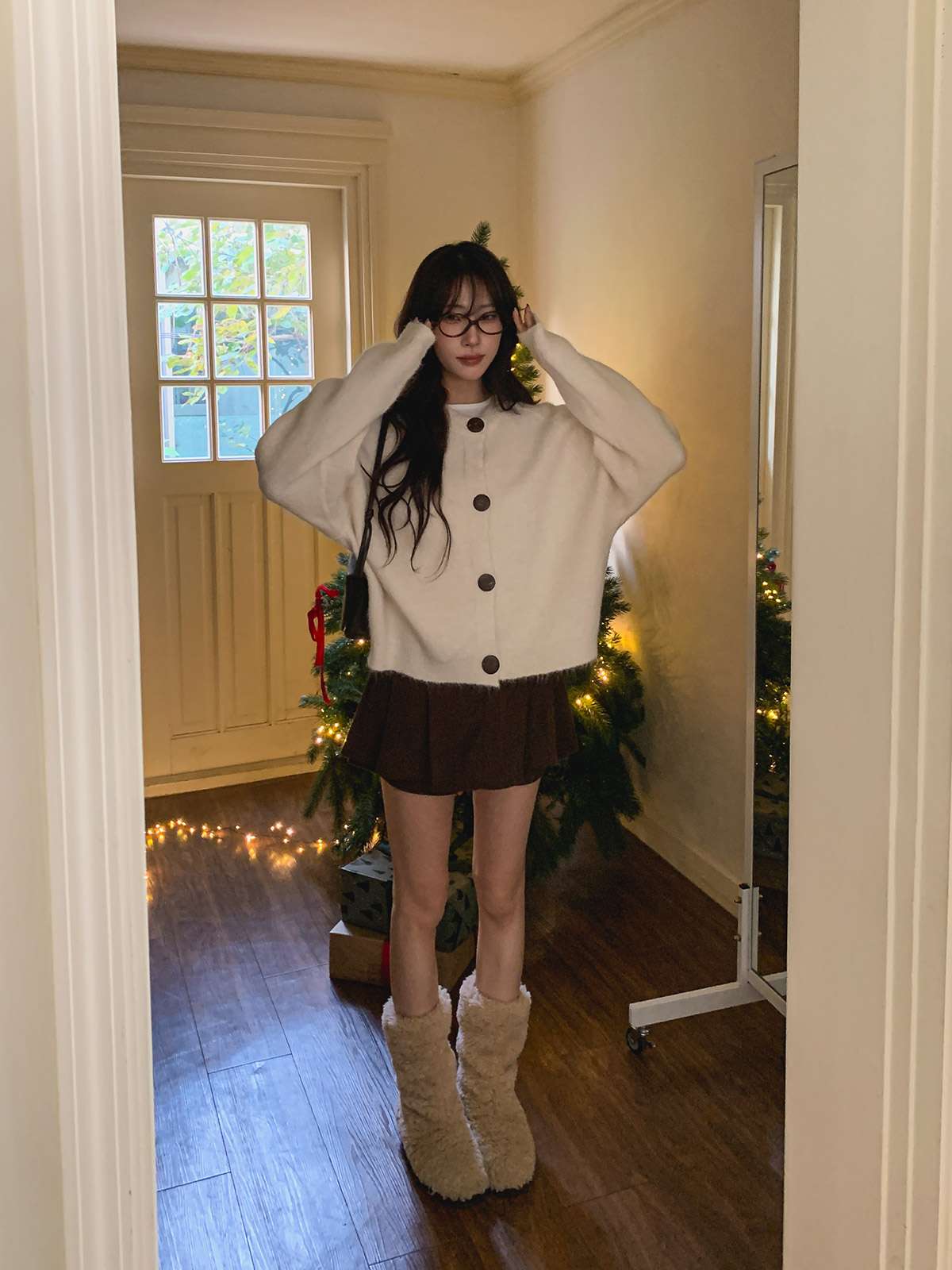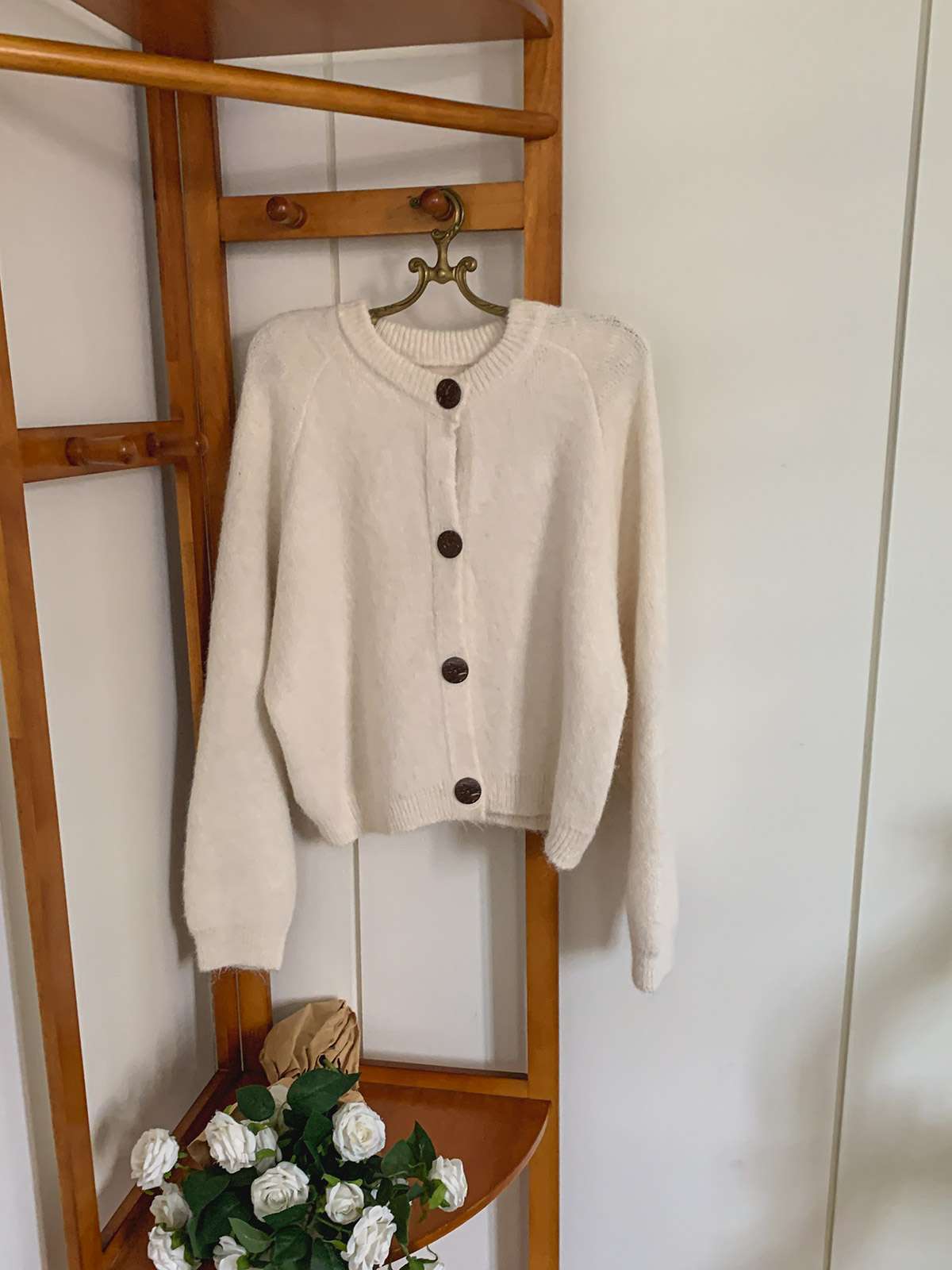 울 혼방 니트 소재의 부드럽고 따듯한 아방핏 라운드넥 가디건