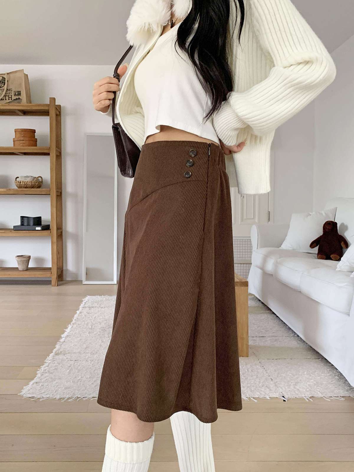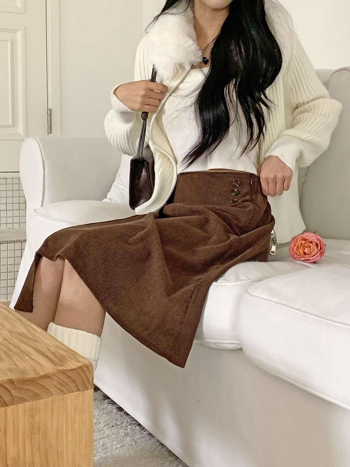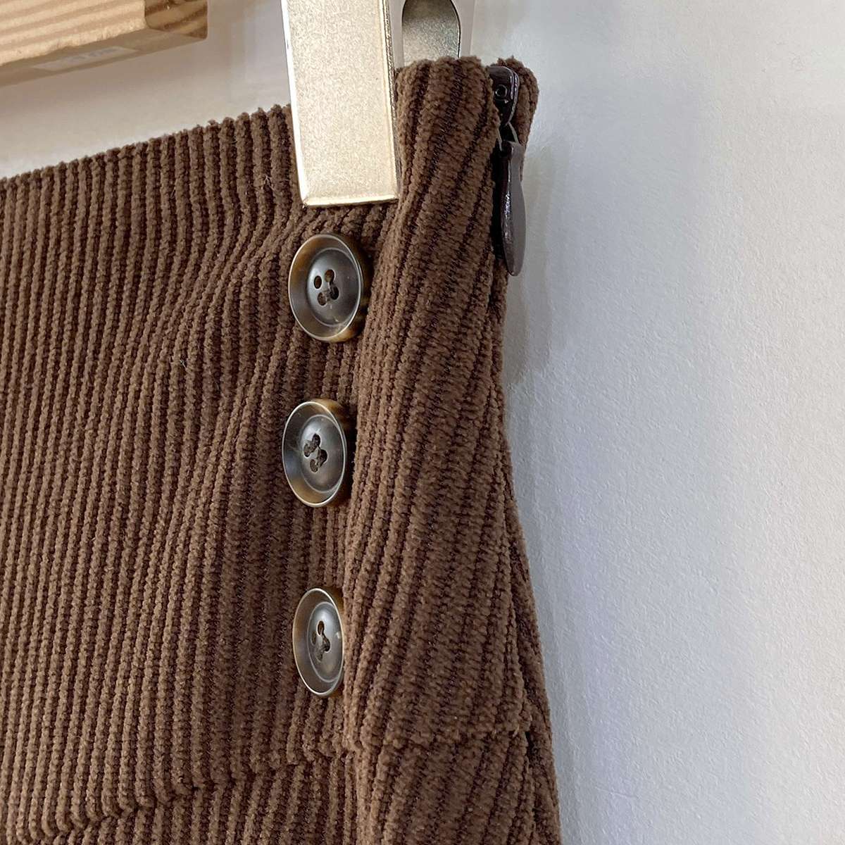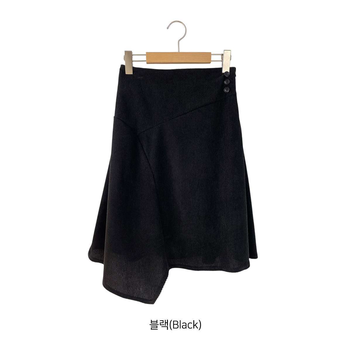 따뜻하고 포근한 코듀로이 소재로 언발 디테일과 버튼 포인트가 더해진 미디 스커트