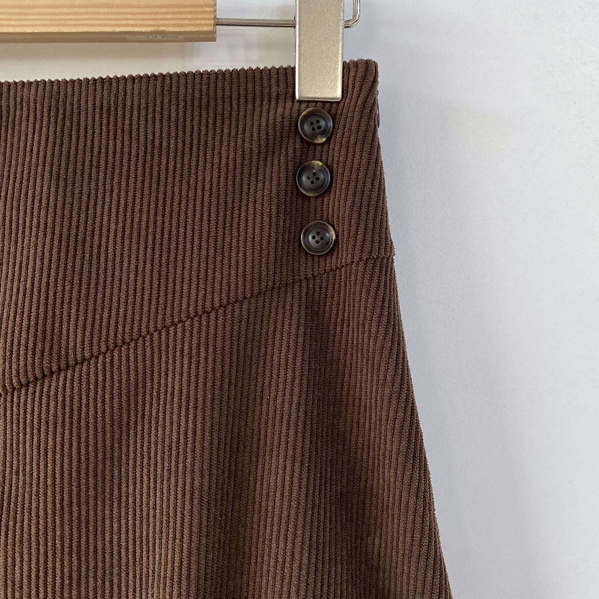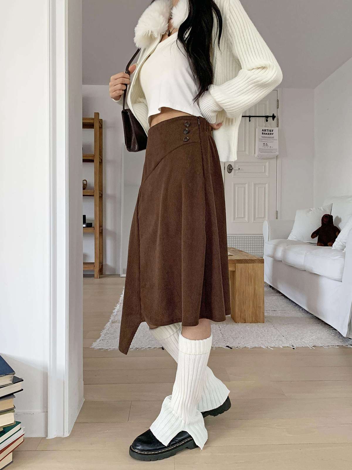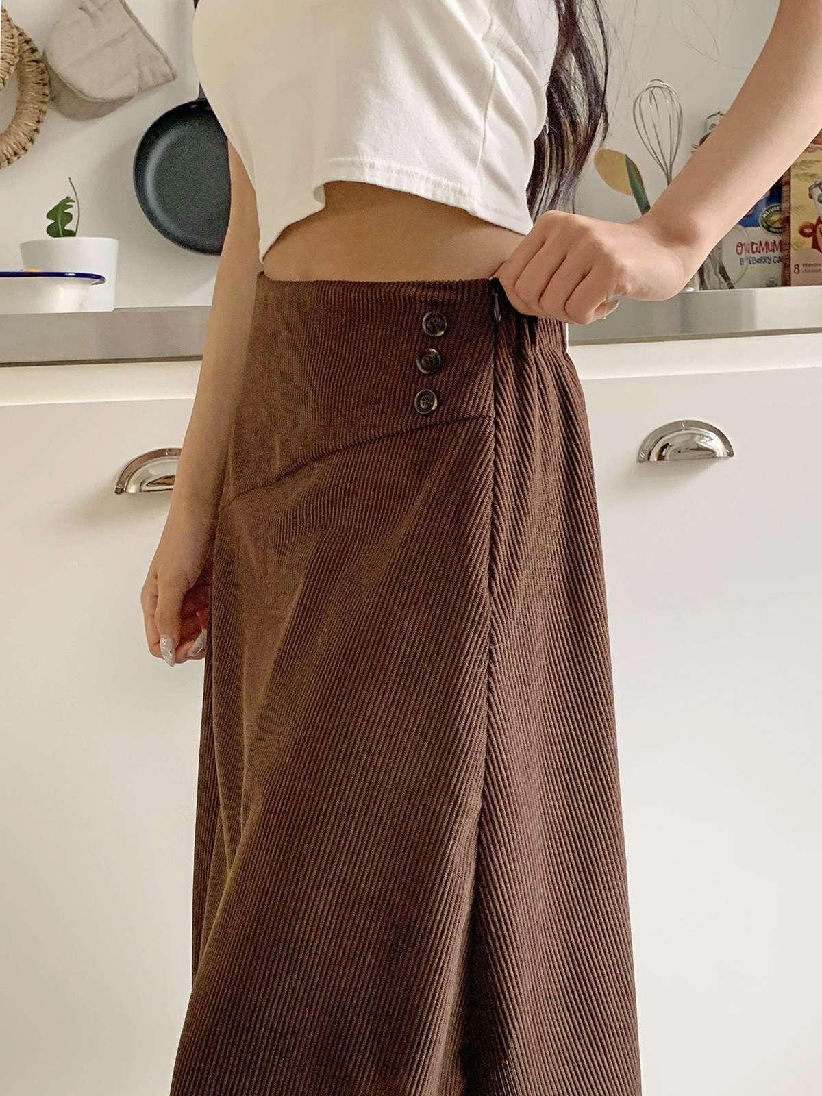 따뜻하고 포근한 코듀로이 소재로 언발 디테일과 버튼 포인트가 더해진 미디 스커트