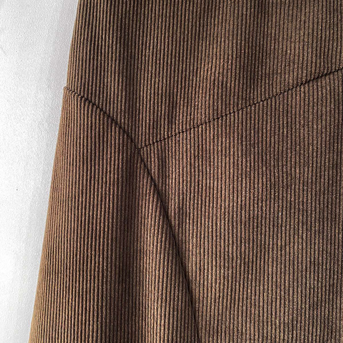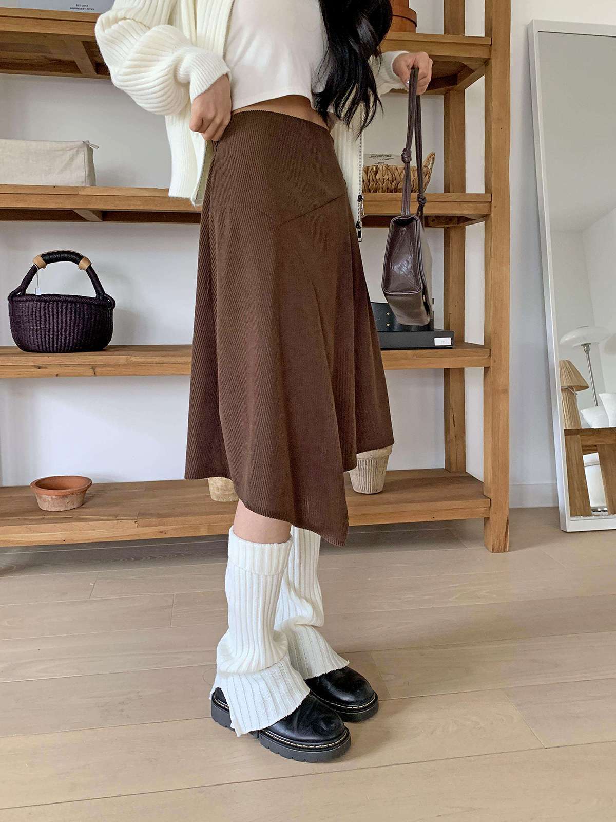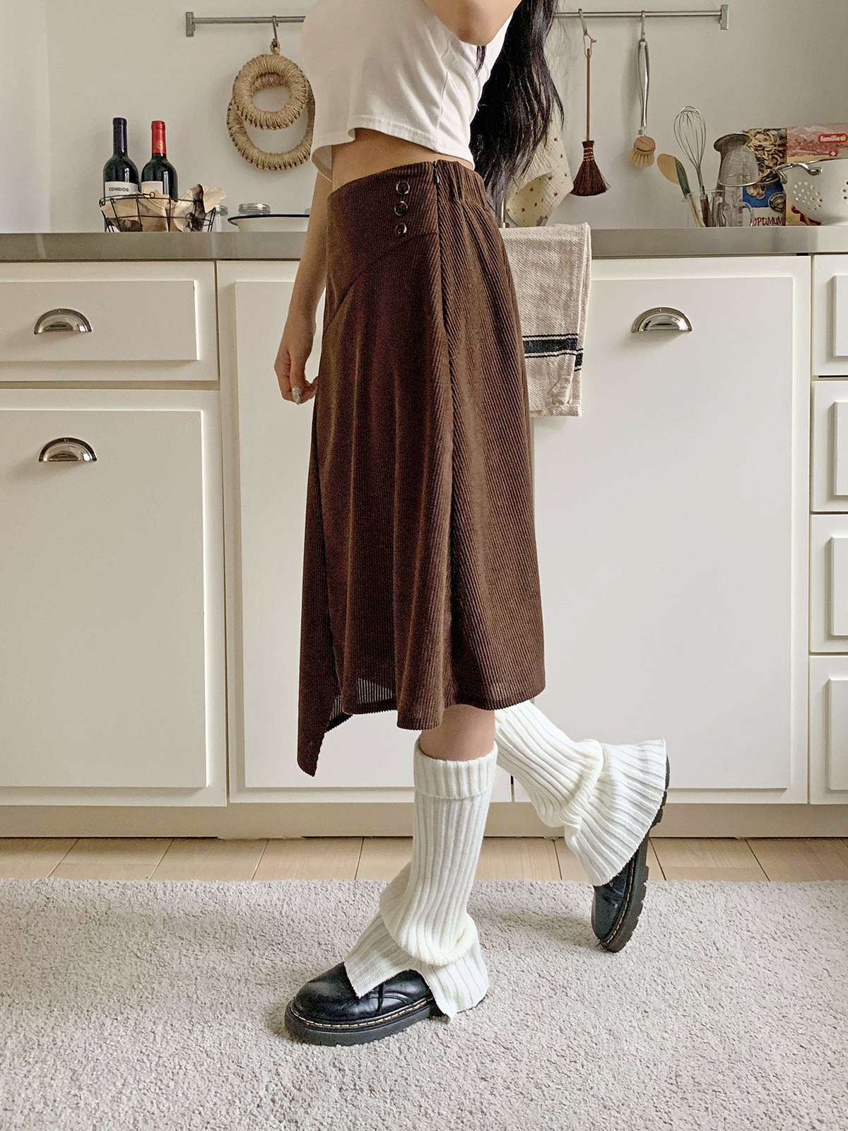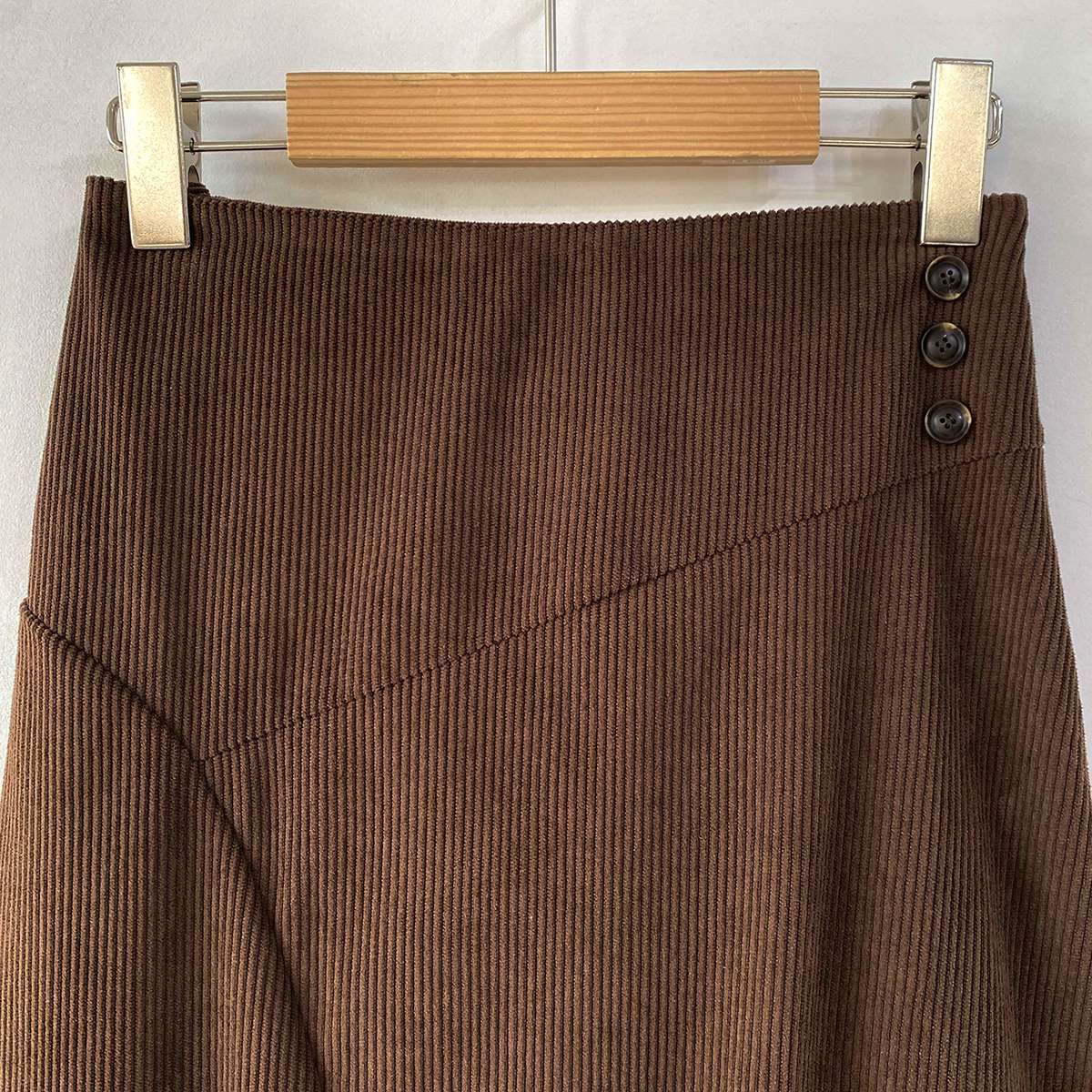 따뜻하고 포근한 코듀로이 소재로 언발 디테일과 버튼 포인트가 더해진 미디 스커트