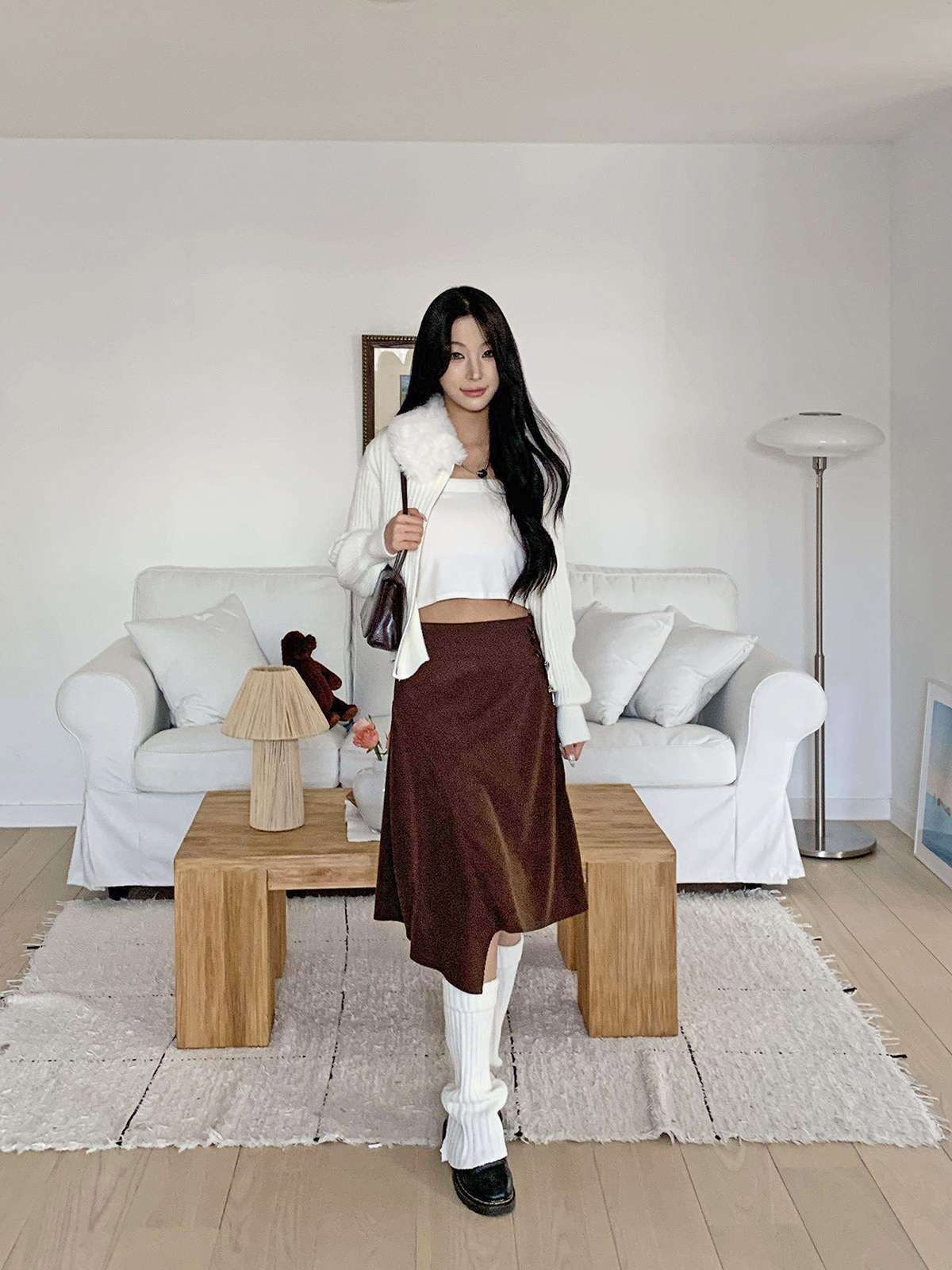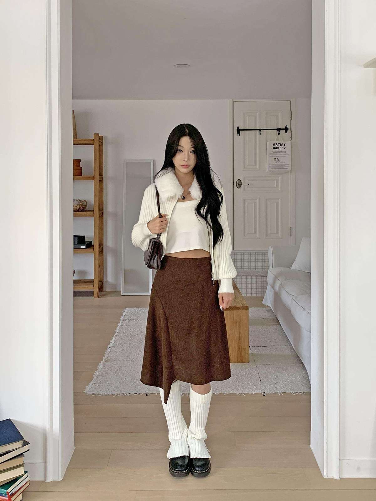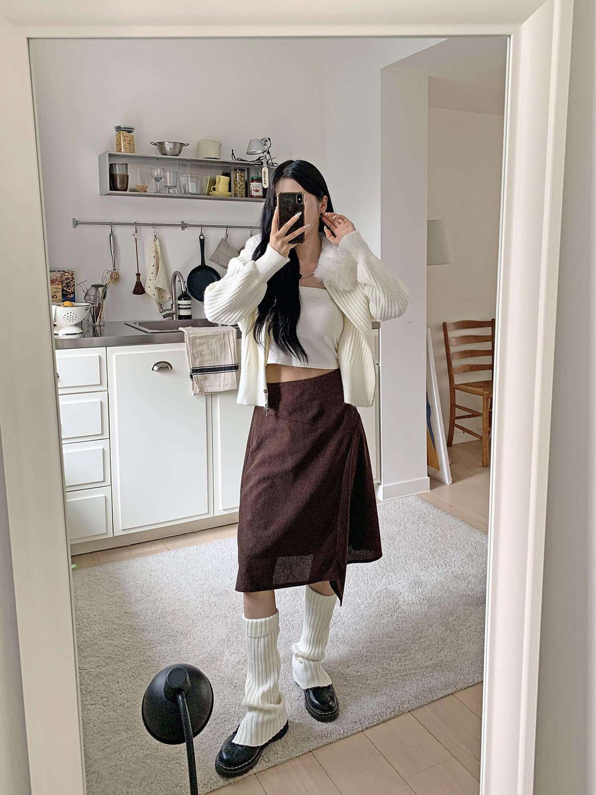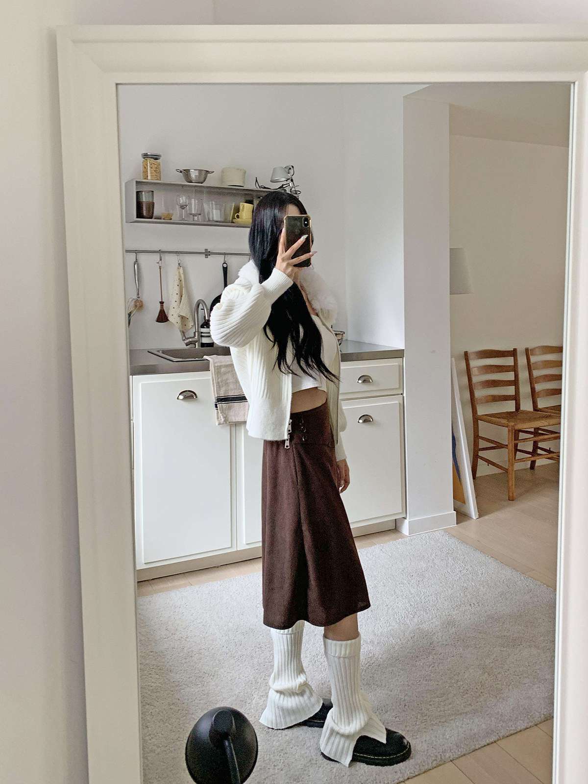따뜻한 무드를 동시에 느낄 수 있는 미디 스커트로