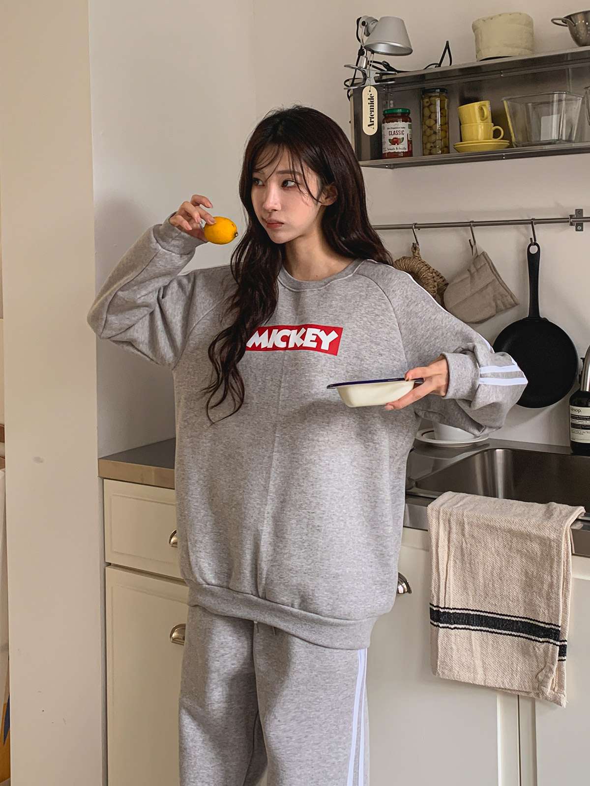 양기모 소재로 제작된 미키 프린팅 맨투맨과 트레이닝 팬츠 세트