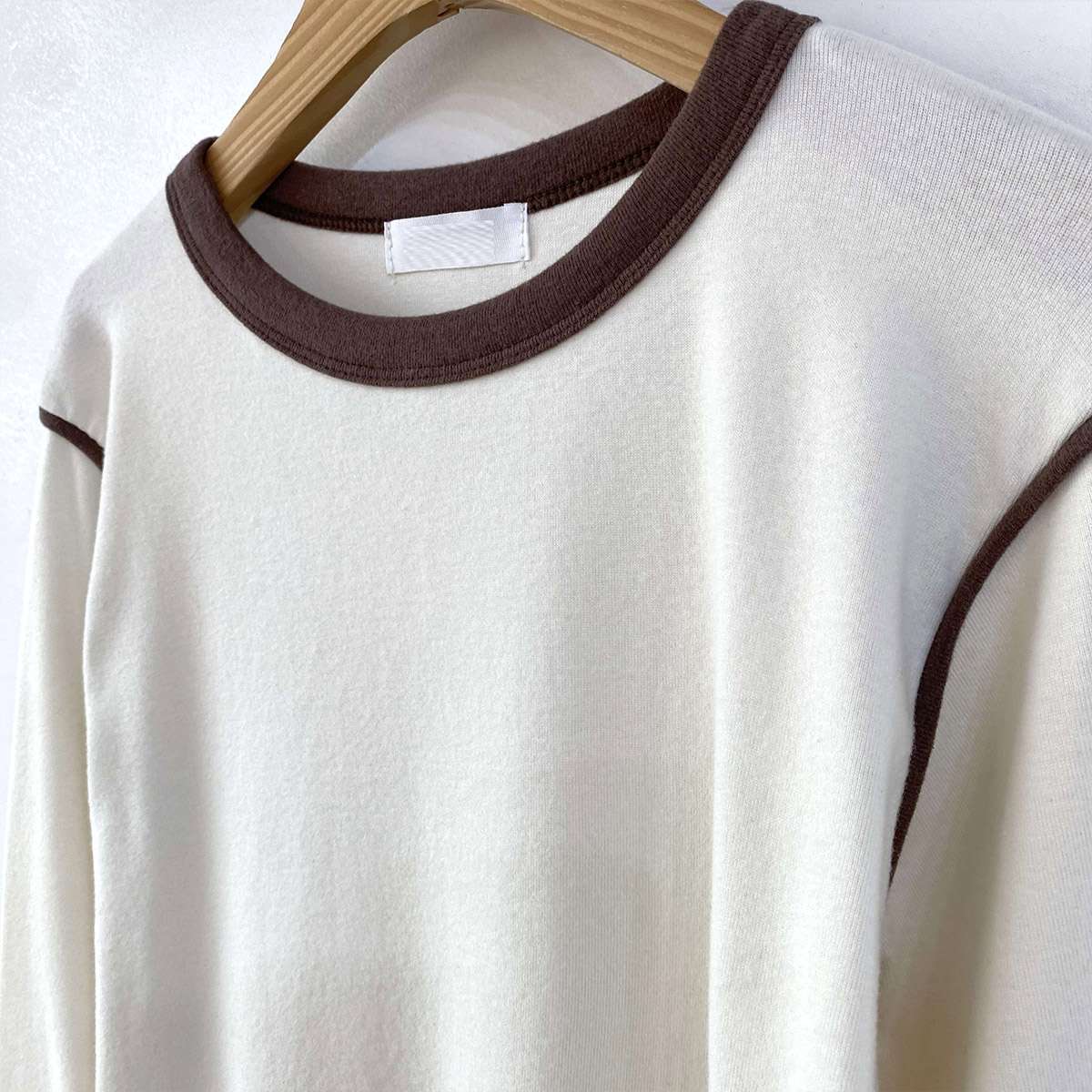 포근한 피치기모 소재로 제작되어 따뜻하게 착용하기 좋은 모달 배색 긴팔 티셔츠