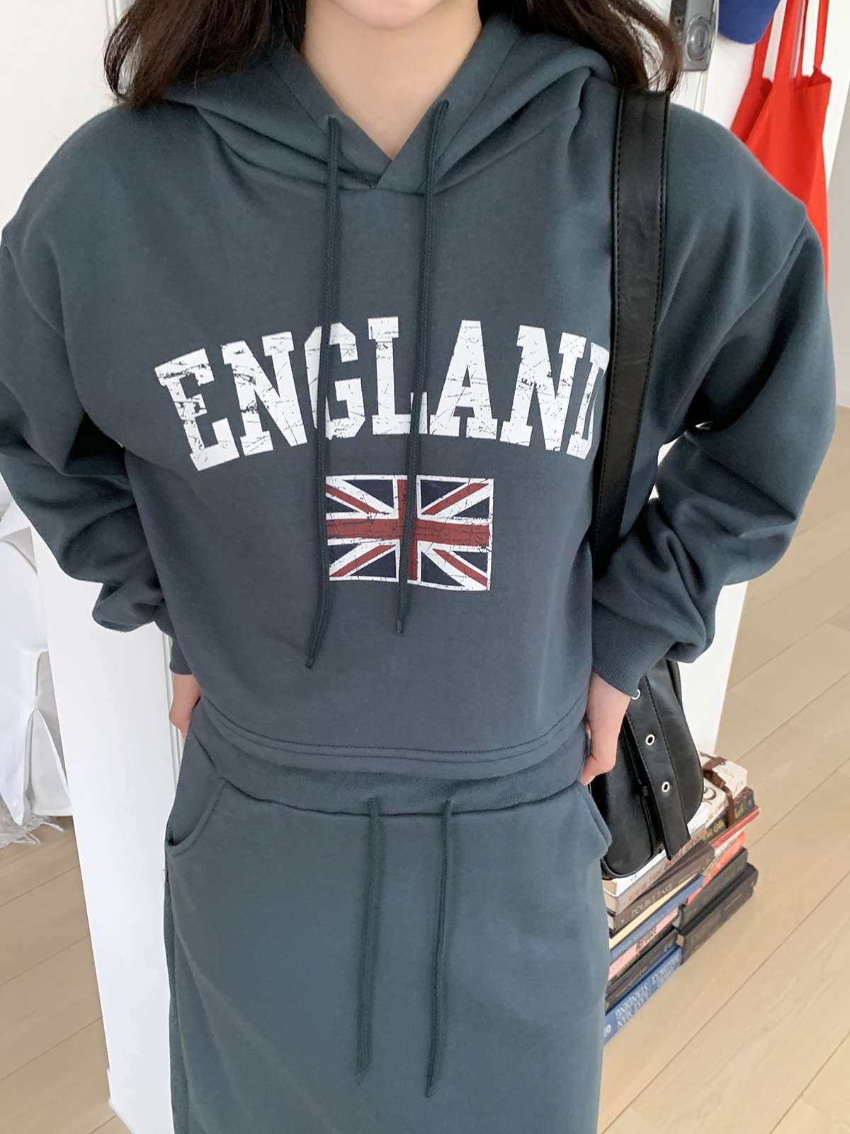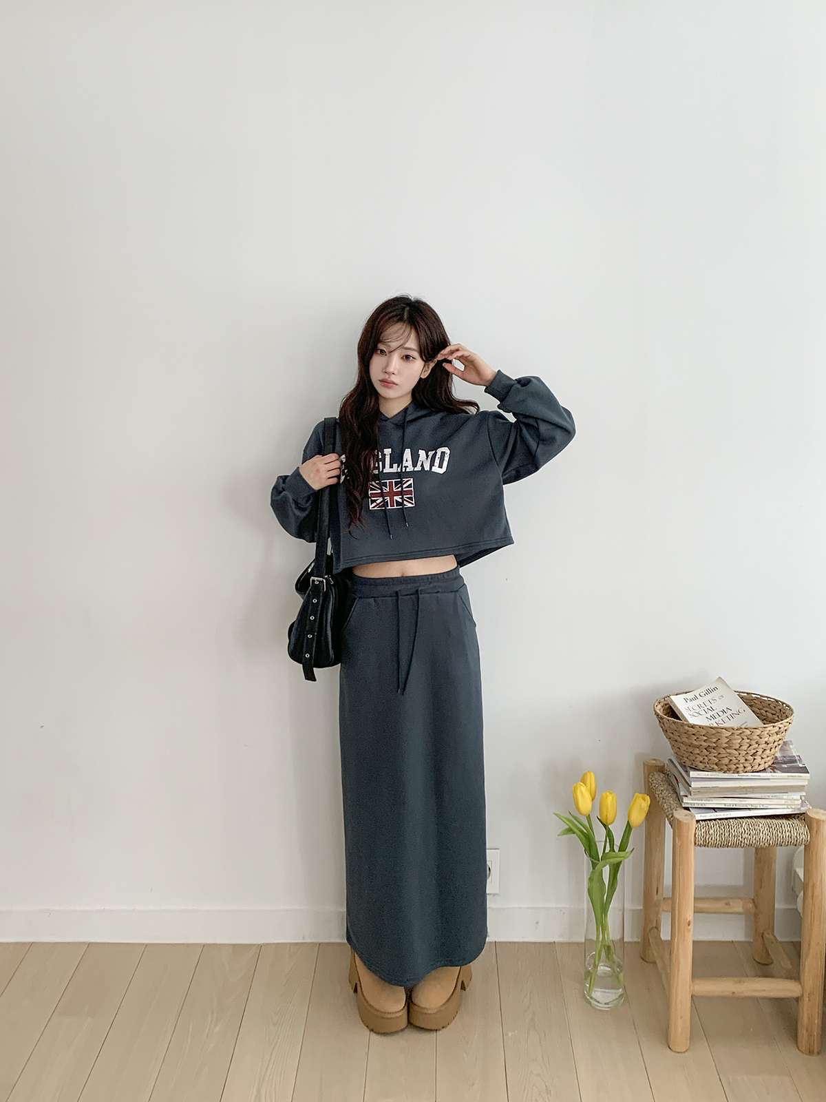 [ SET3882K5B-푸케이 프린팅 기모 크롭 후드 롱 스커트 세트 ]