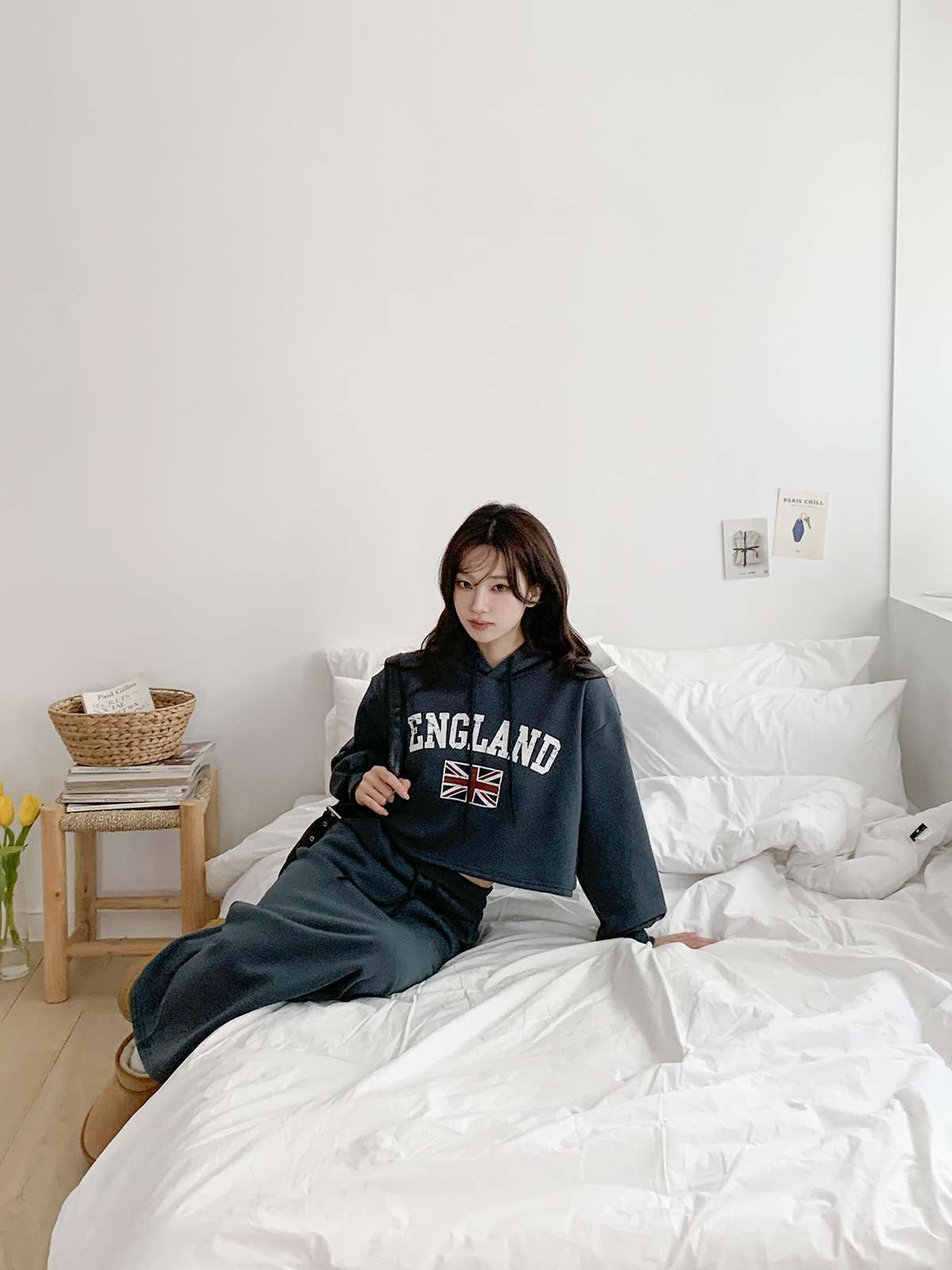 캐주얼한 무드의 기모 안감으로 제작된 후드 티셔츠와 스커트 세트
