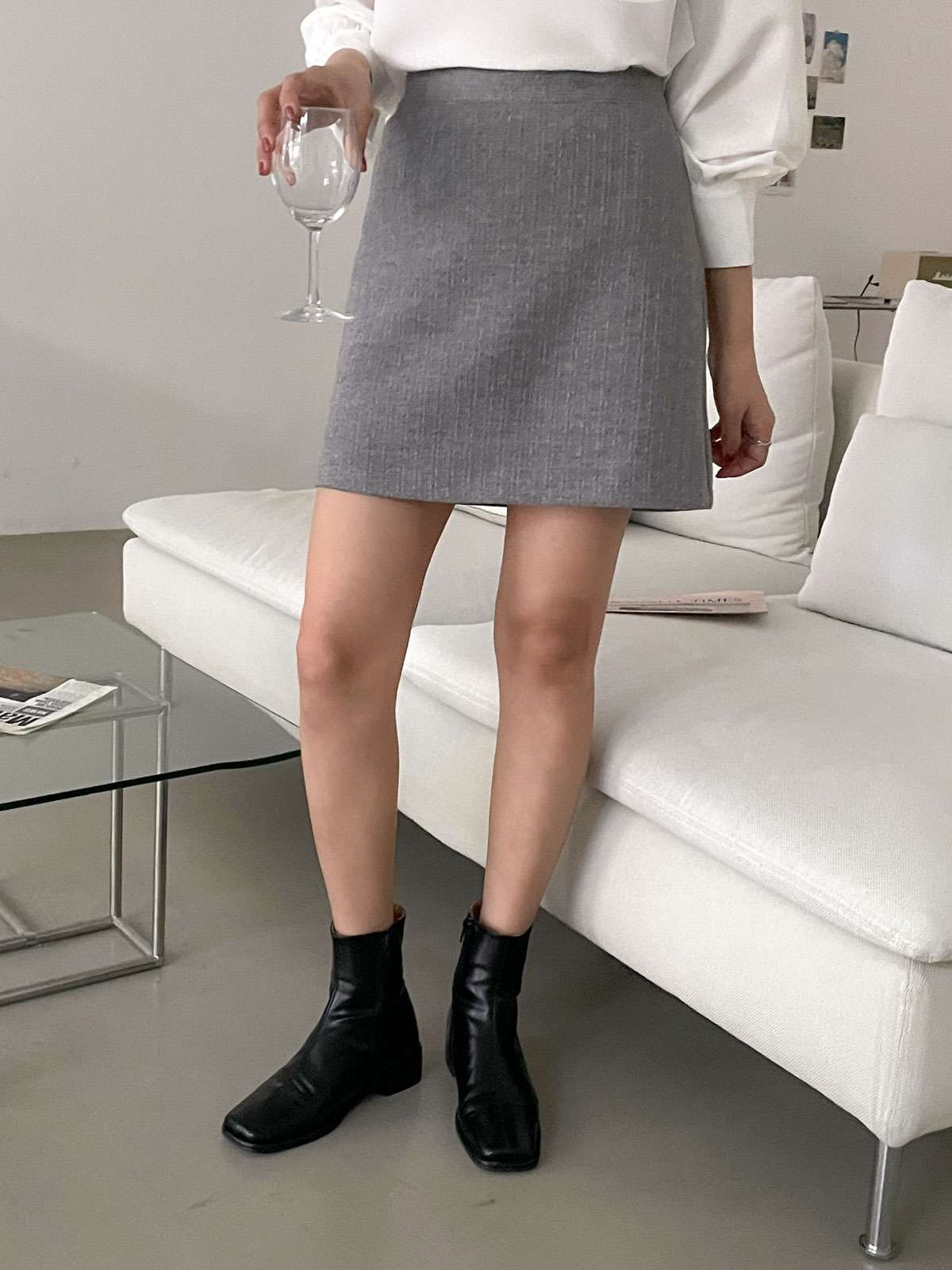부드러운 소재의 깔끔한 H라인 핏으로 떨어지는 미니 스커트
