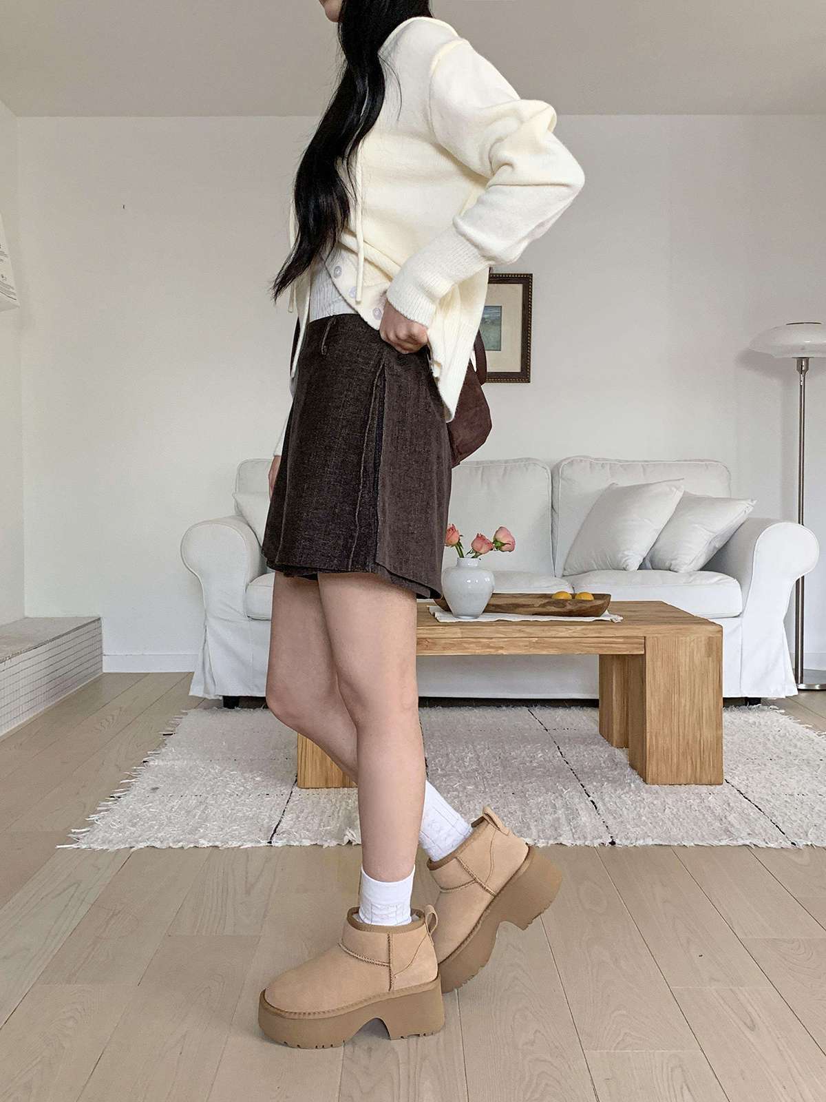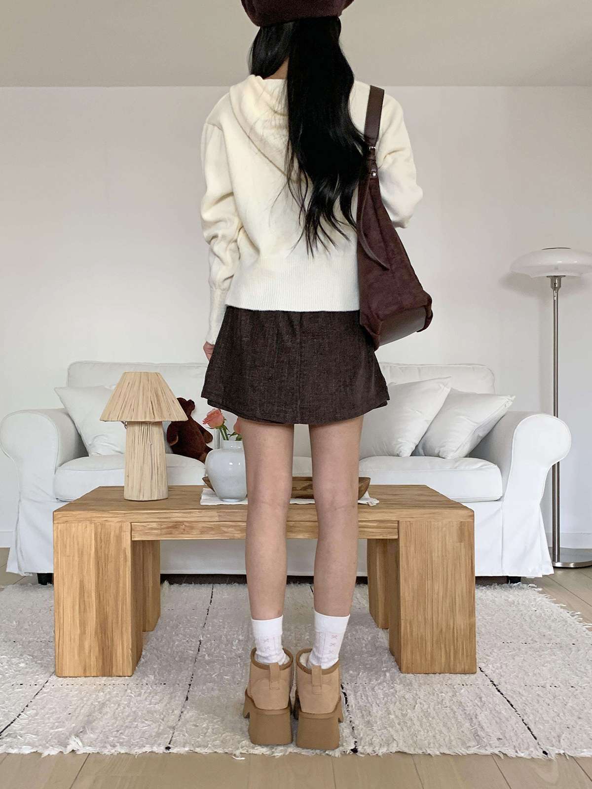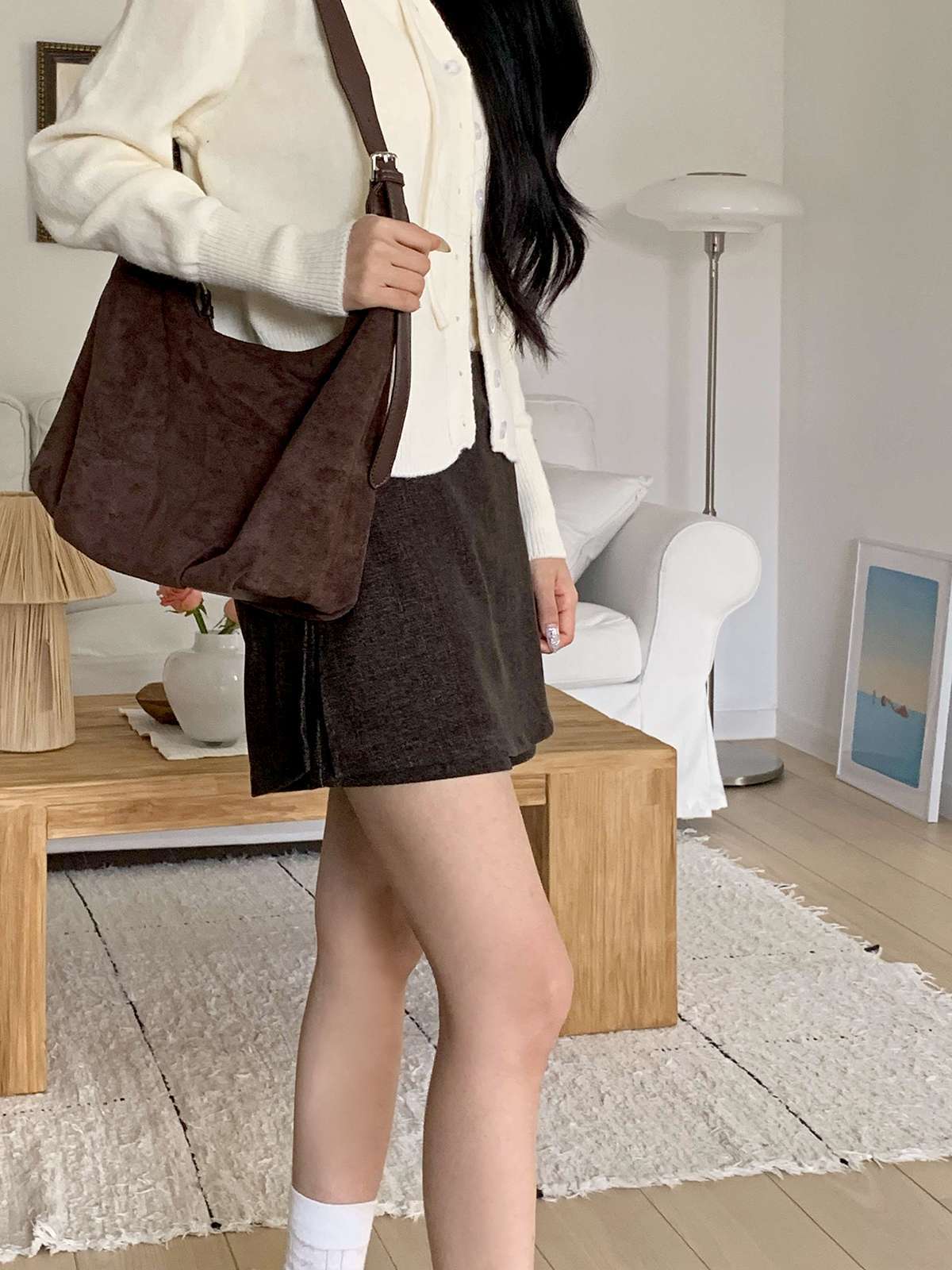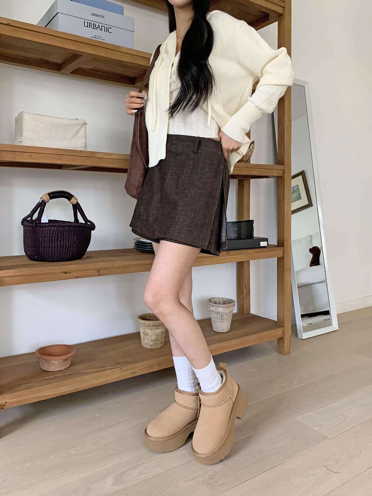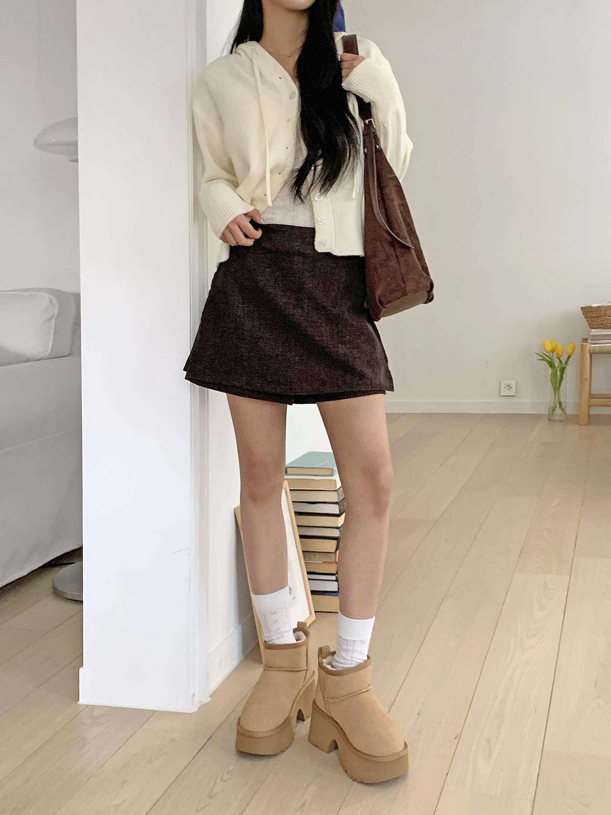 스웨이드 벨벳 느낌의 소재로 제작되어 따뜻하고 포근한 미니 랩 치마바지