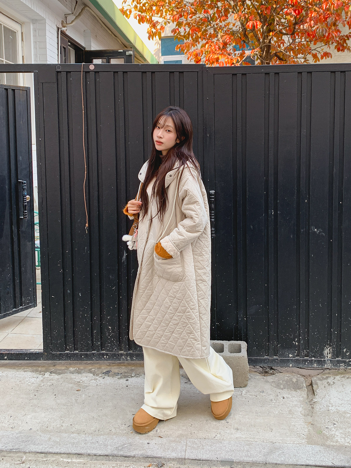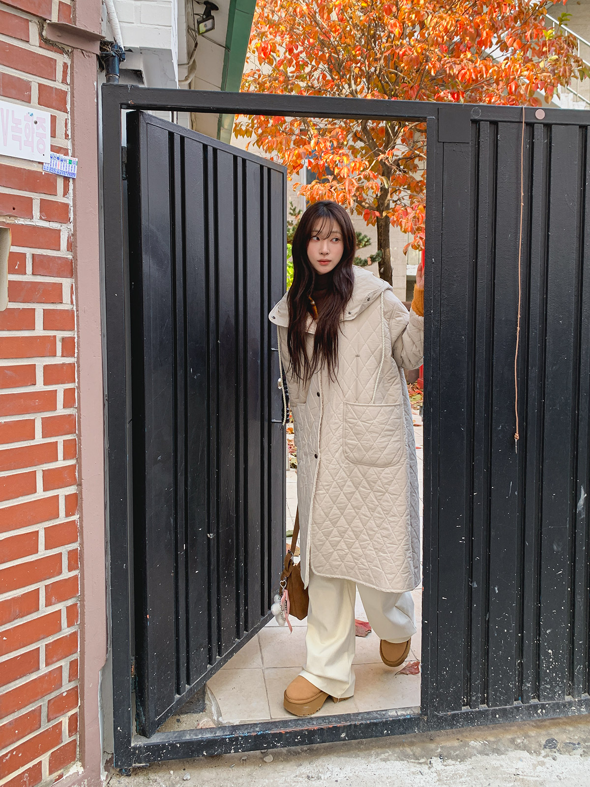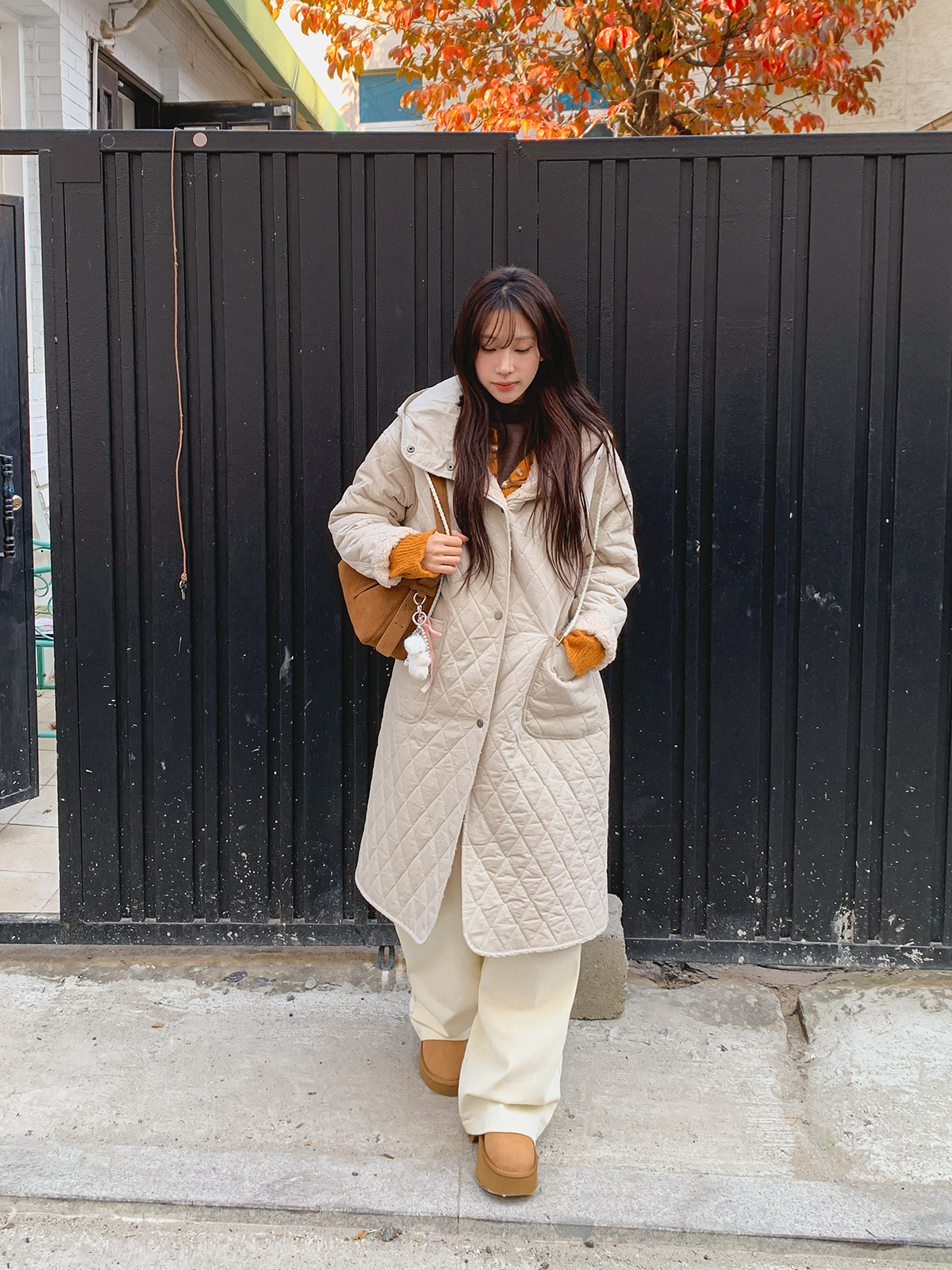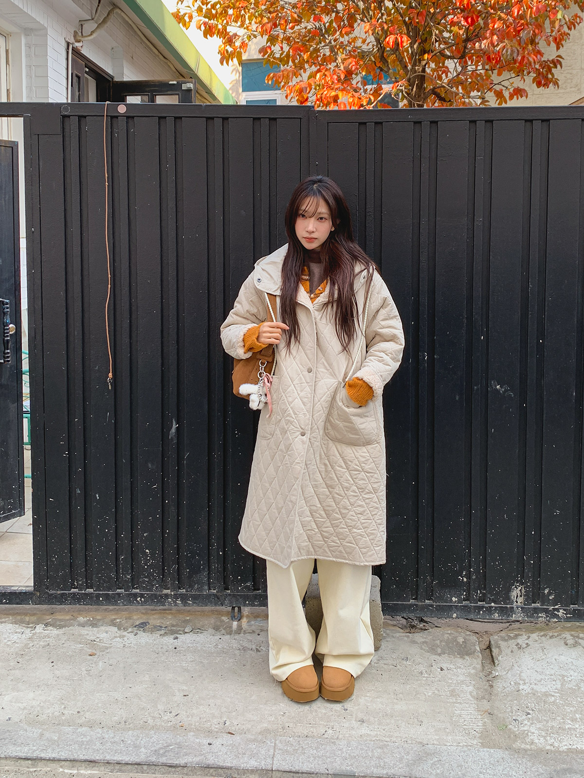 겉면에 퀄팅 디자인이 들어가고 안감에는 부드럽고 포근한 뽀글이 소재가 사용되어 보온성이 뛰어난 롱 자켓