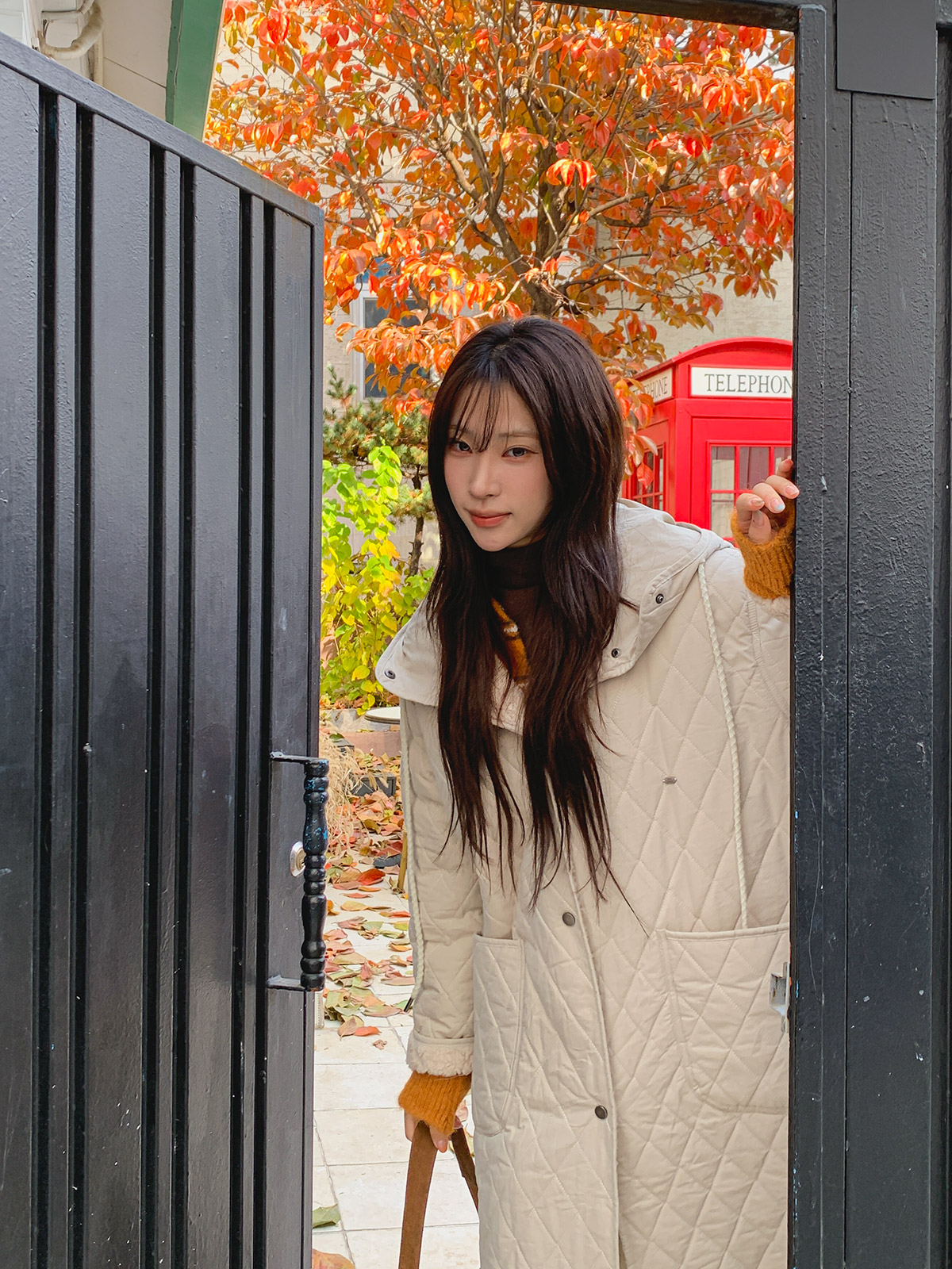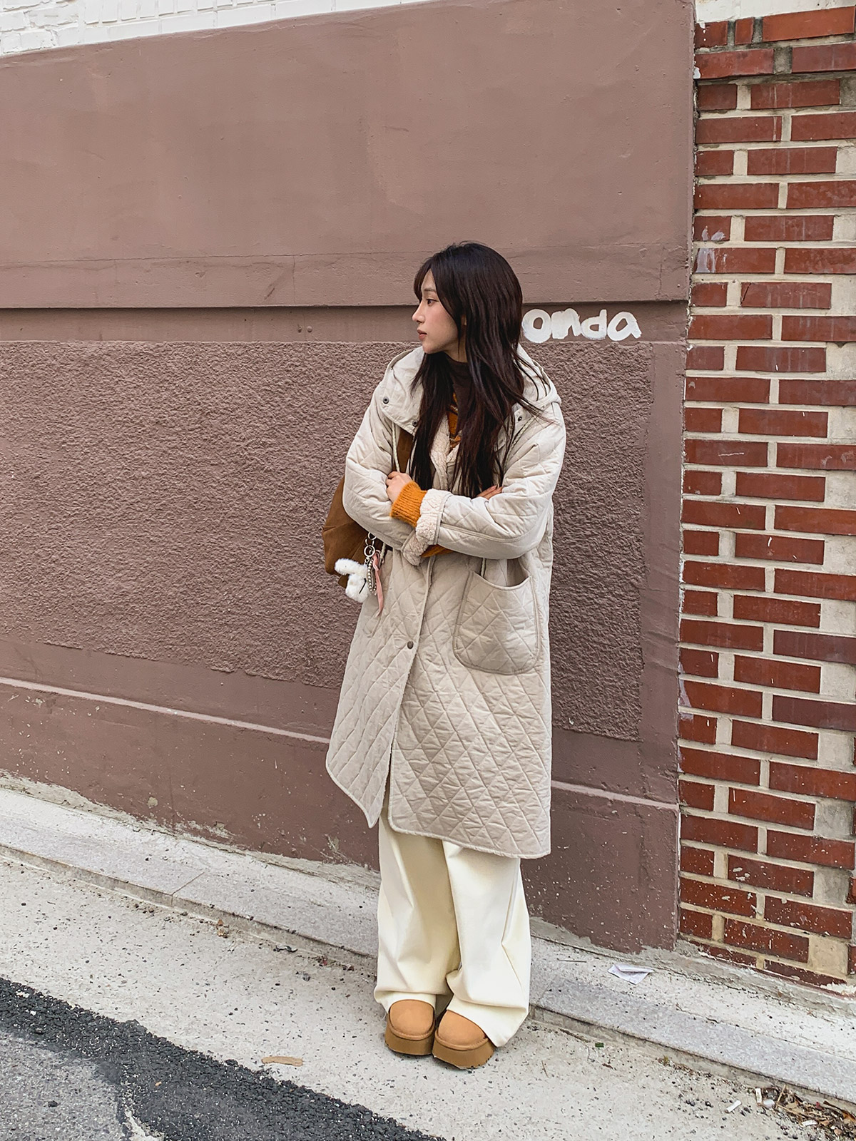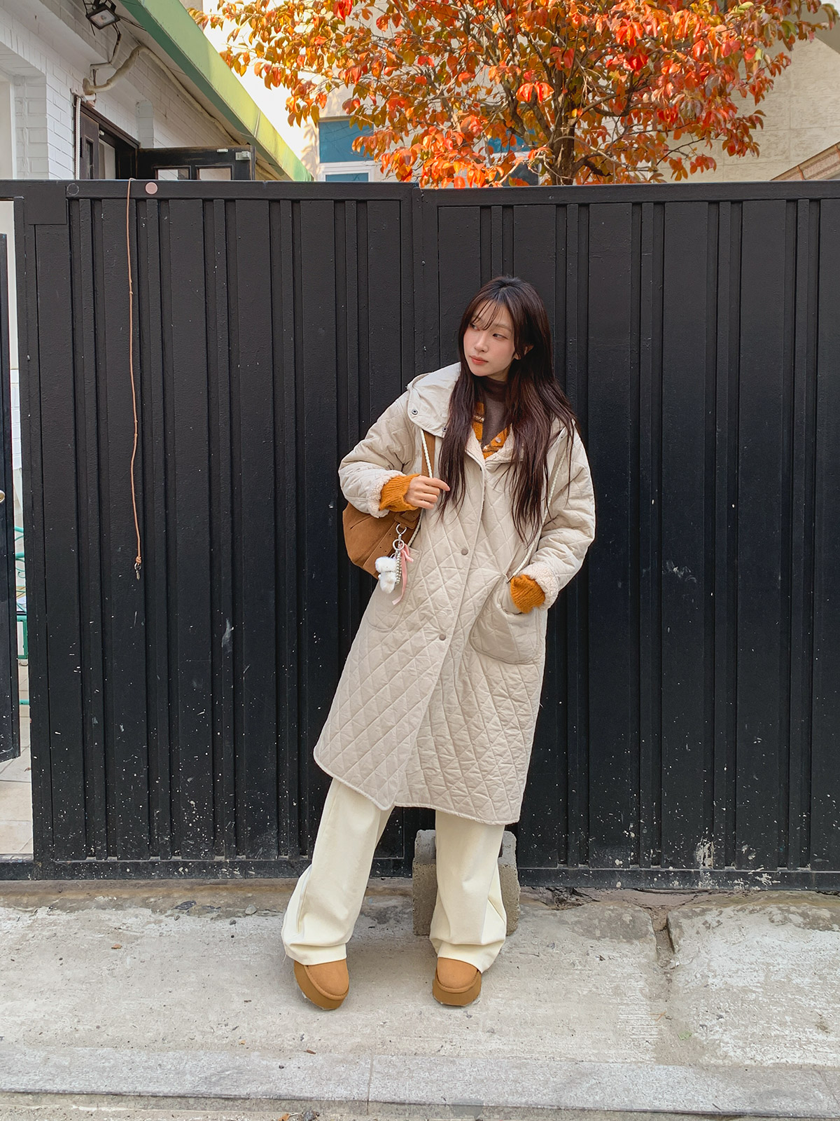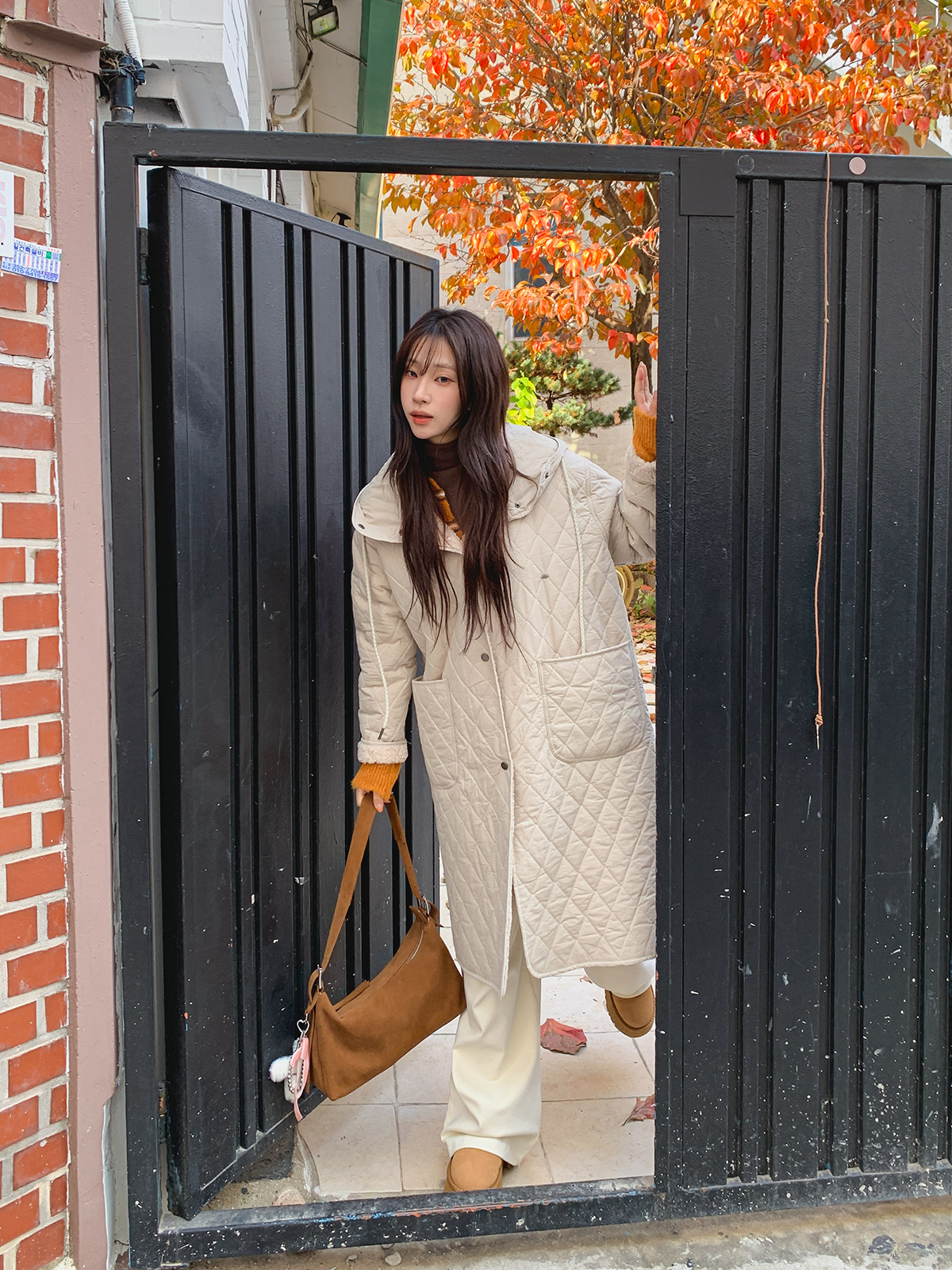 겉면에 퀄팅 디자인이 들어가고 안감에는 부드럽고 포근한 뽀글이 소재가 사용되어 보온성이 뛰어난 롱 자켓