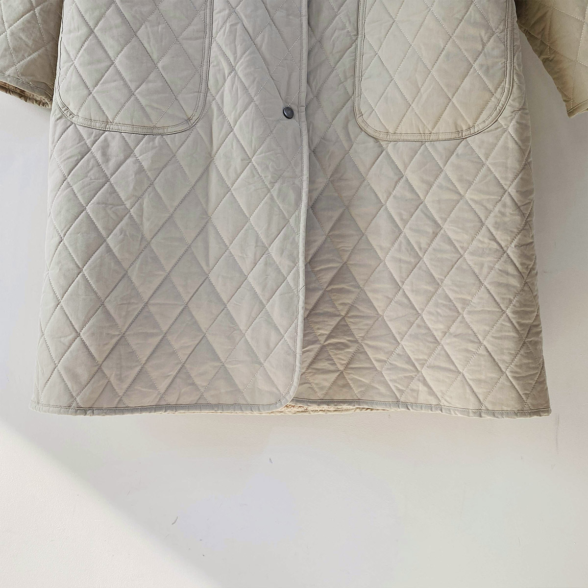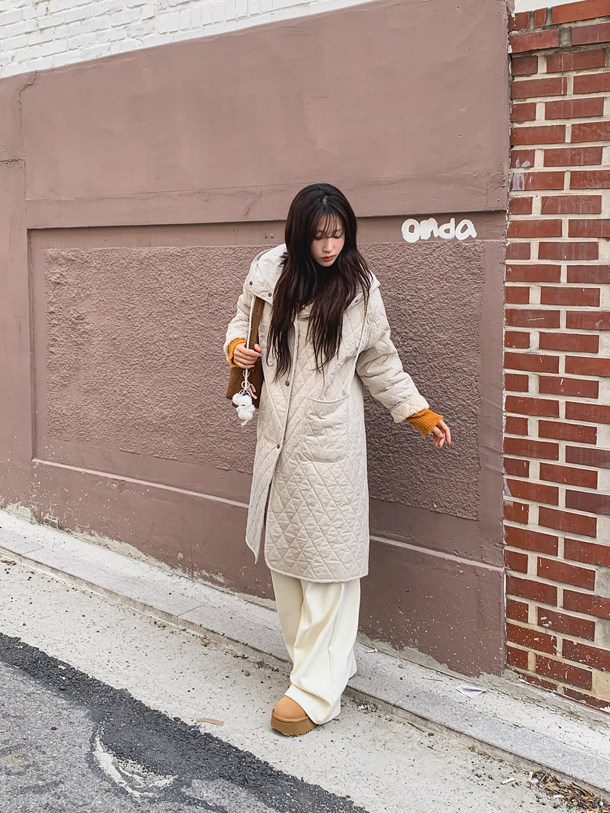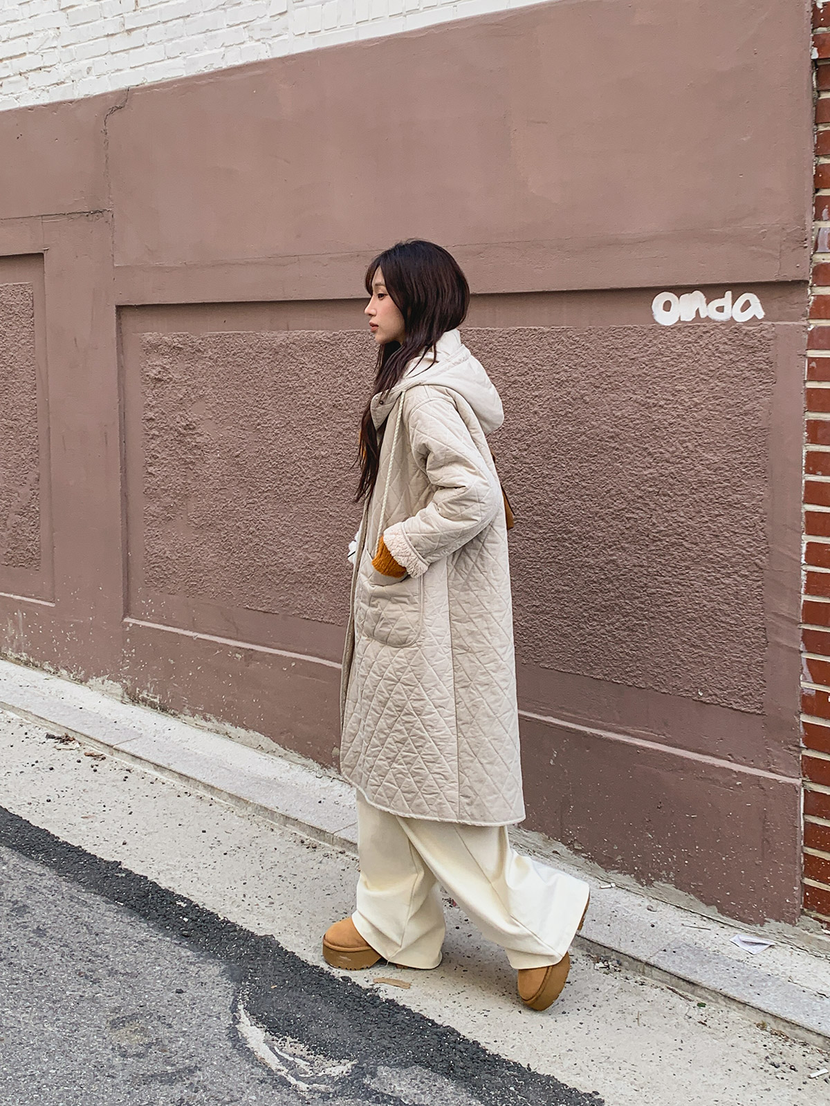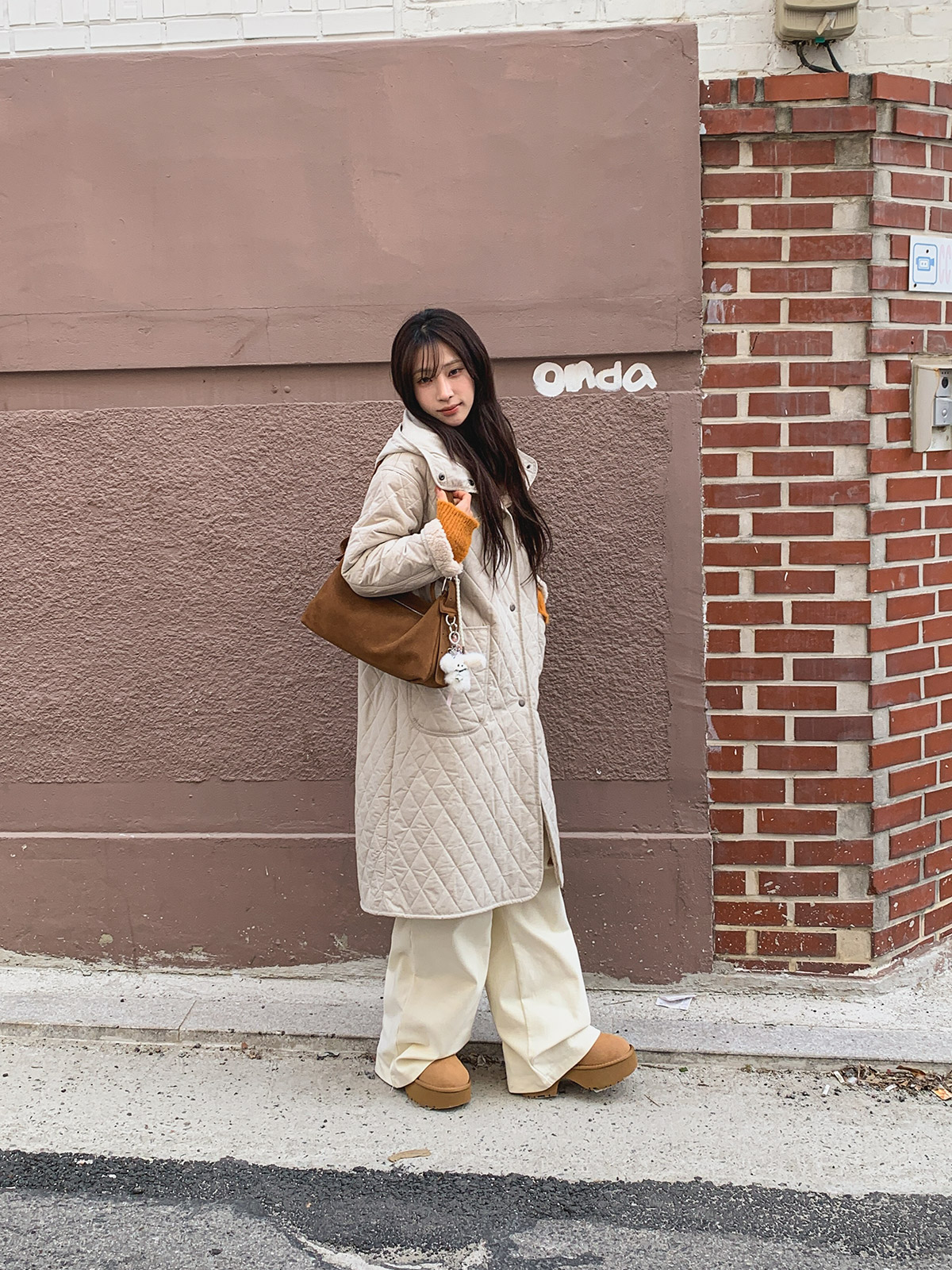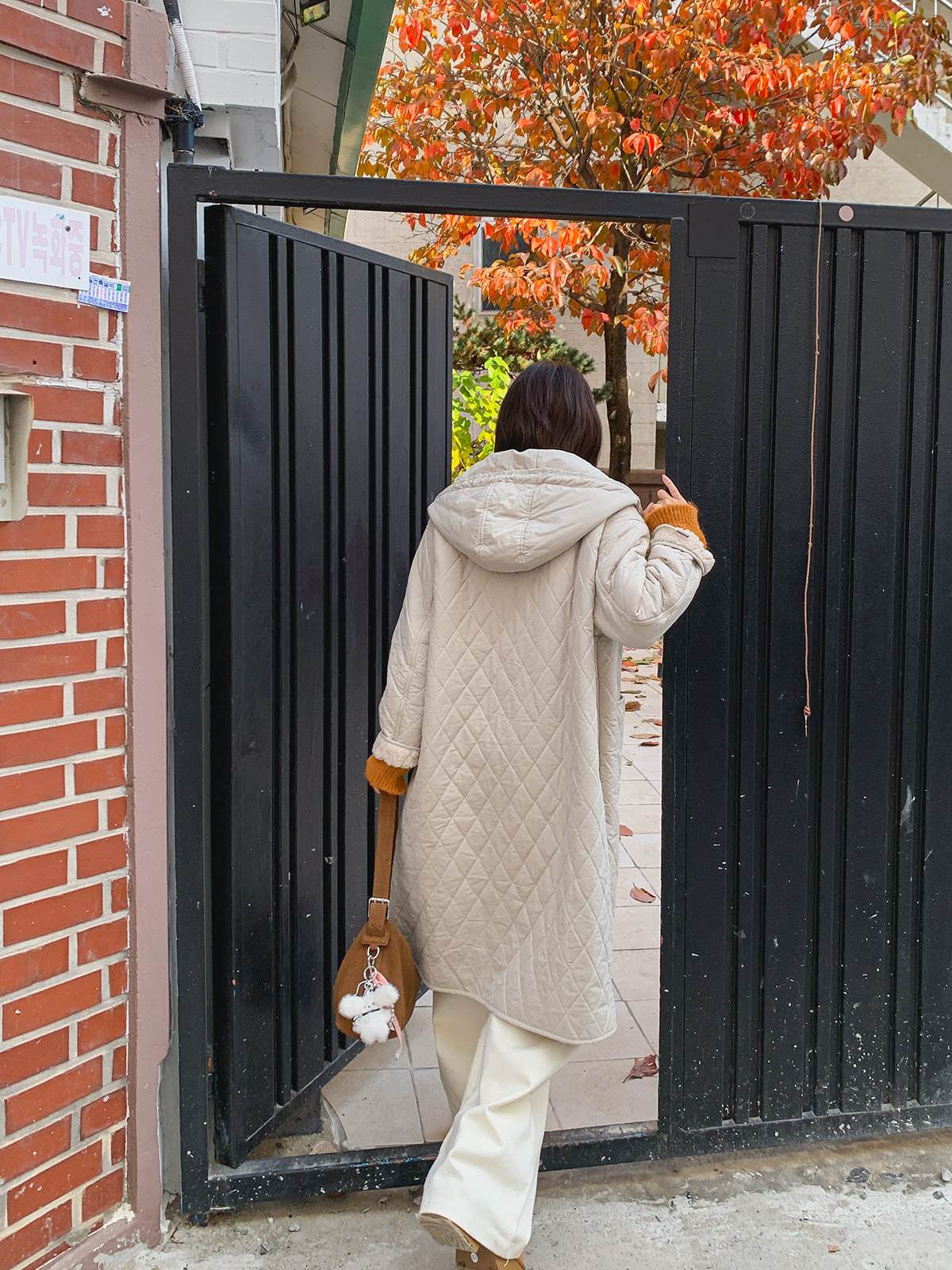 겉면에 퀄팅 디자인이 들어가고 안감에는 부드럽고 포근한 뽀글이 소재가 사용되어 보온성이 뛰어난 롱 자켓
