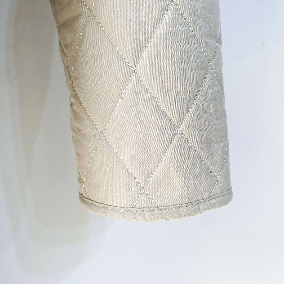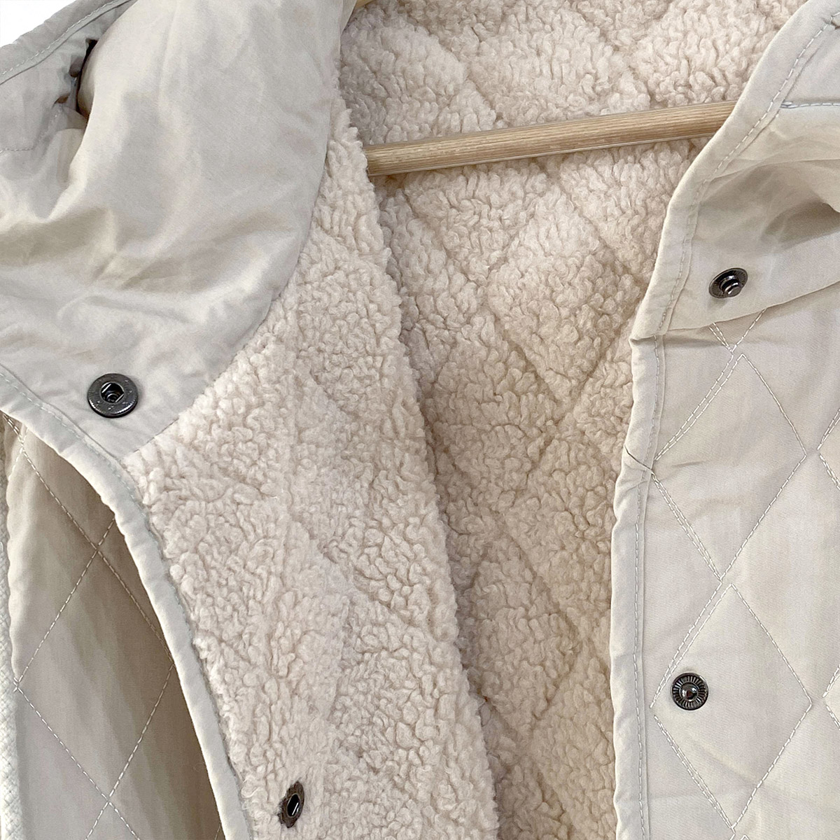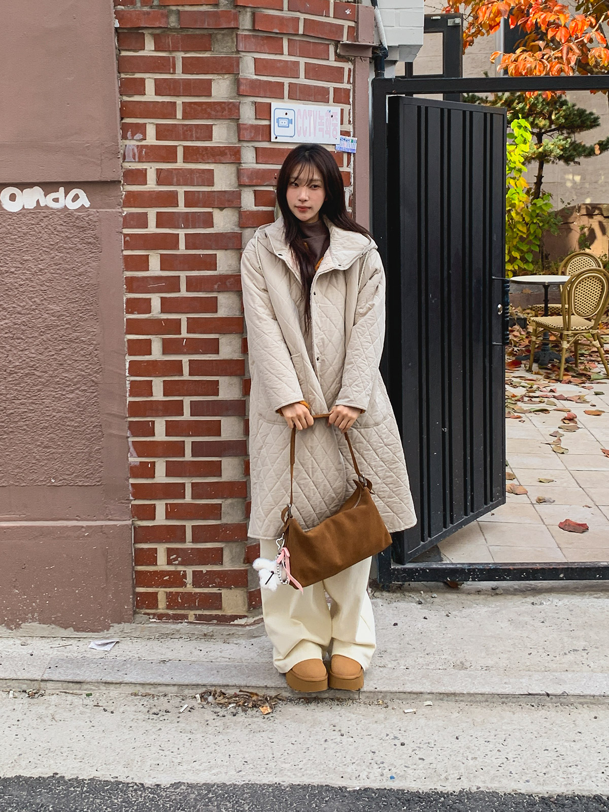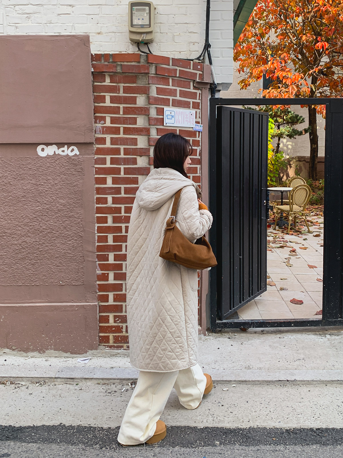 겉면에 퀄팅 디자인이 들어가고 안감에는 부드럽고 포근한 뽀글이 소재가 사용되어 보온성이 뛰어난 롱 자켓