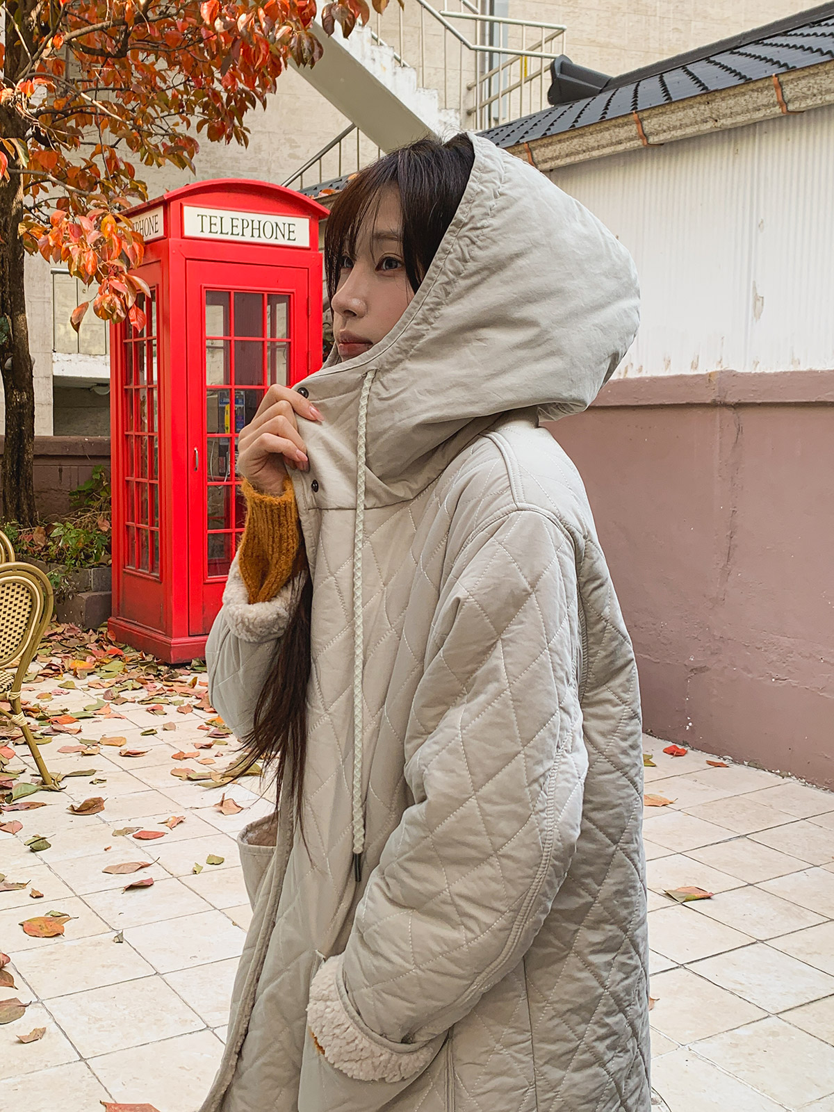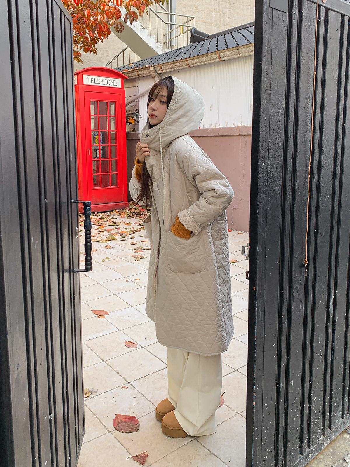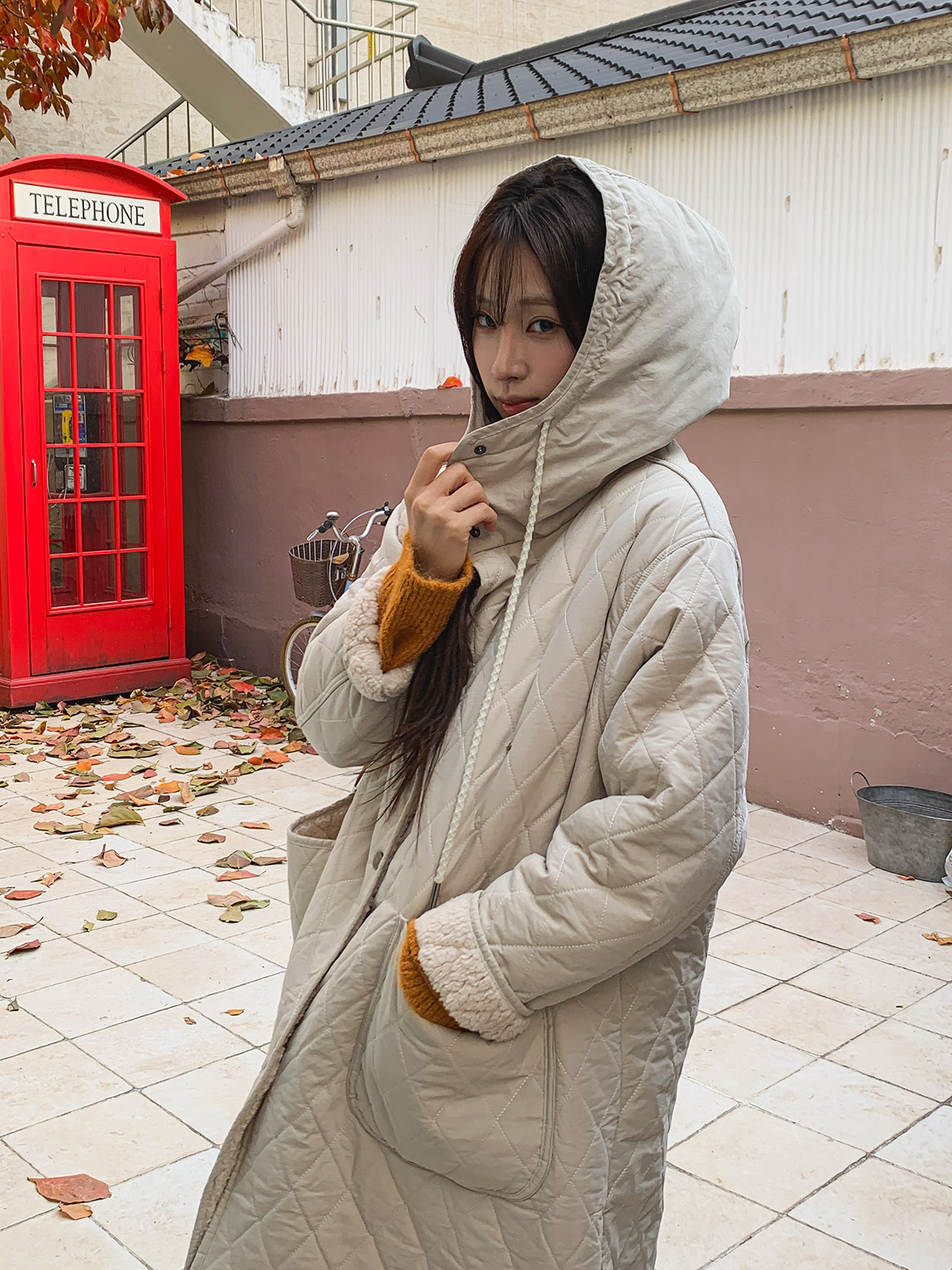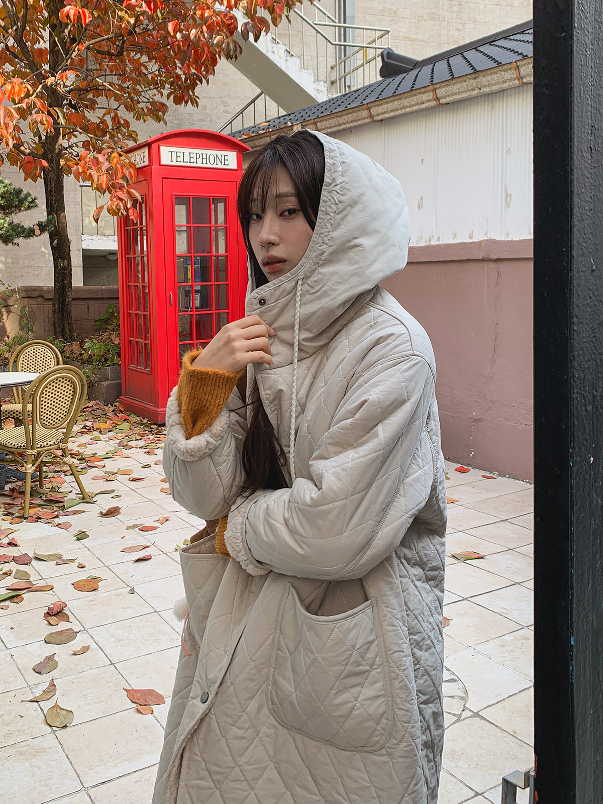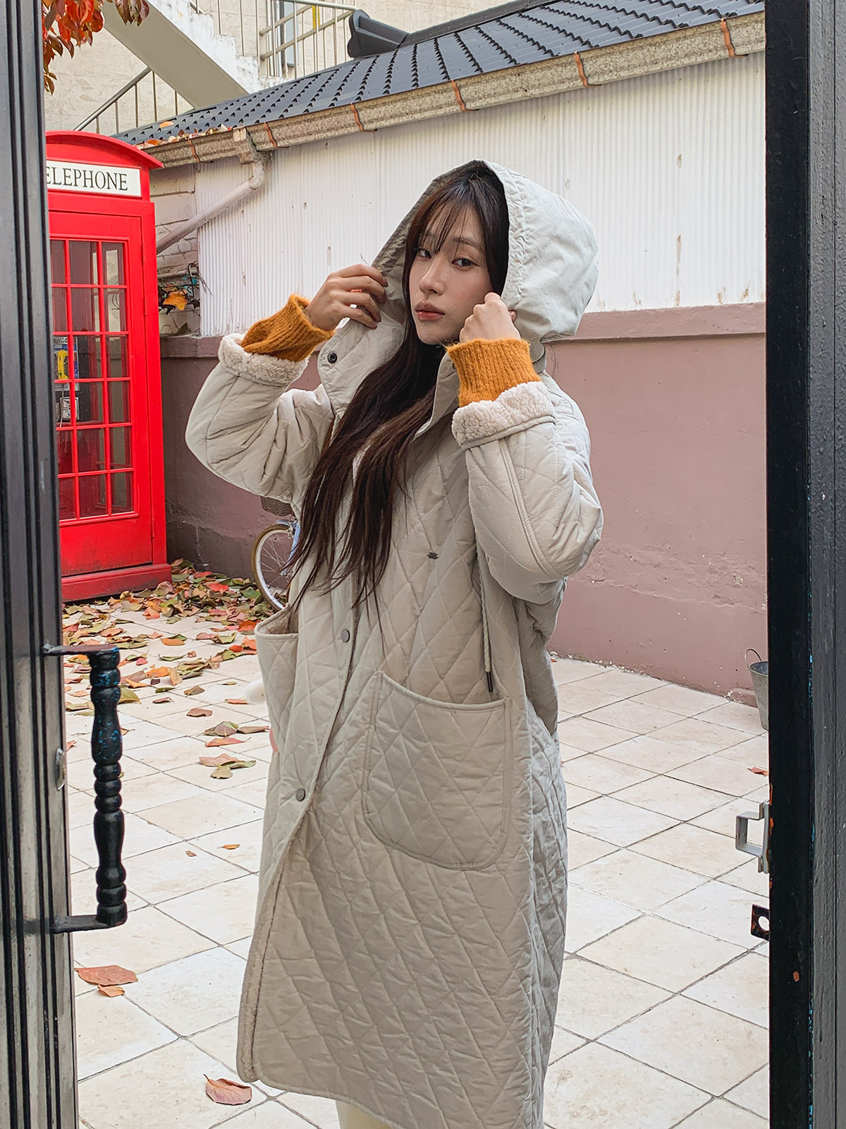 JK6104K5B-뉴유리 뽀글이 안감 퀄팅 후드 롱 자켓