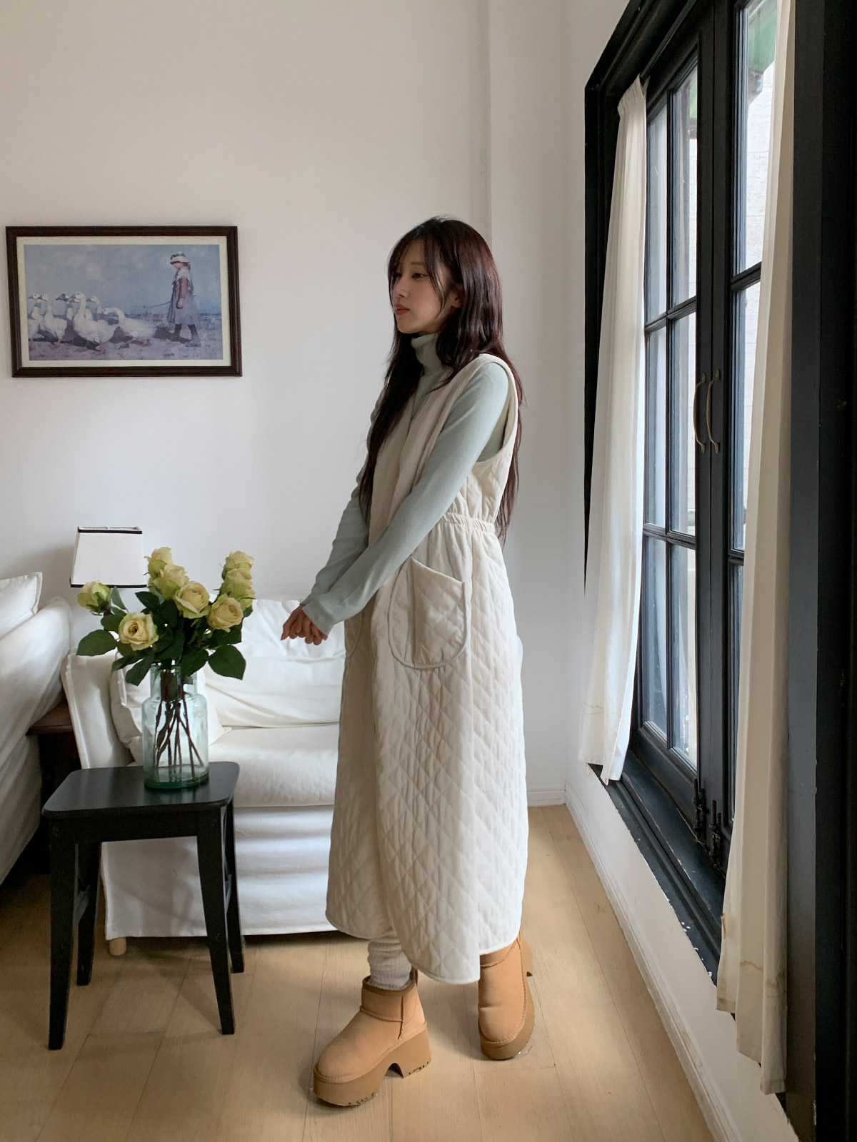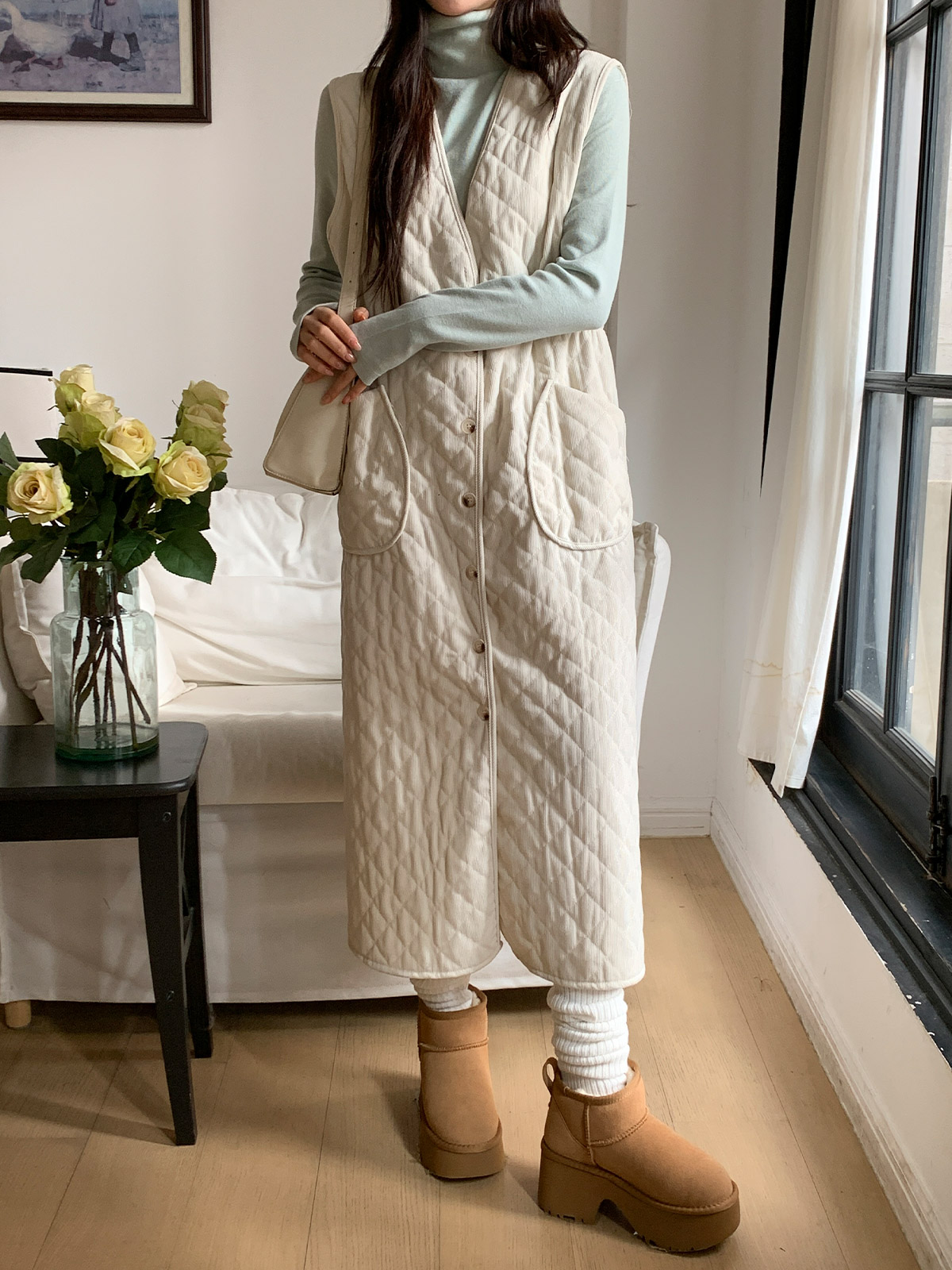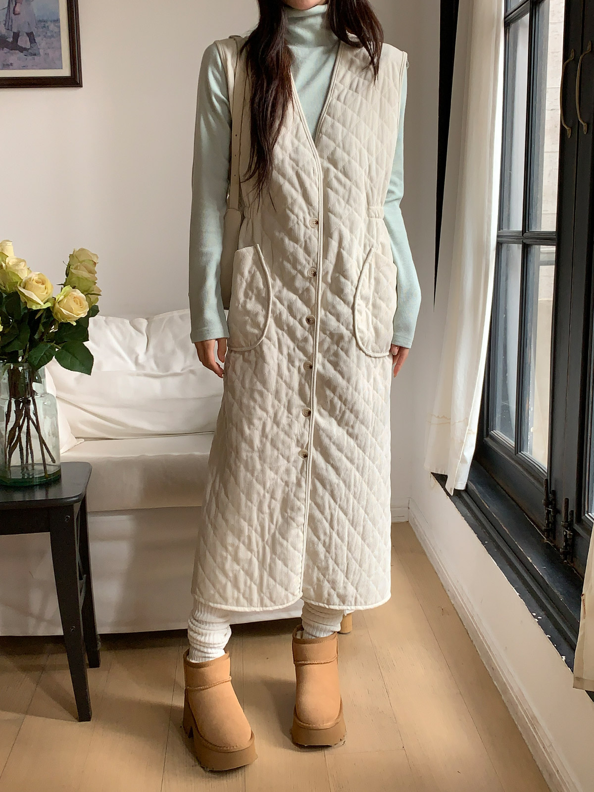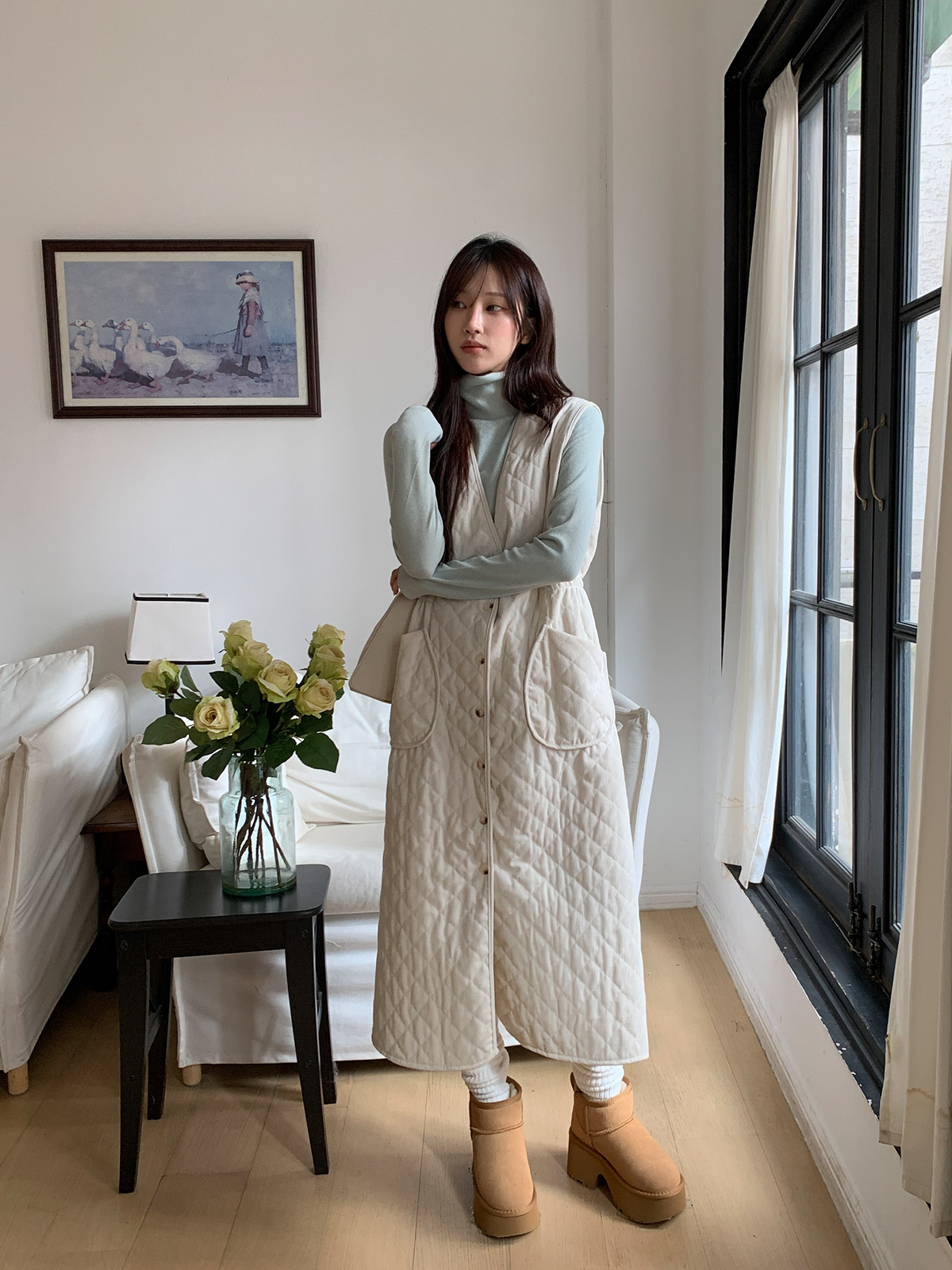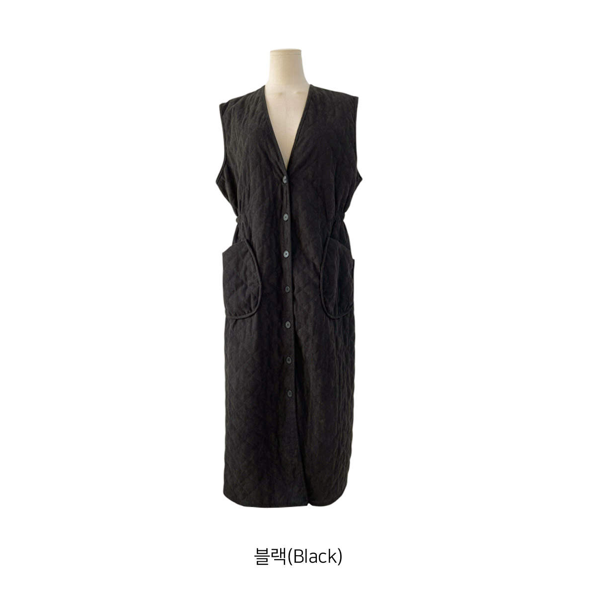 누빔 처리로 따뜻함과 스타일을 모두 잡은 롱 베스트 원피스예요!