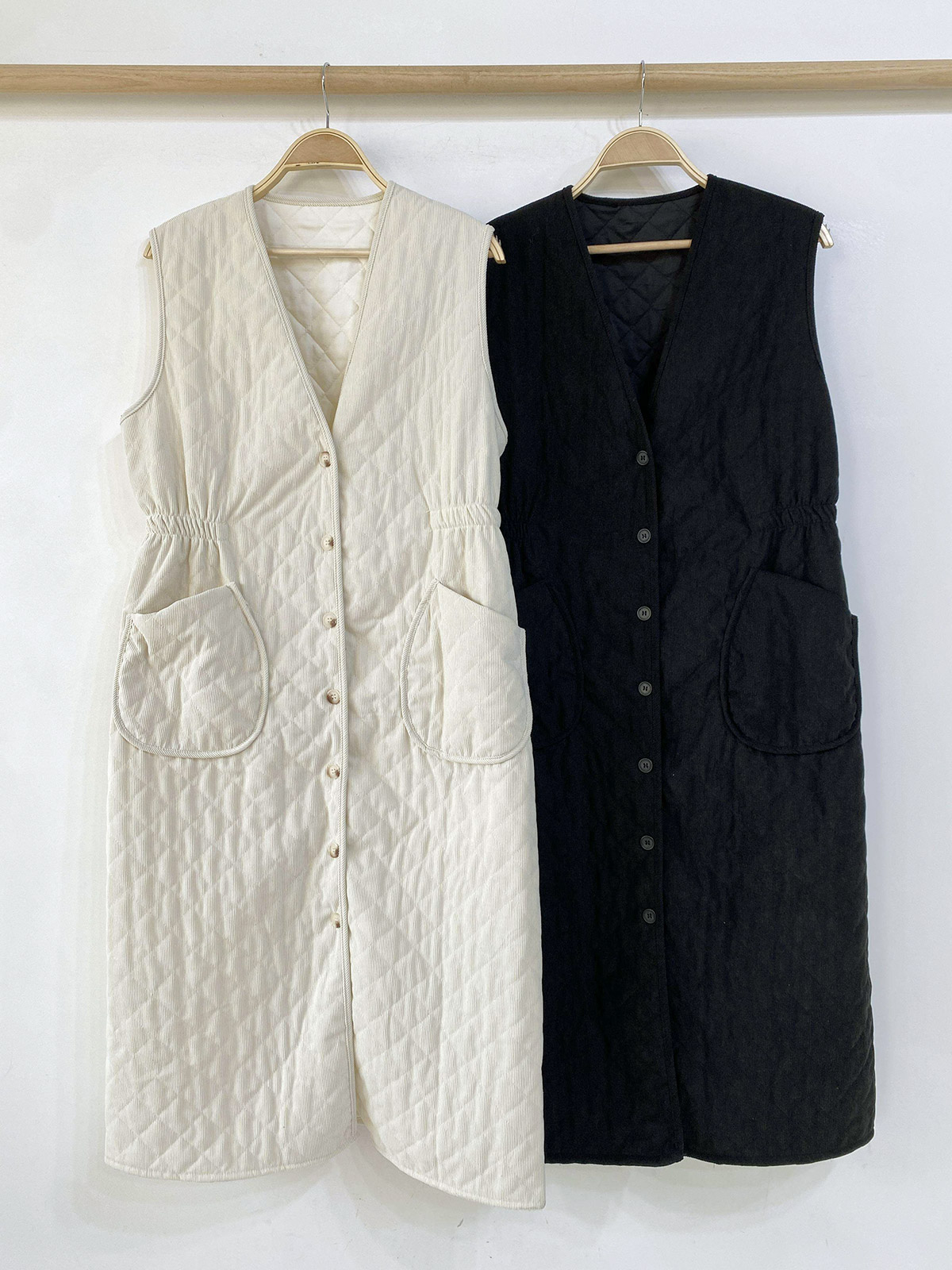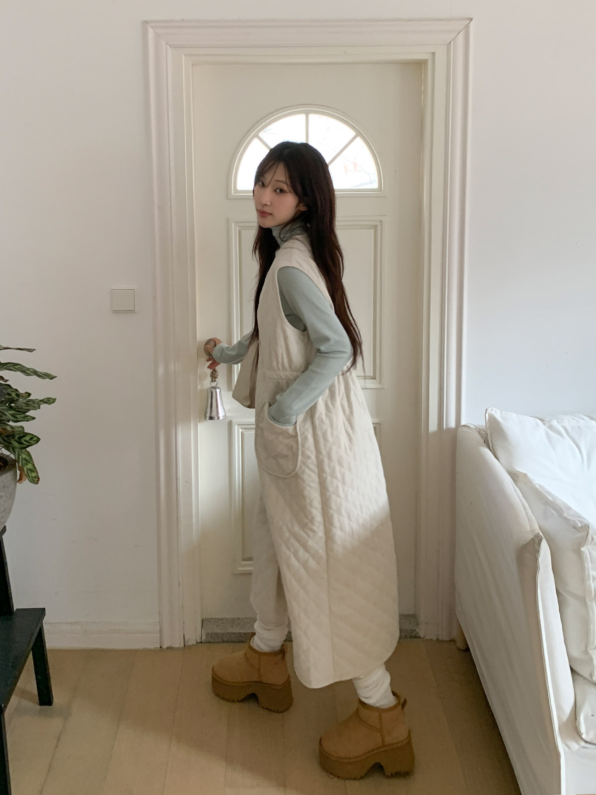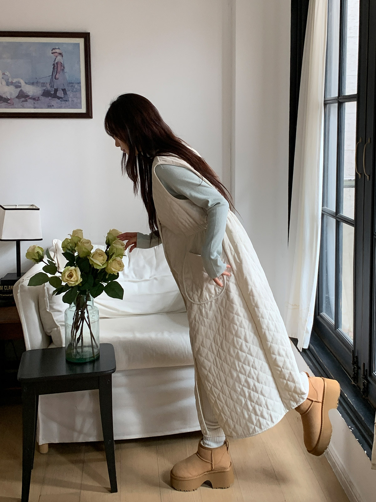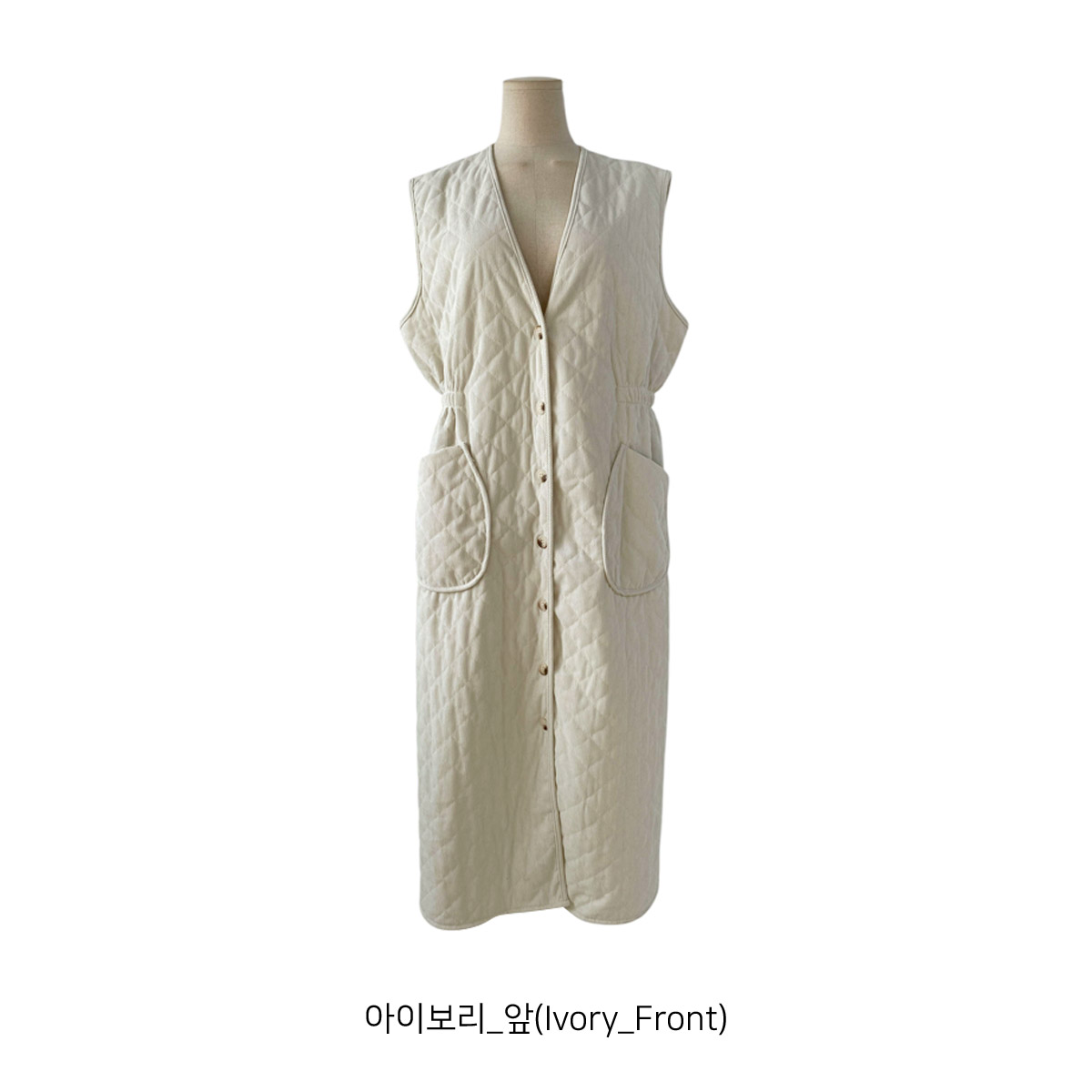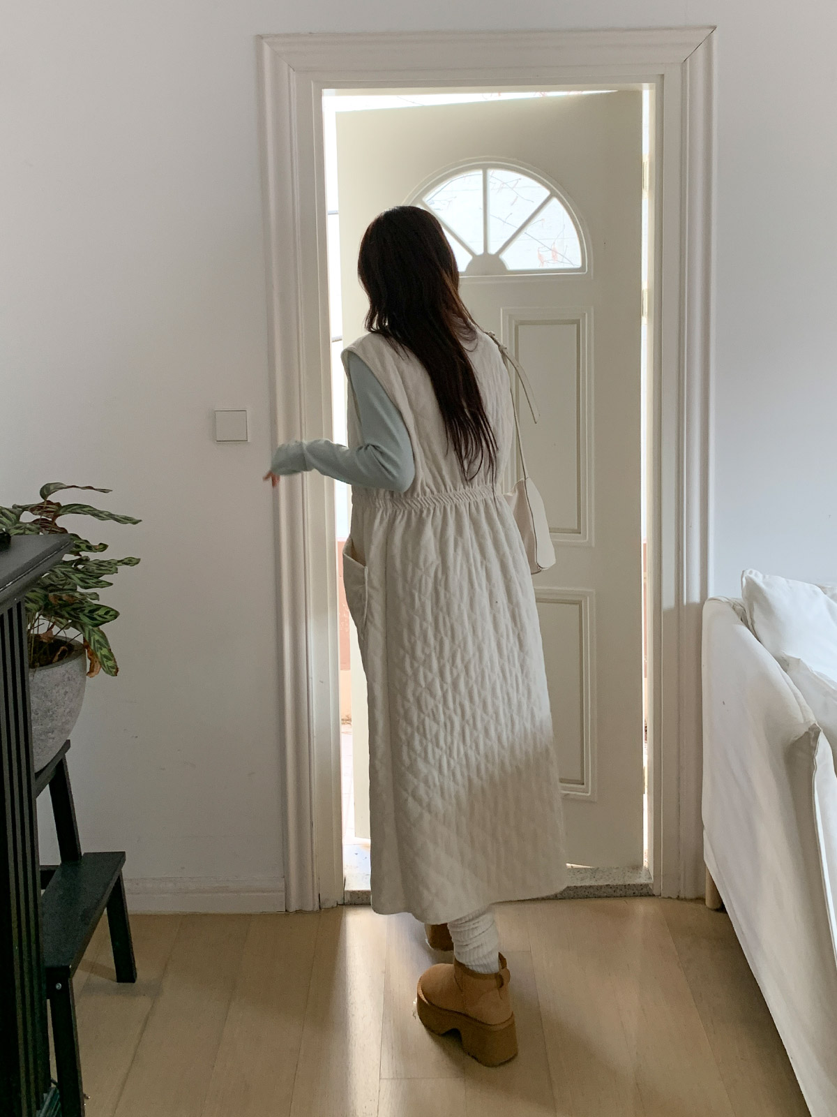 누빔 처리로 따뜻함과 스타일을 모두 잡은 롱 베스트 원피스예요!