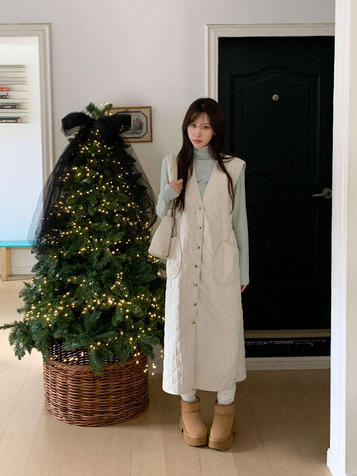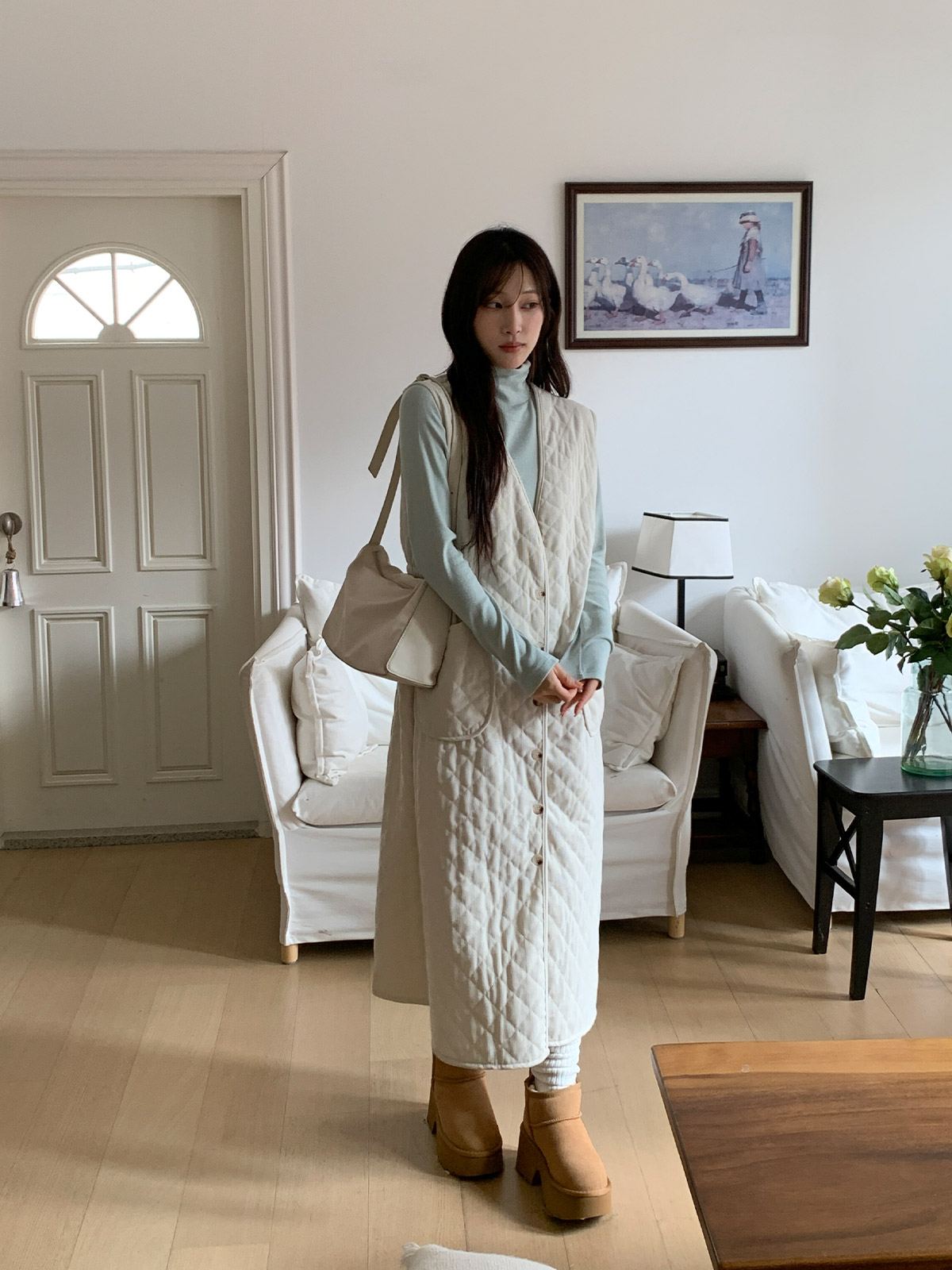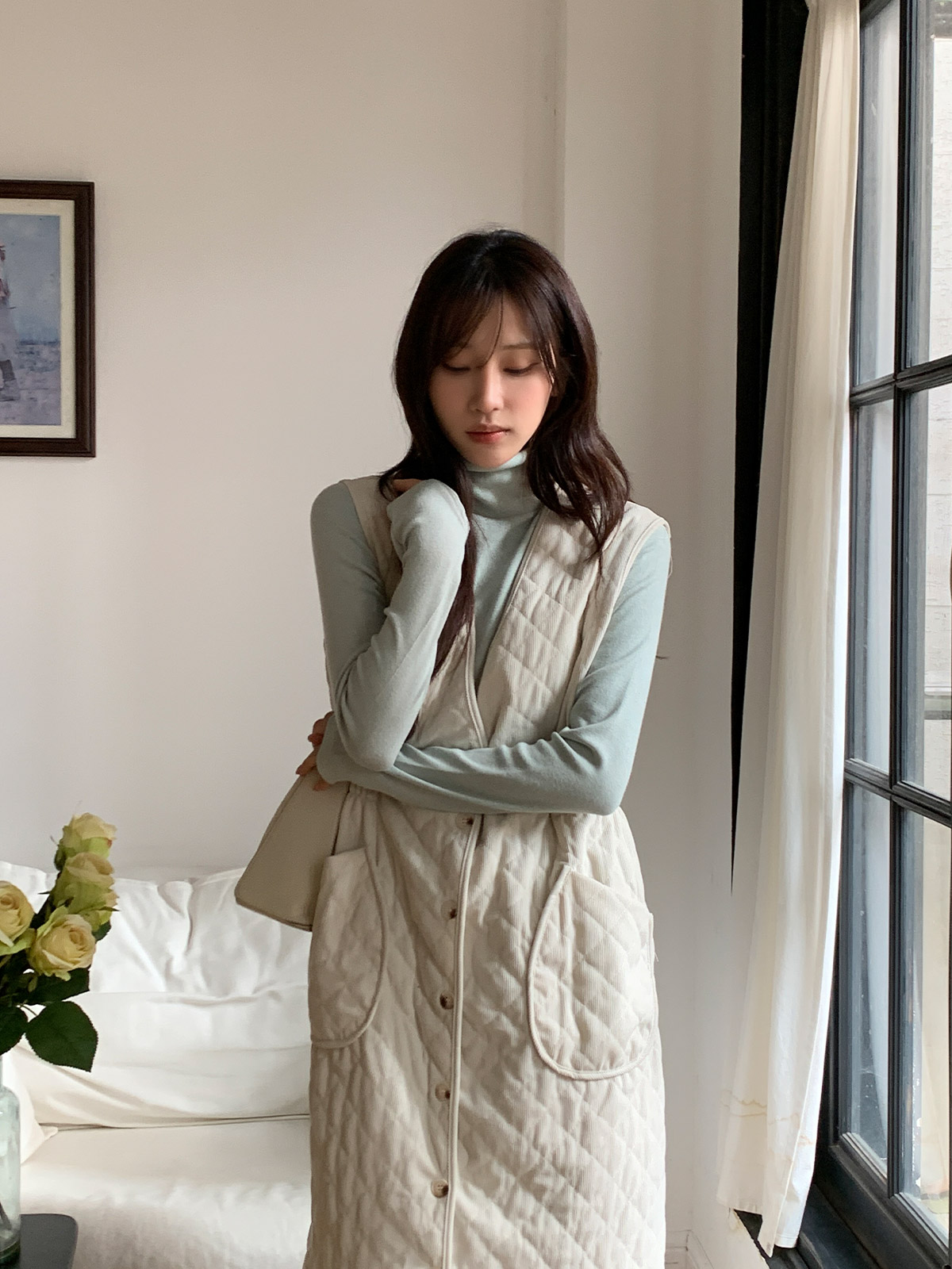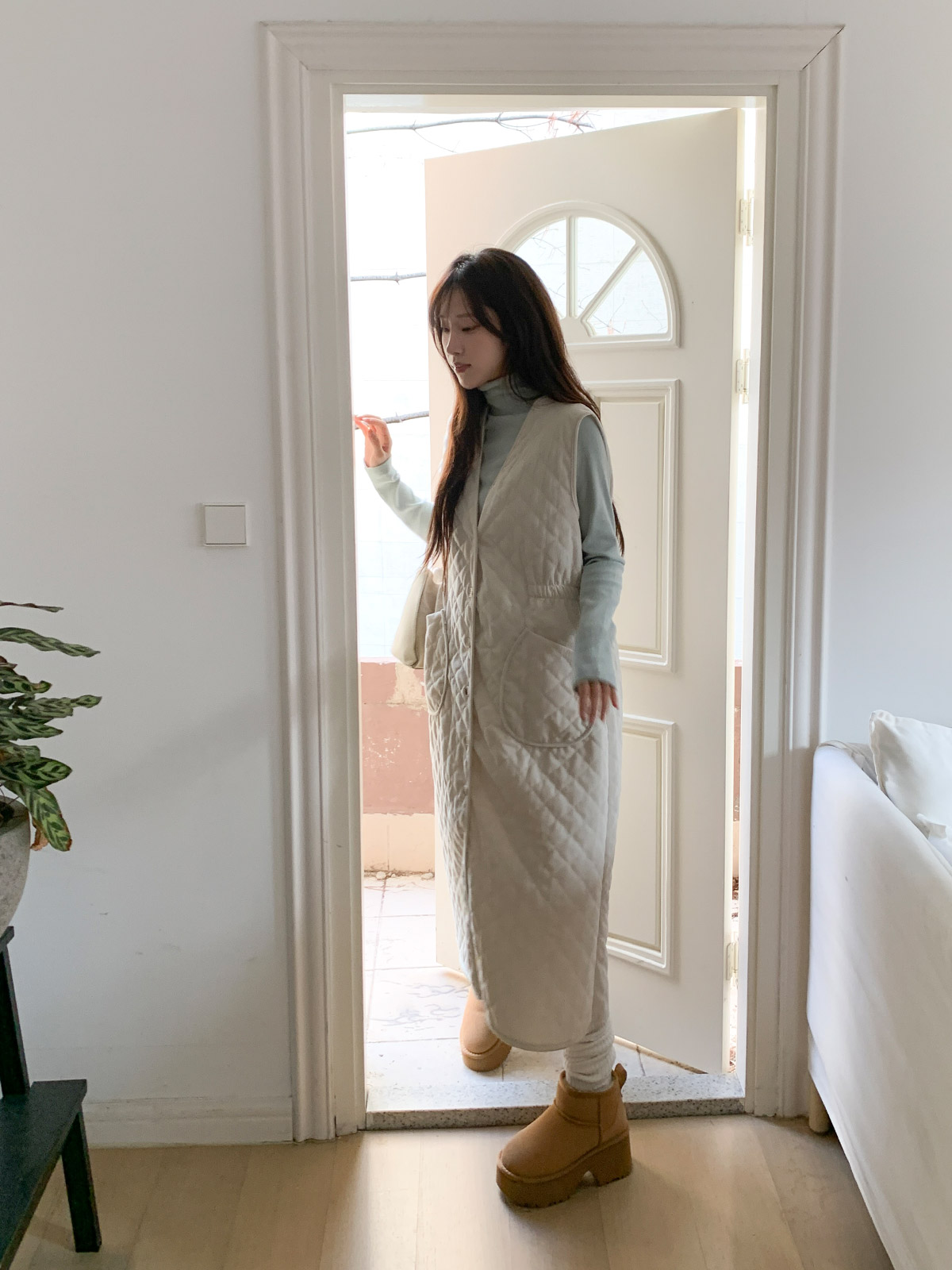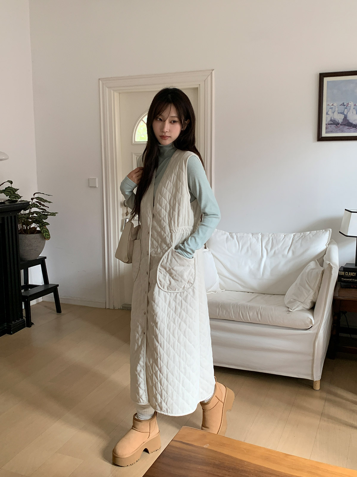 누빔 처리로 따뜻함과 스타일을 모두 잡은 롱 베스트 원피스예요!