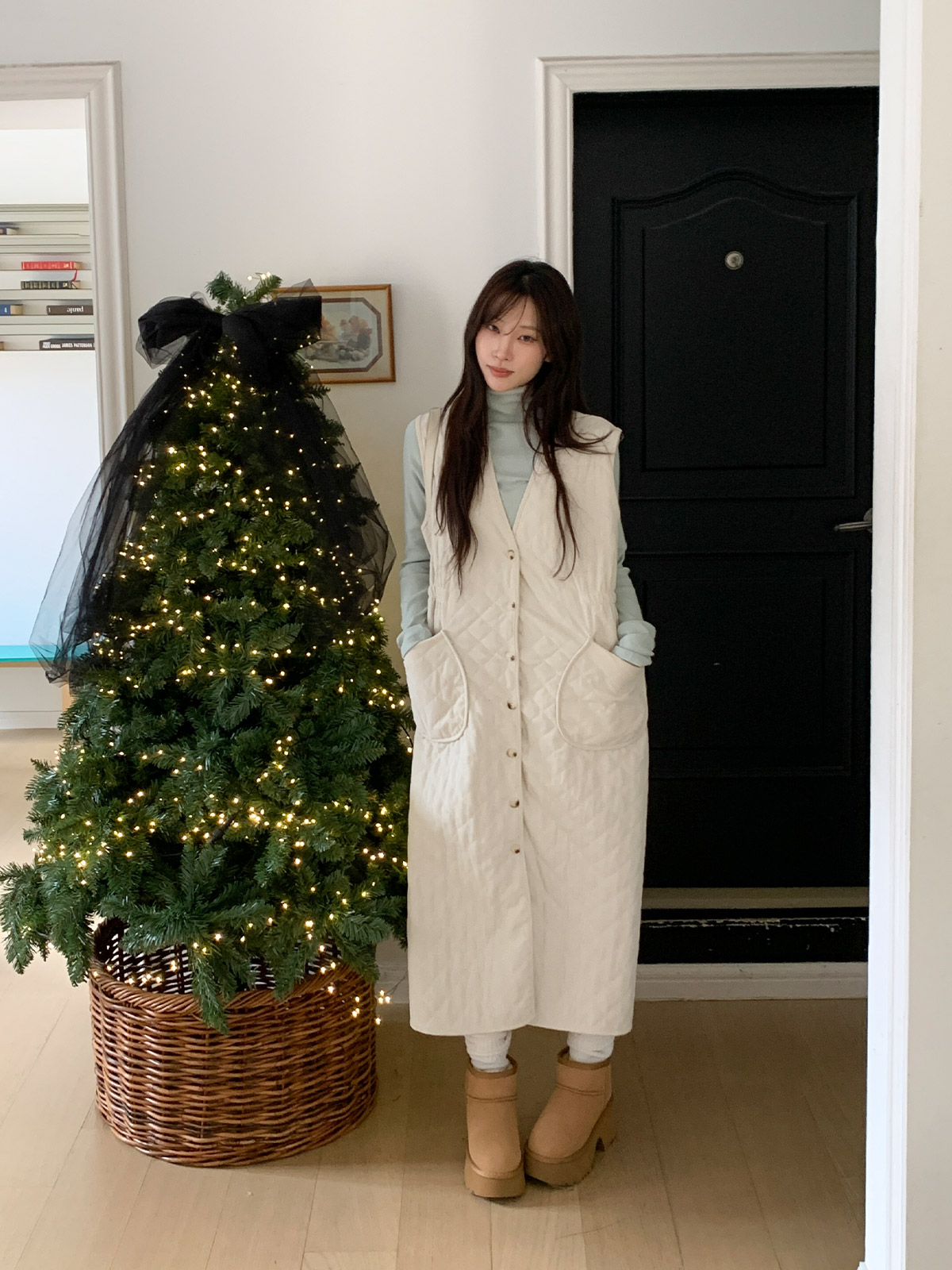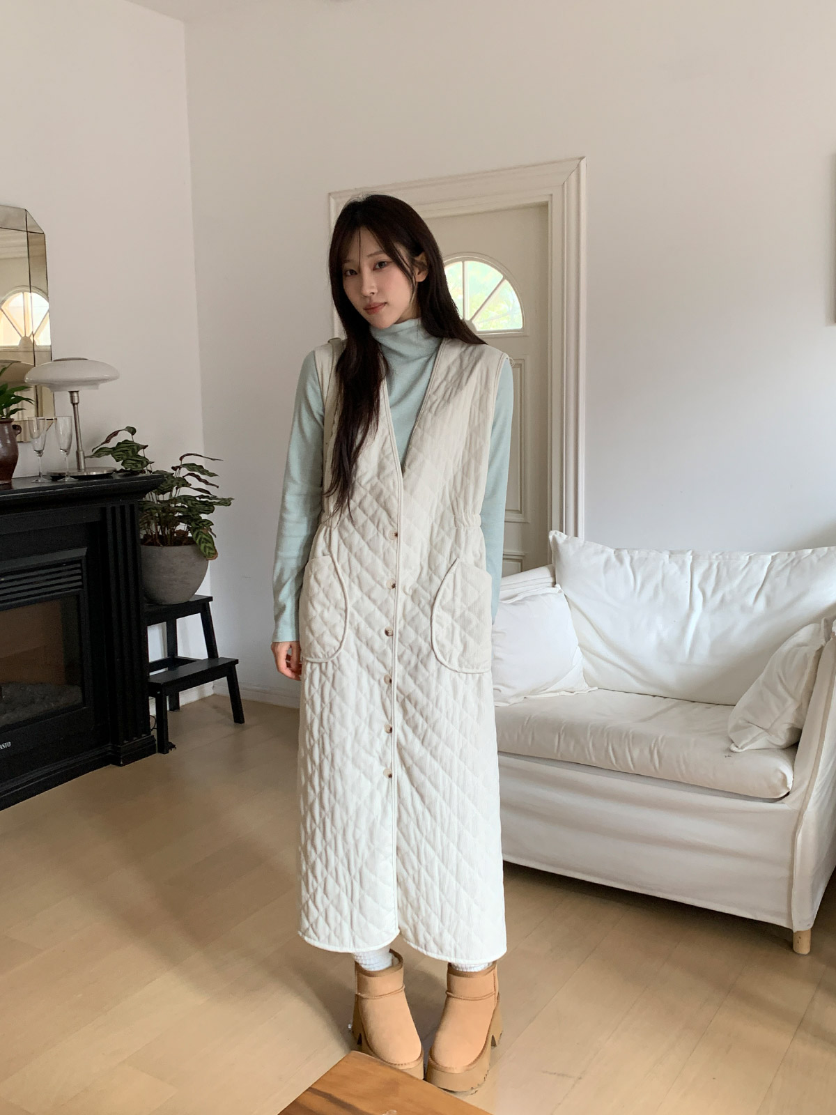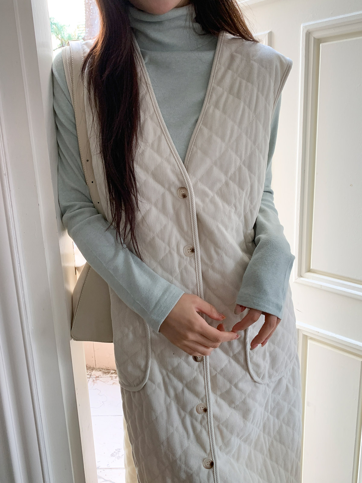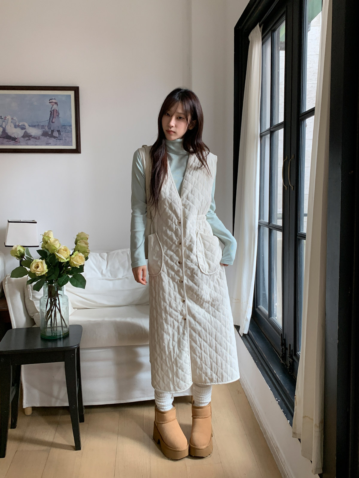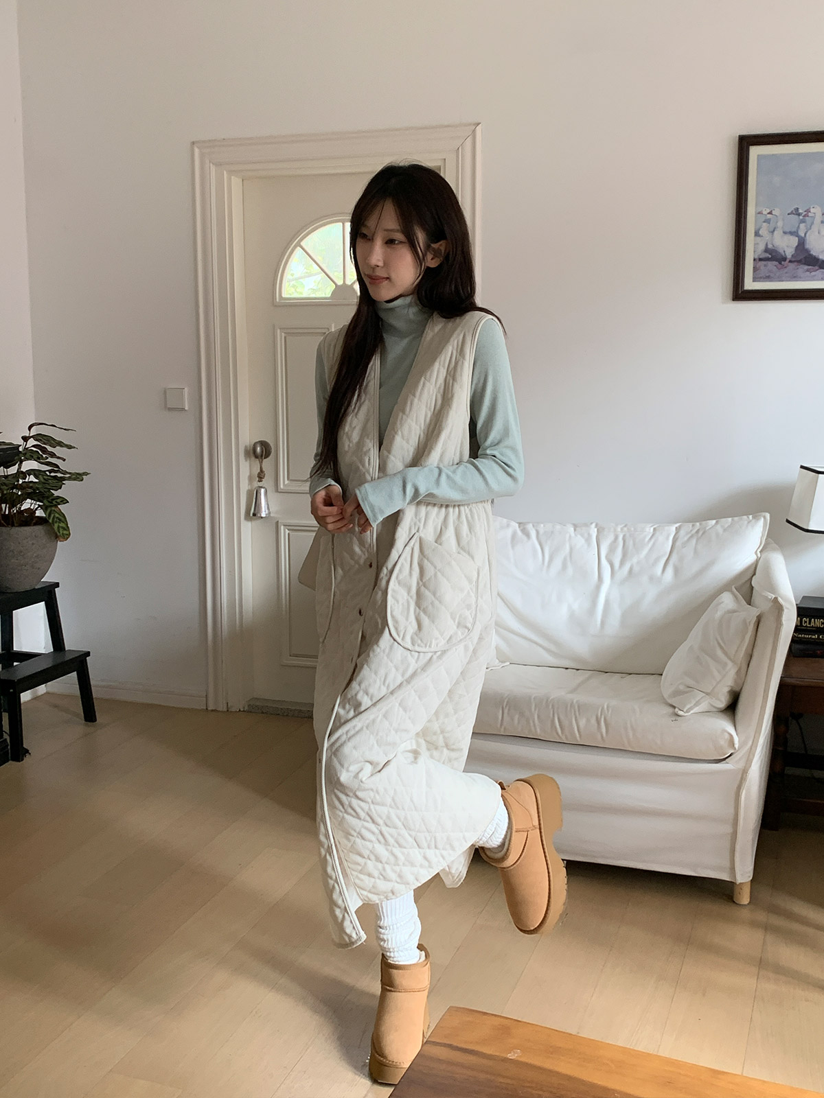 누빔 처리로 따뜻함과 스타일을 모두 잡은 롱 베스트 원피스예요!