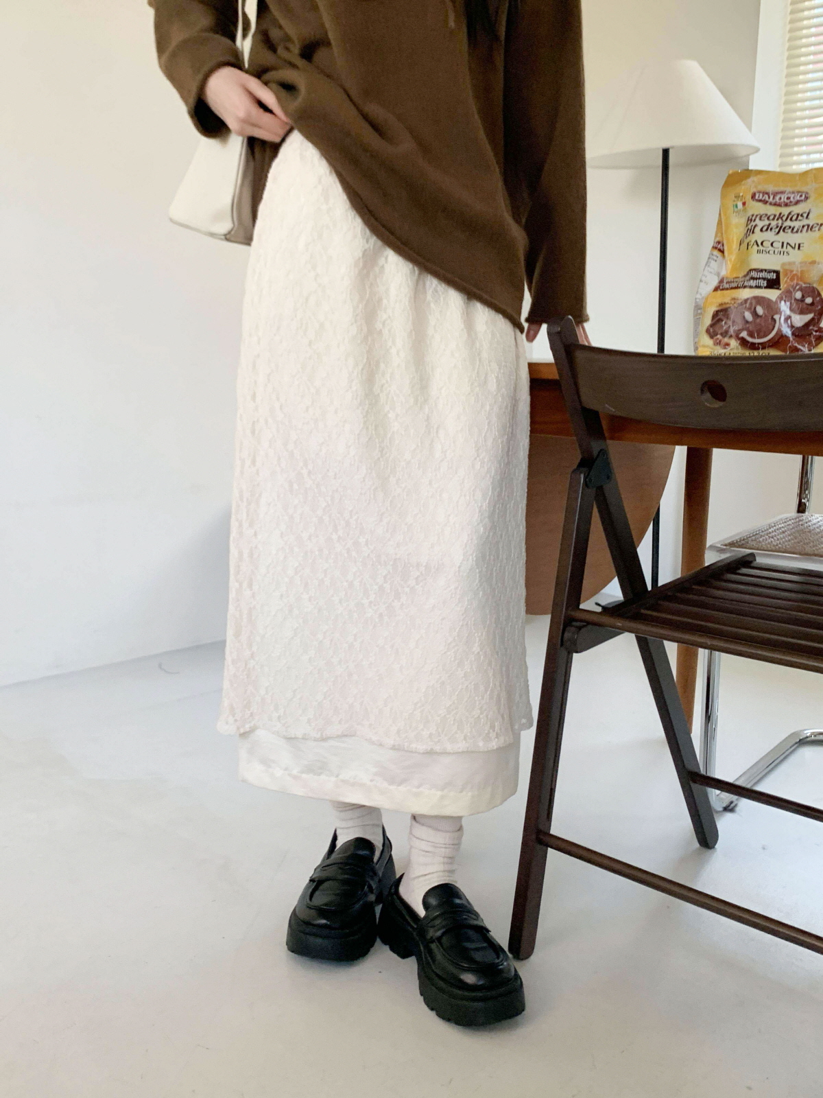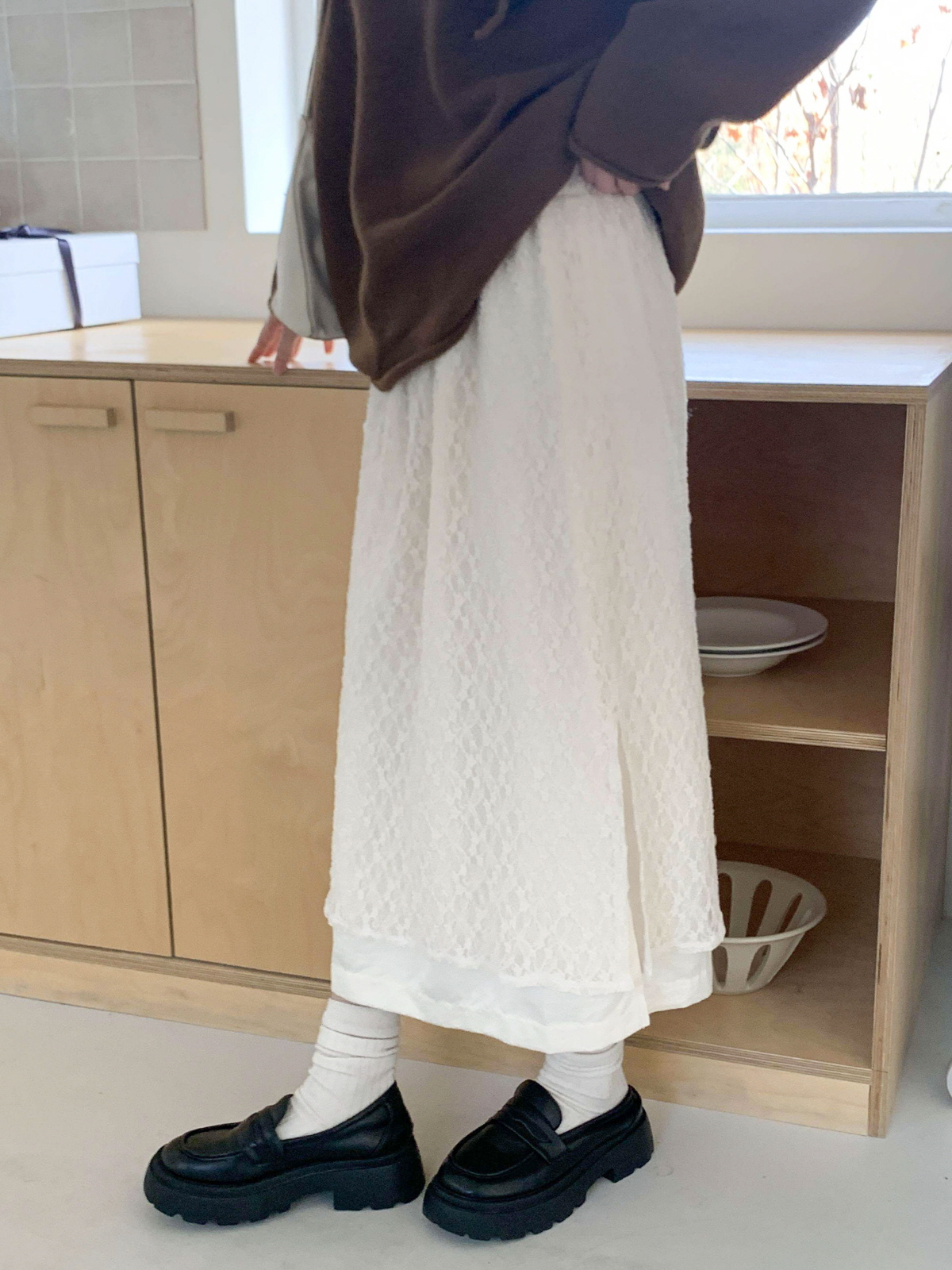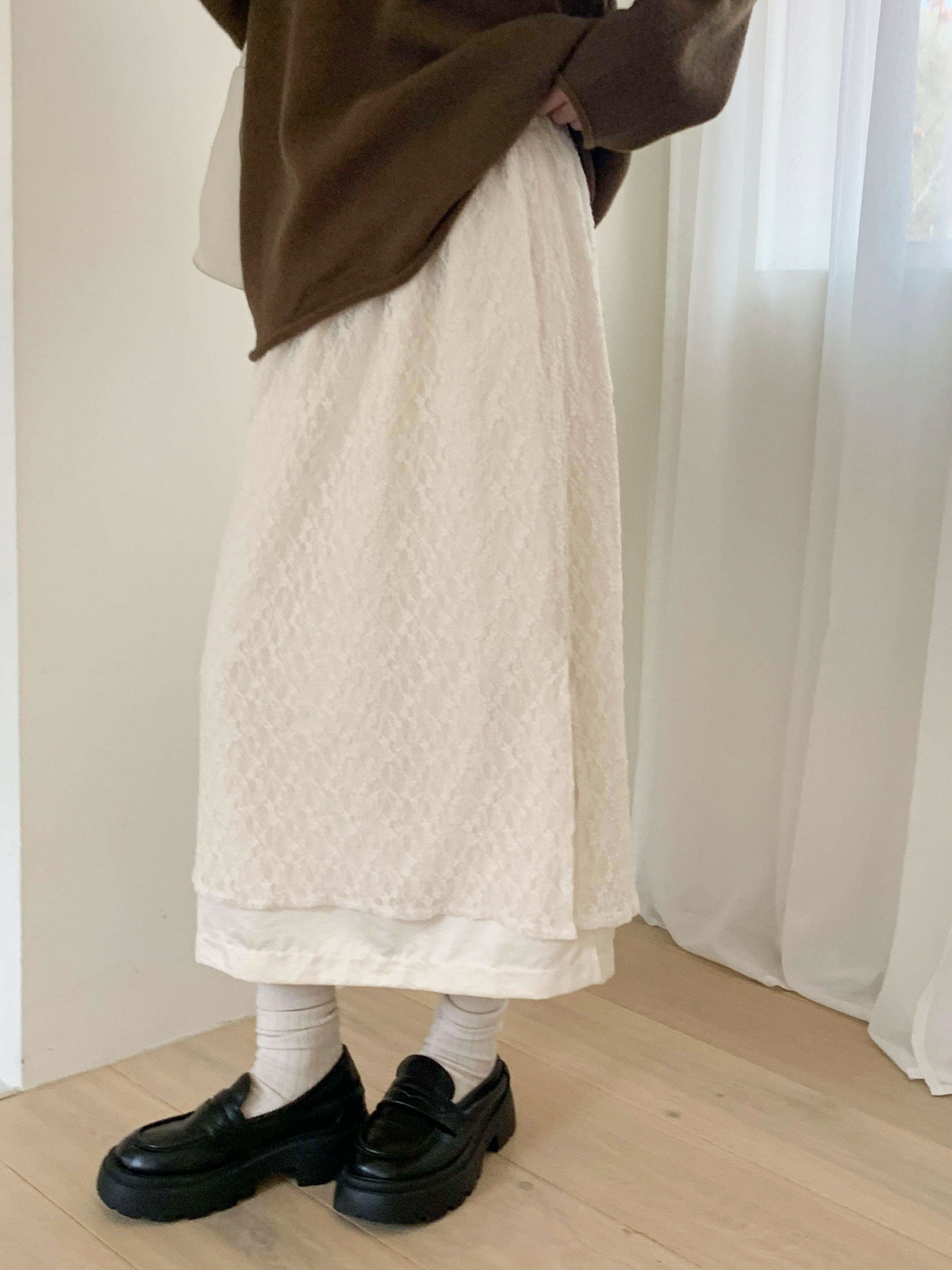 SK7541K5B-코티스 레이스 이중 레이어드 밴딩 롱 스커트