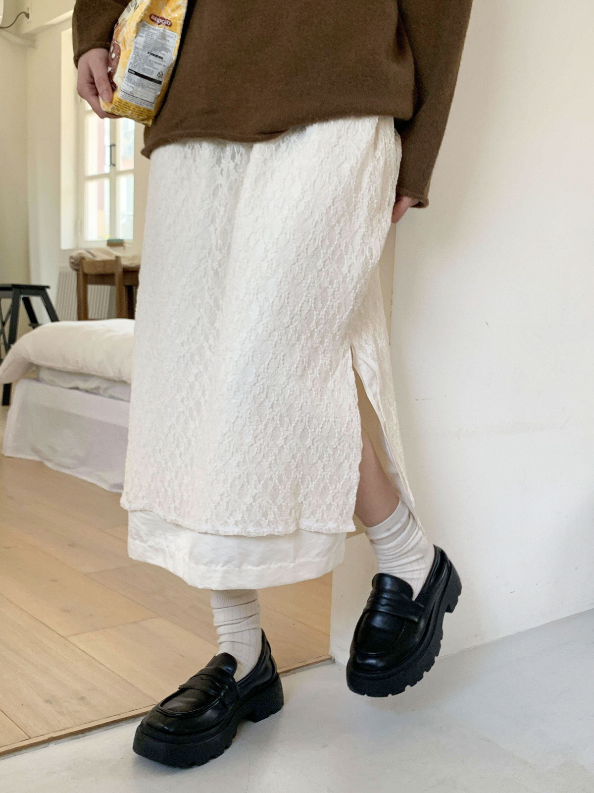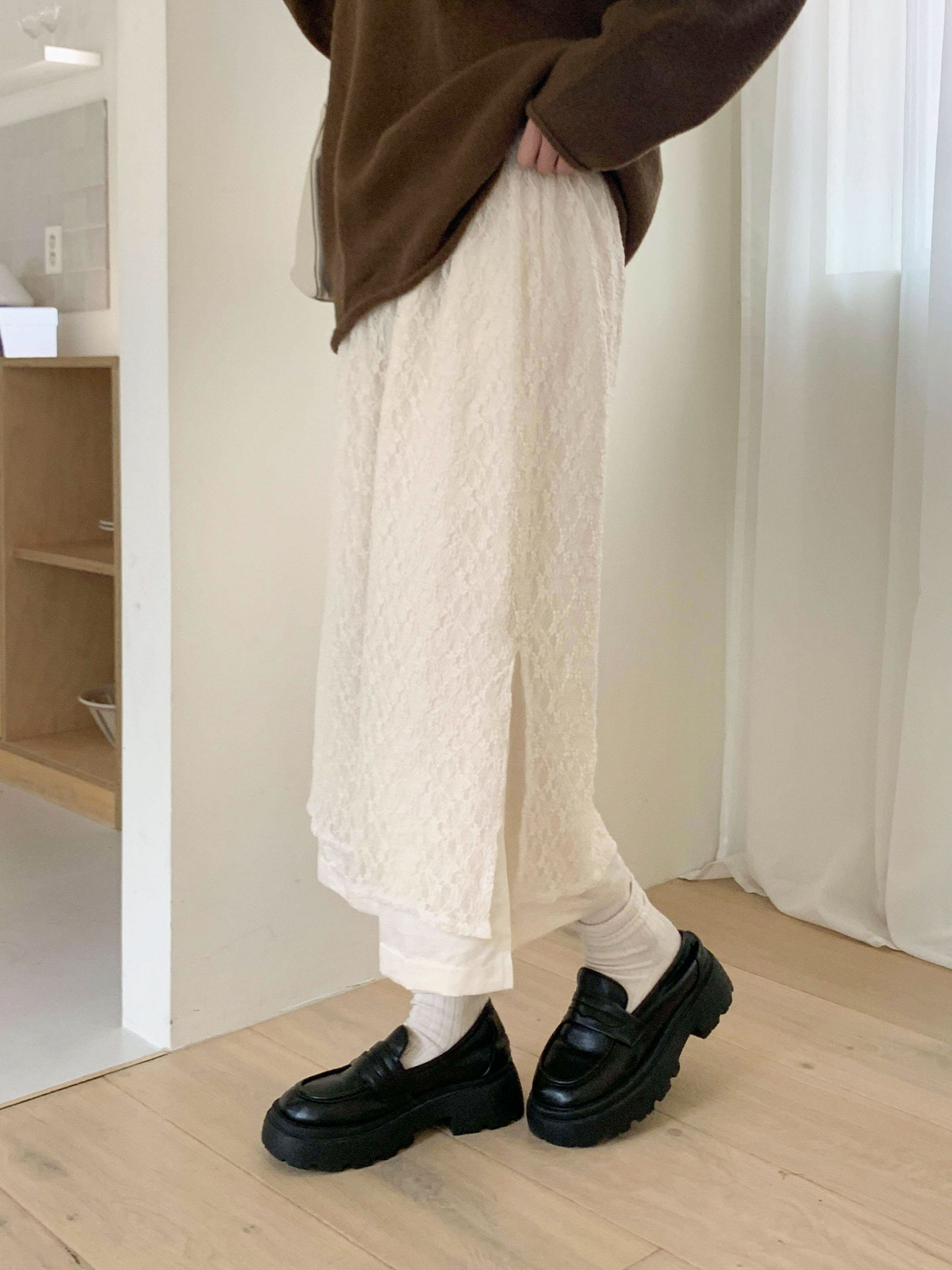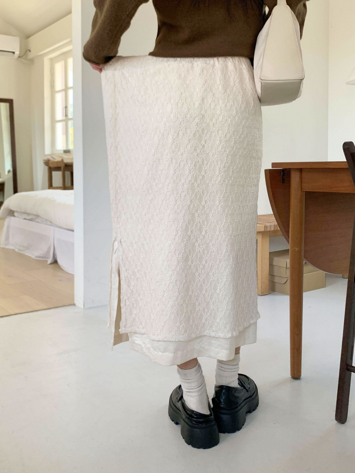 SK7541K5B-코티스 레이스 이중 레이어드 밴딩 롱 스커트