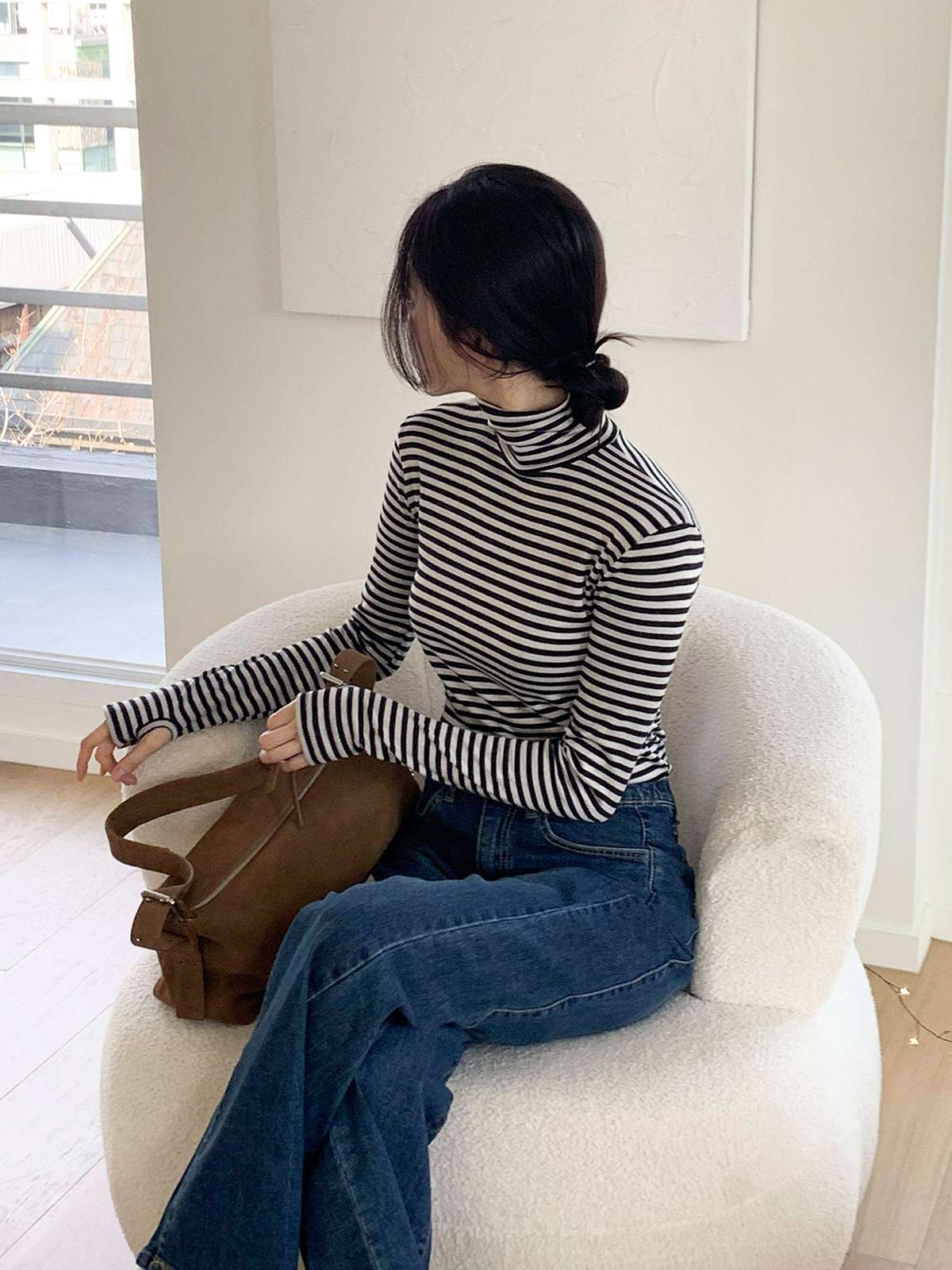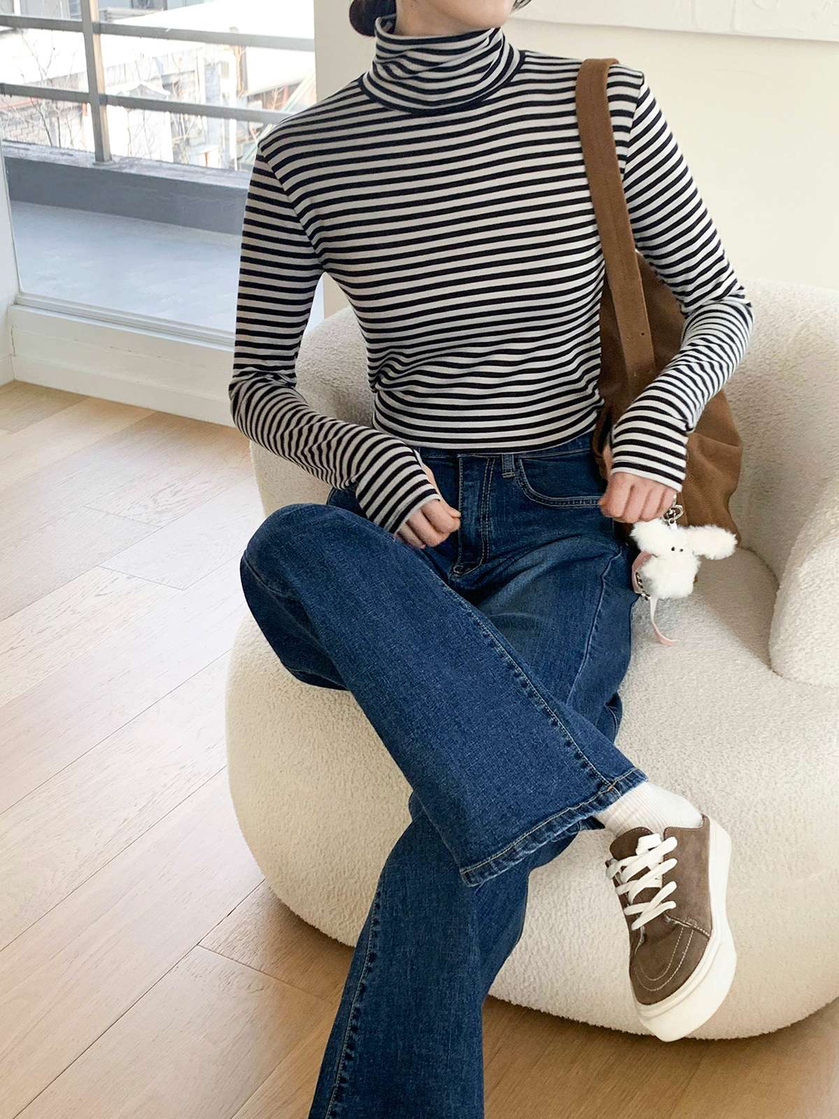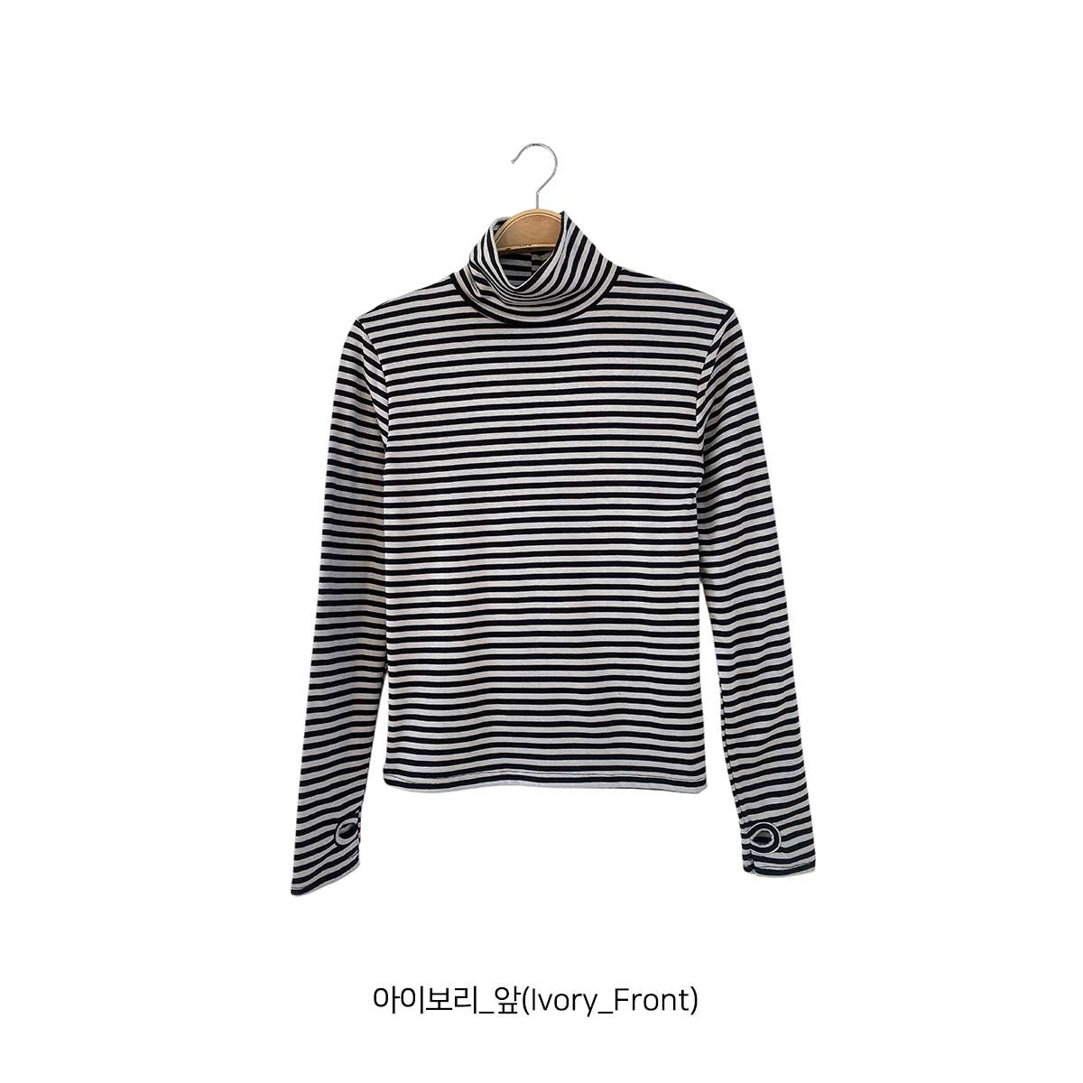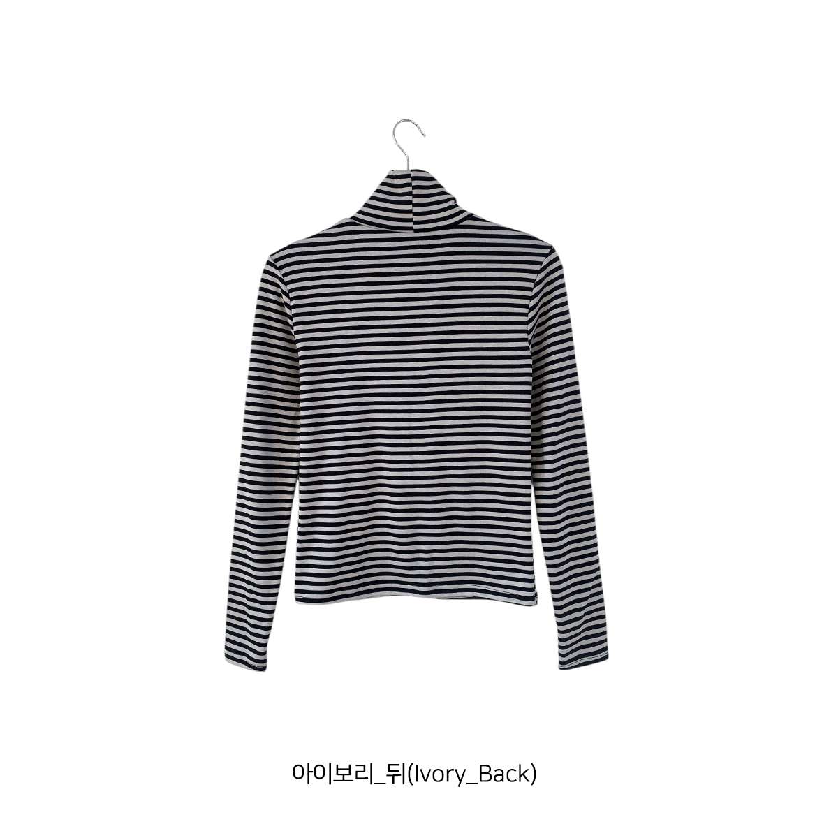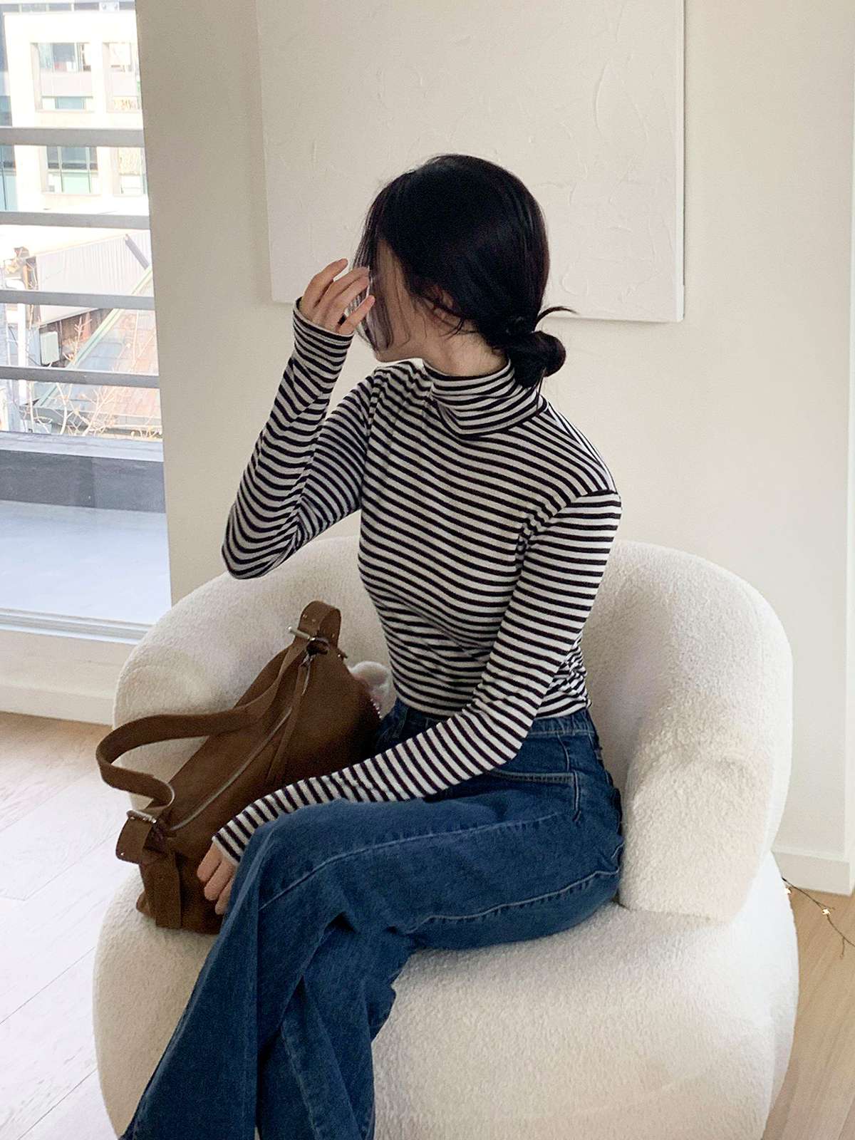 스트라이프 패턴과 목을 감싸는 터틀넥이 포근한 티셔츠예요!