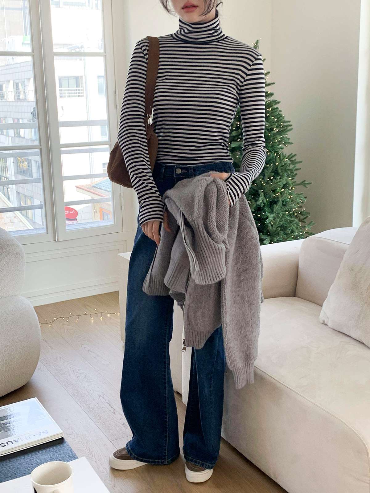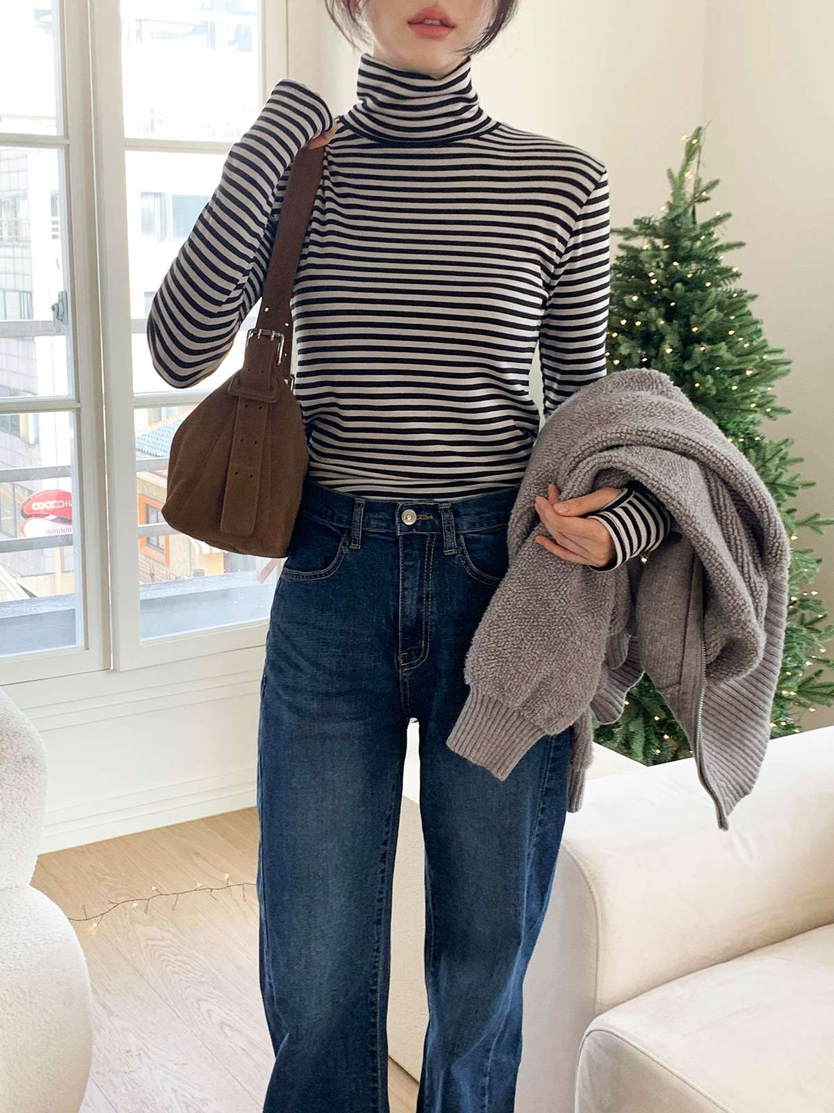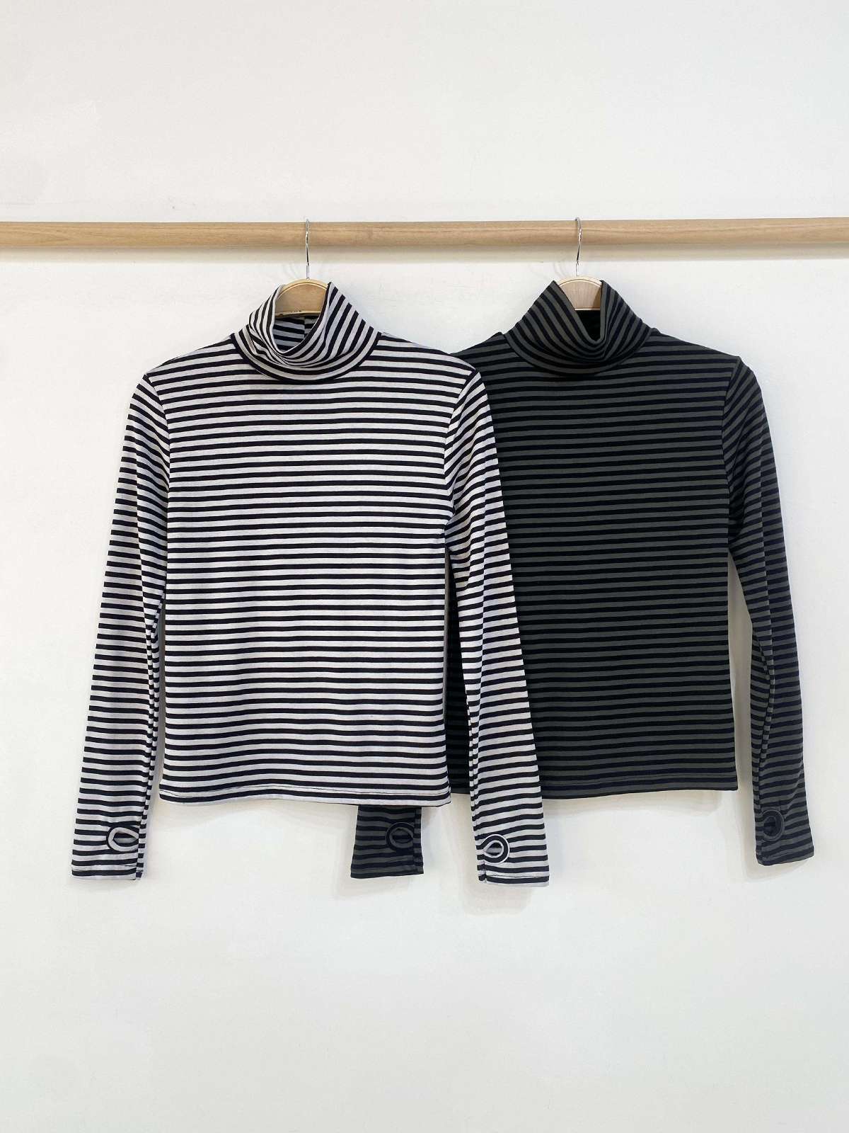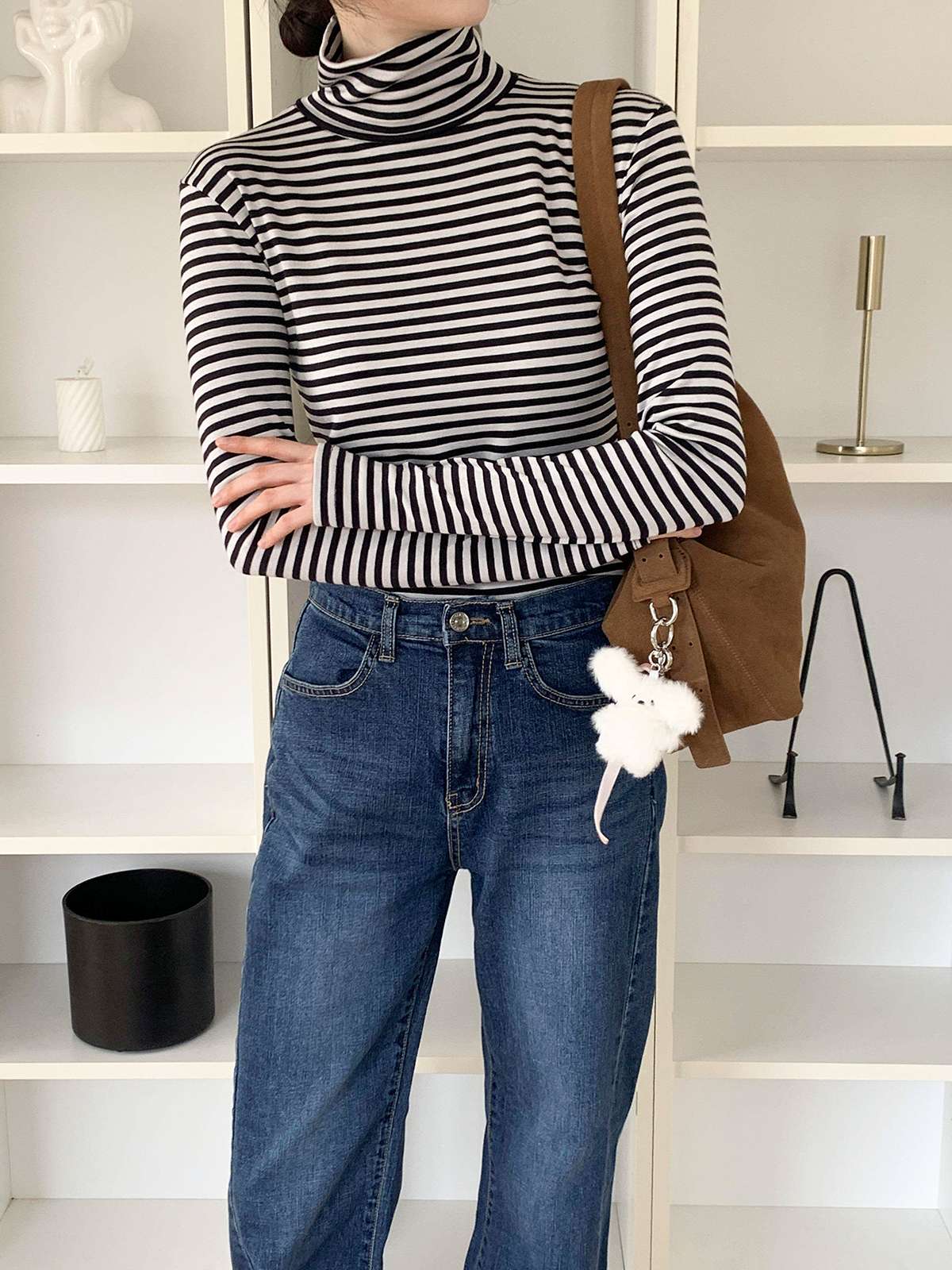 스트라이프 패턴과 목을 감싸는 터틀넥이 포근한 티셔츠예요!