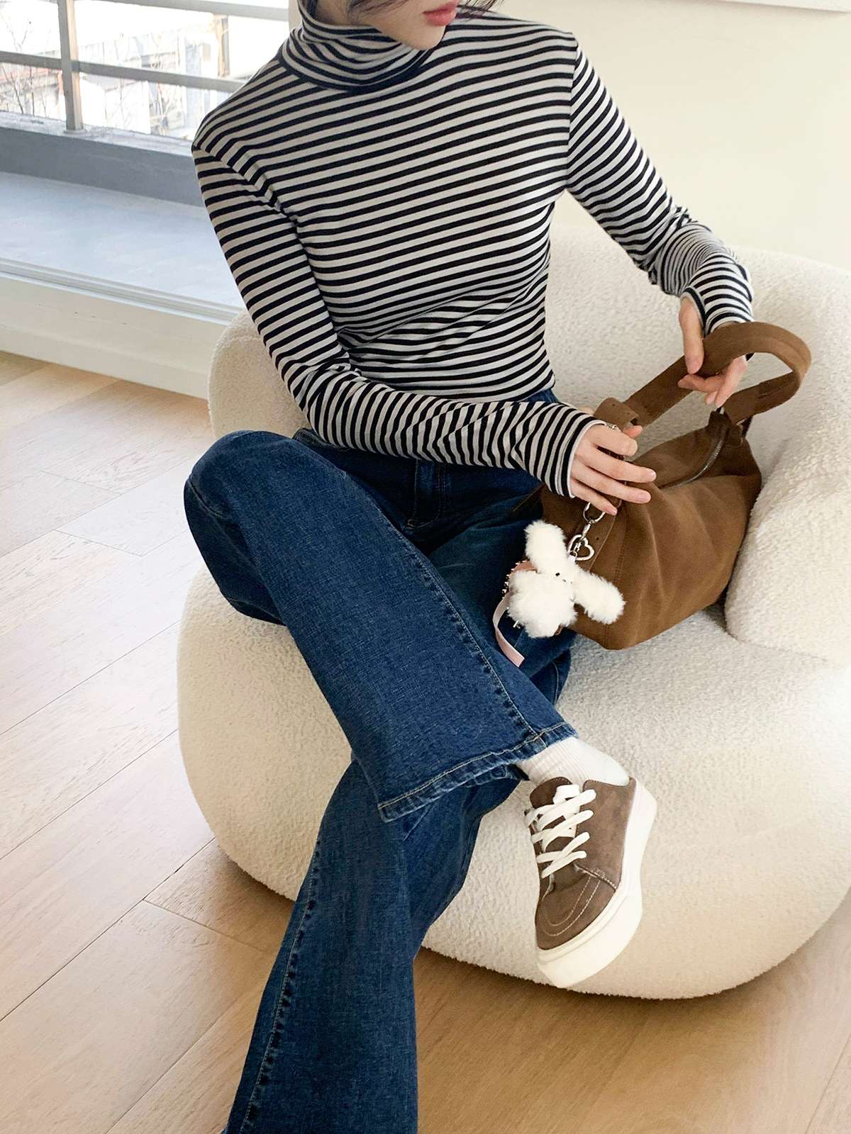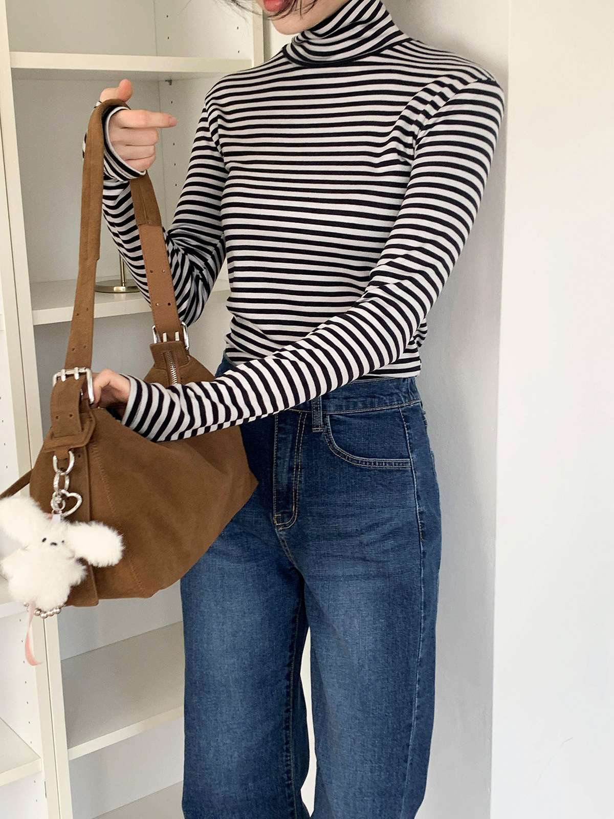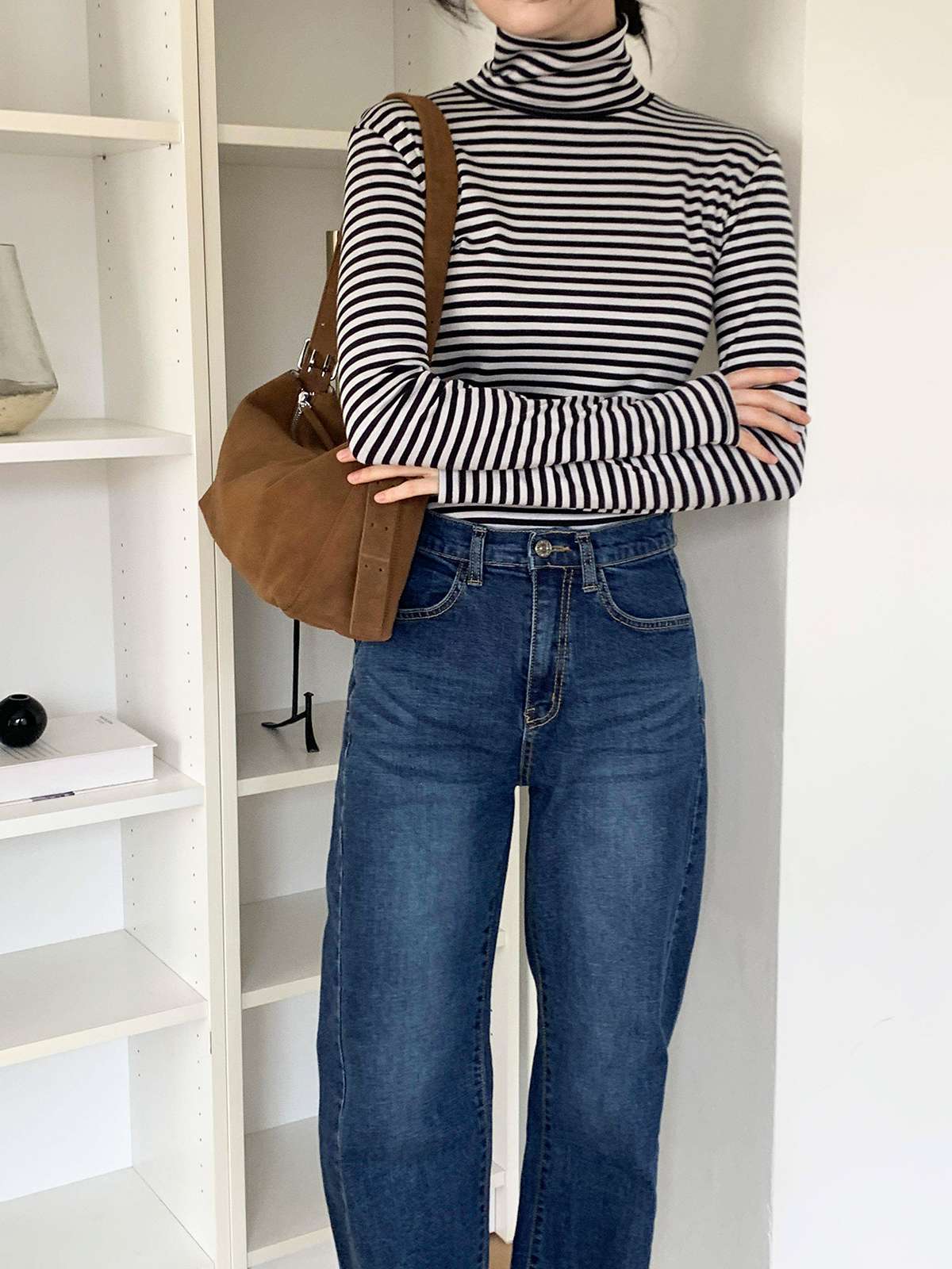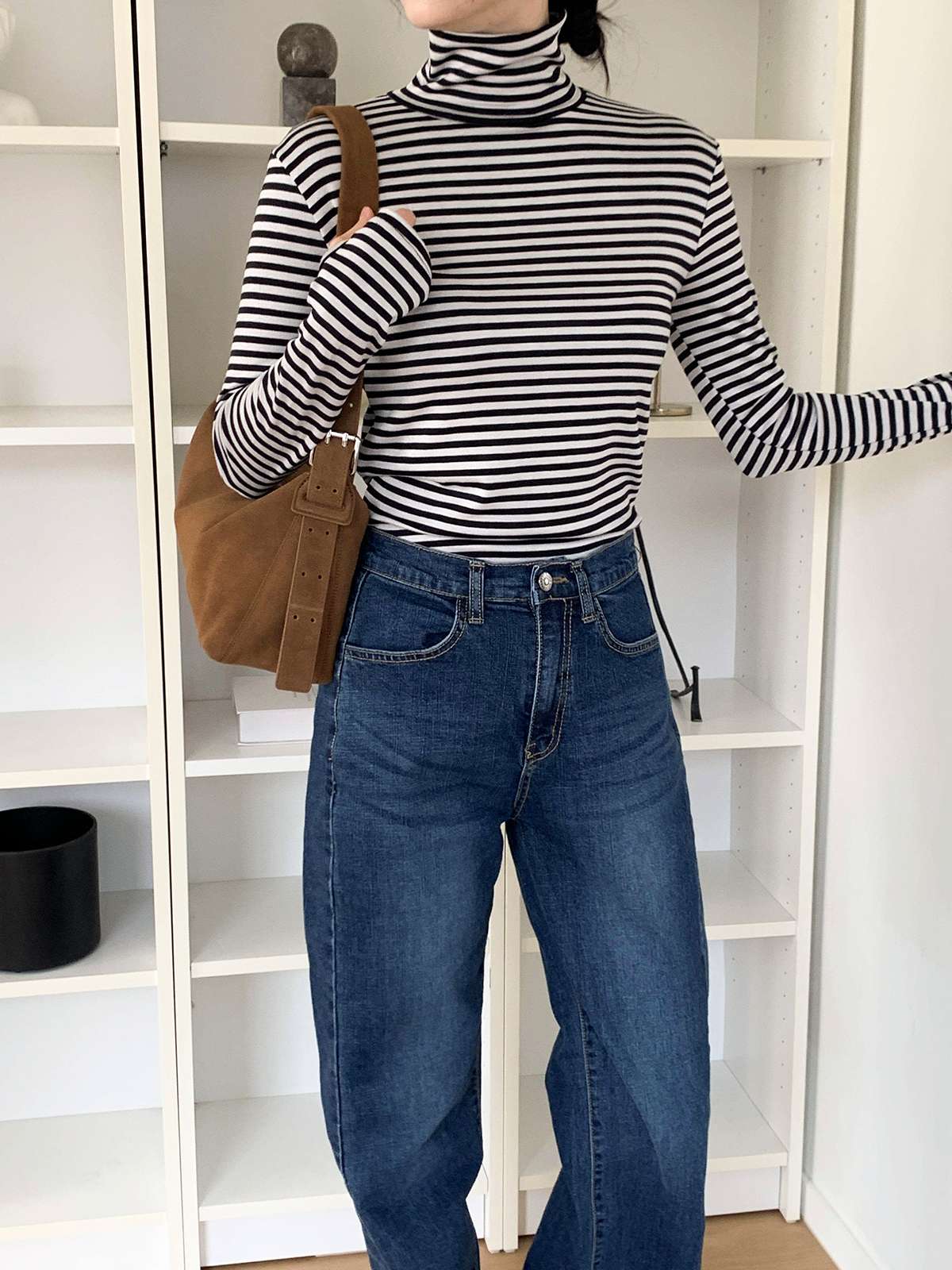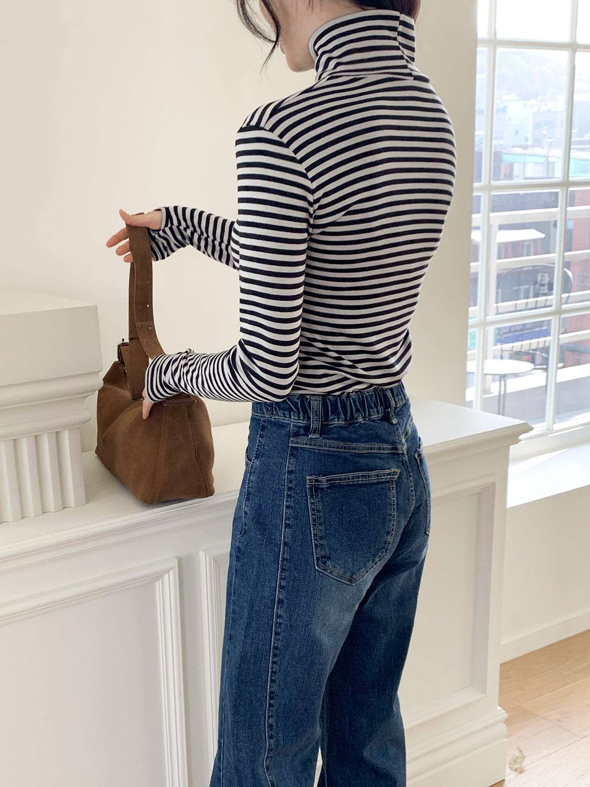 스트라이프 패턴과 목을 감싸는 터틀넥이 포근한 티셔츠예요!