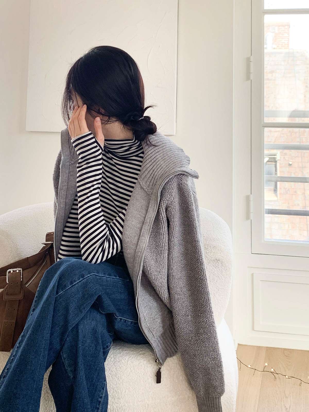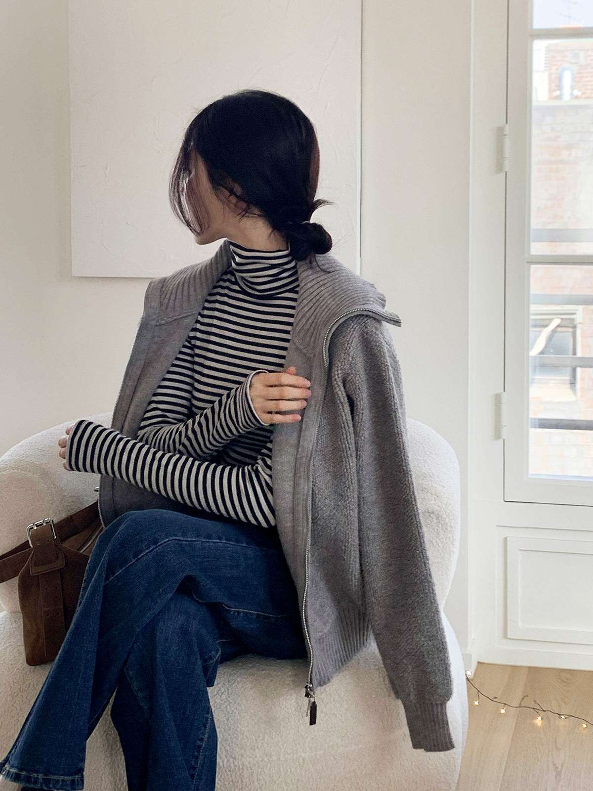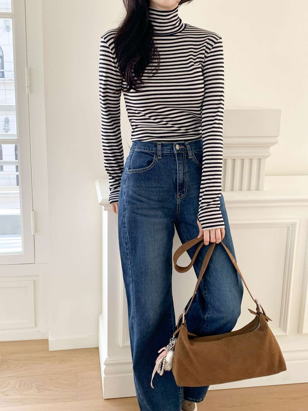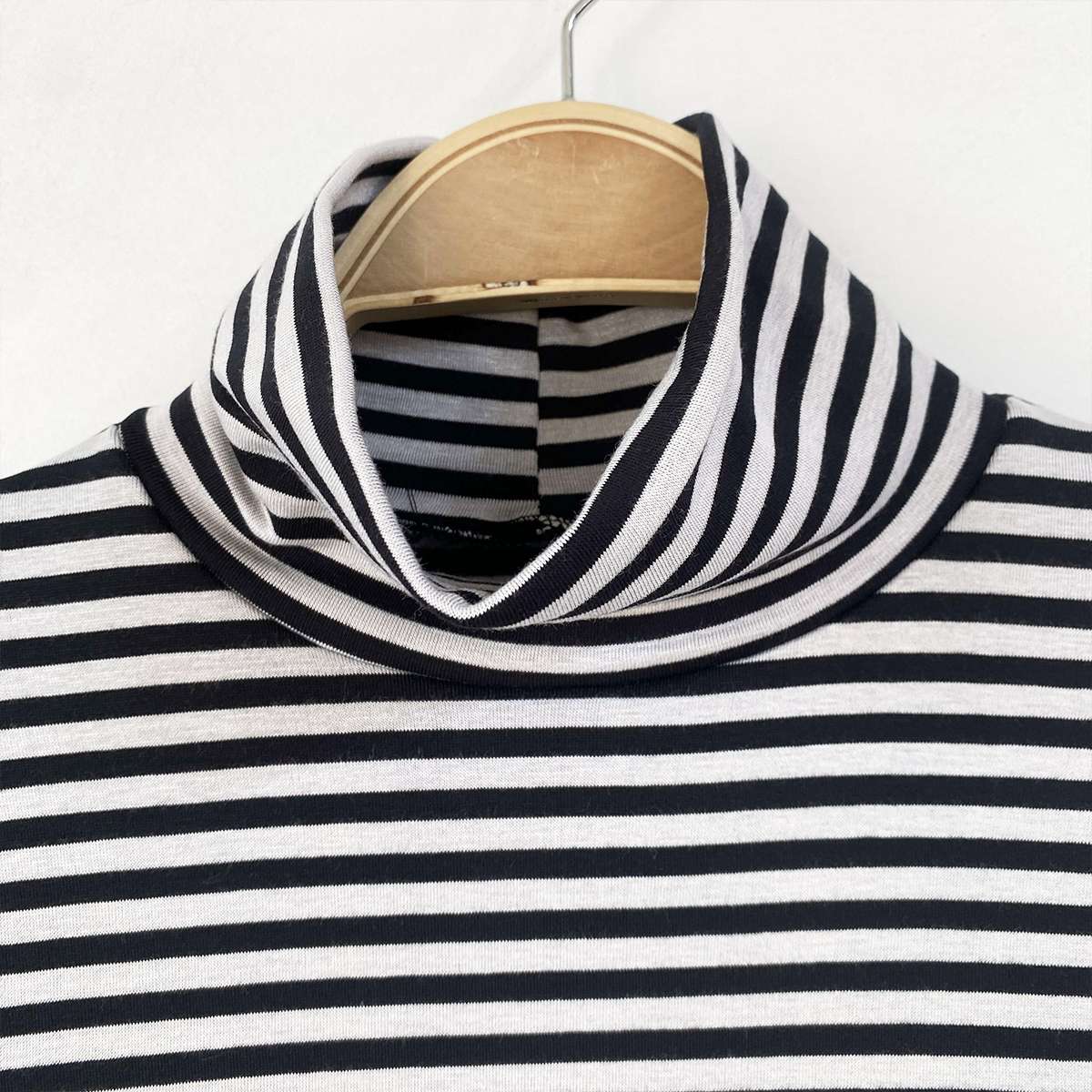 스트라이프 패턴과 목을 감싸는 터틀넥이 포근한 티셔츠예요!
