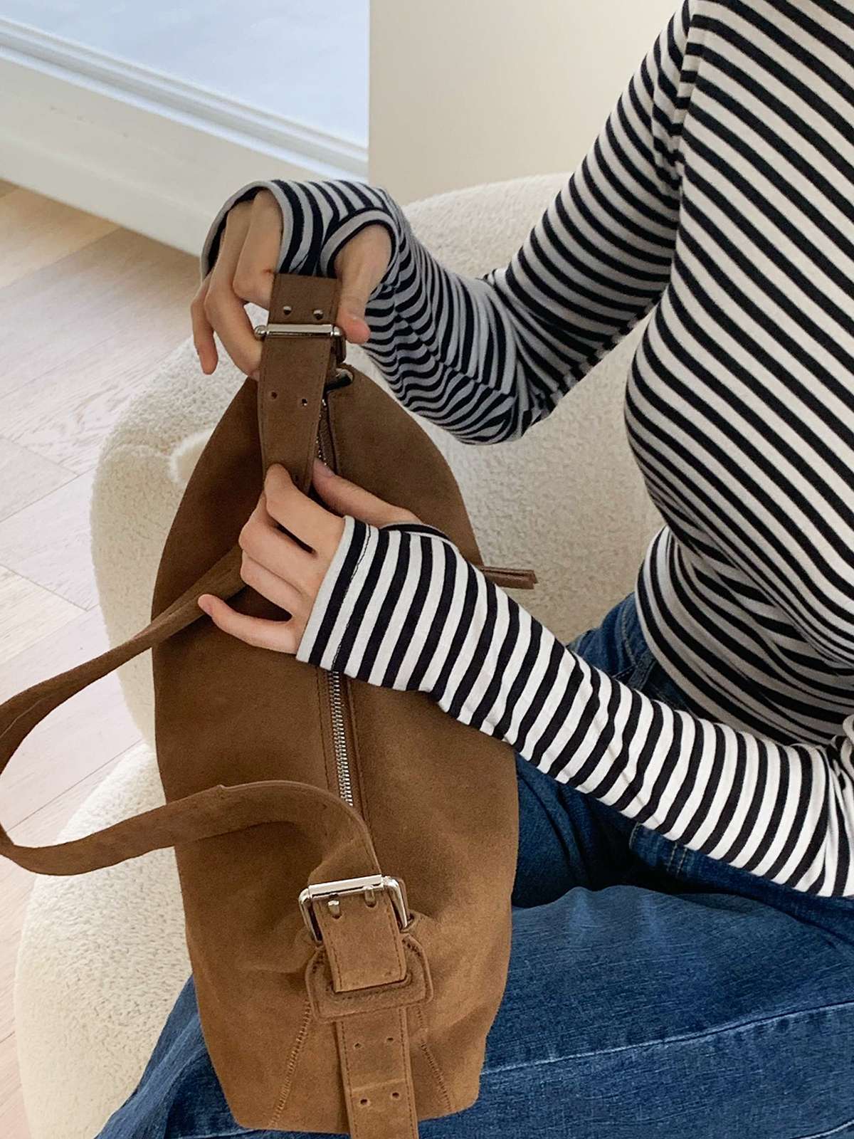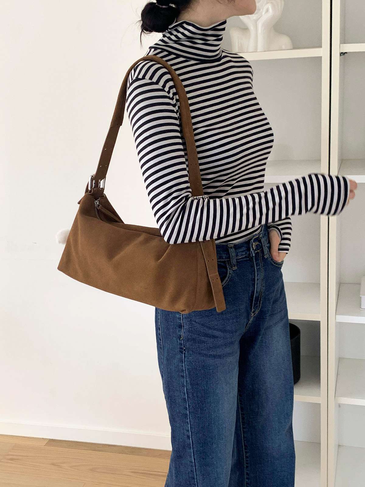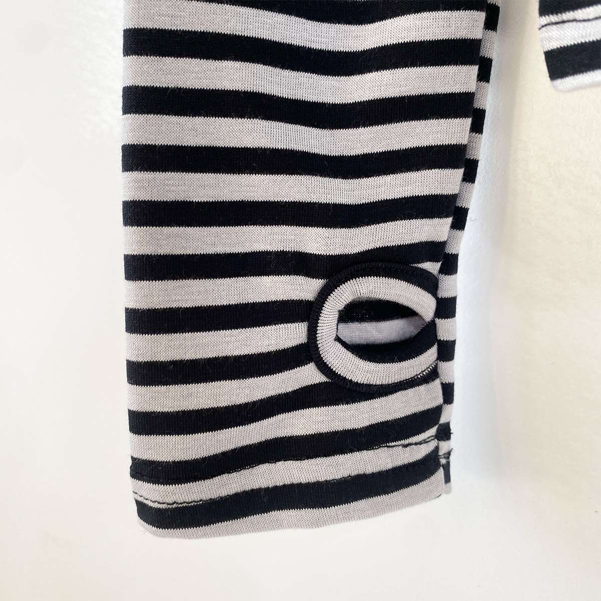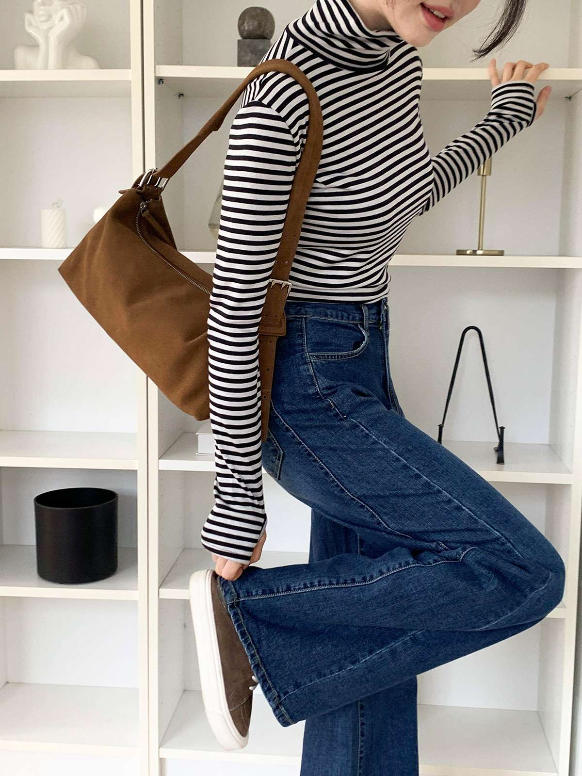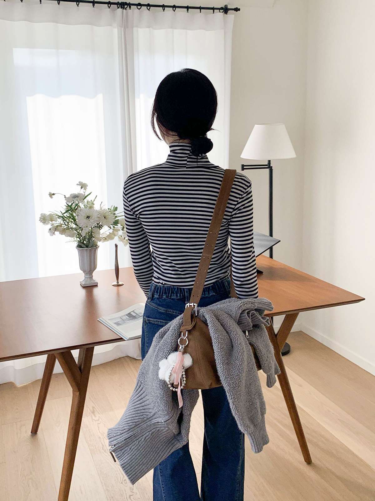 스트라이프 패턴과 목을 감싸는 터틀넥이 포근한 티셔츠예요!