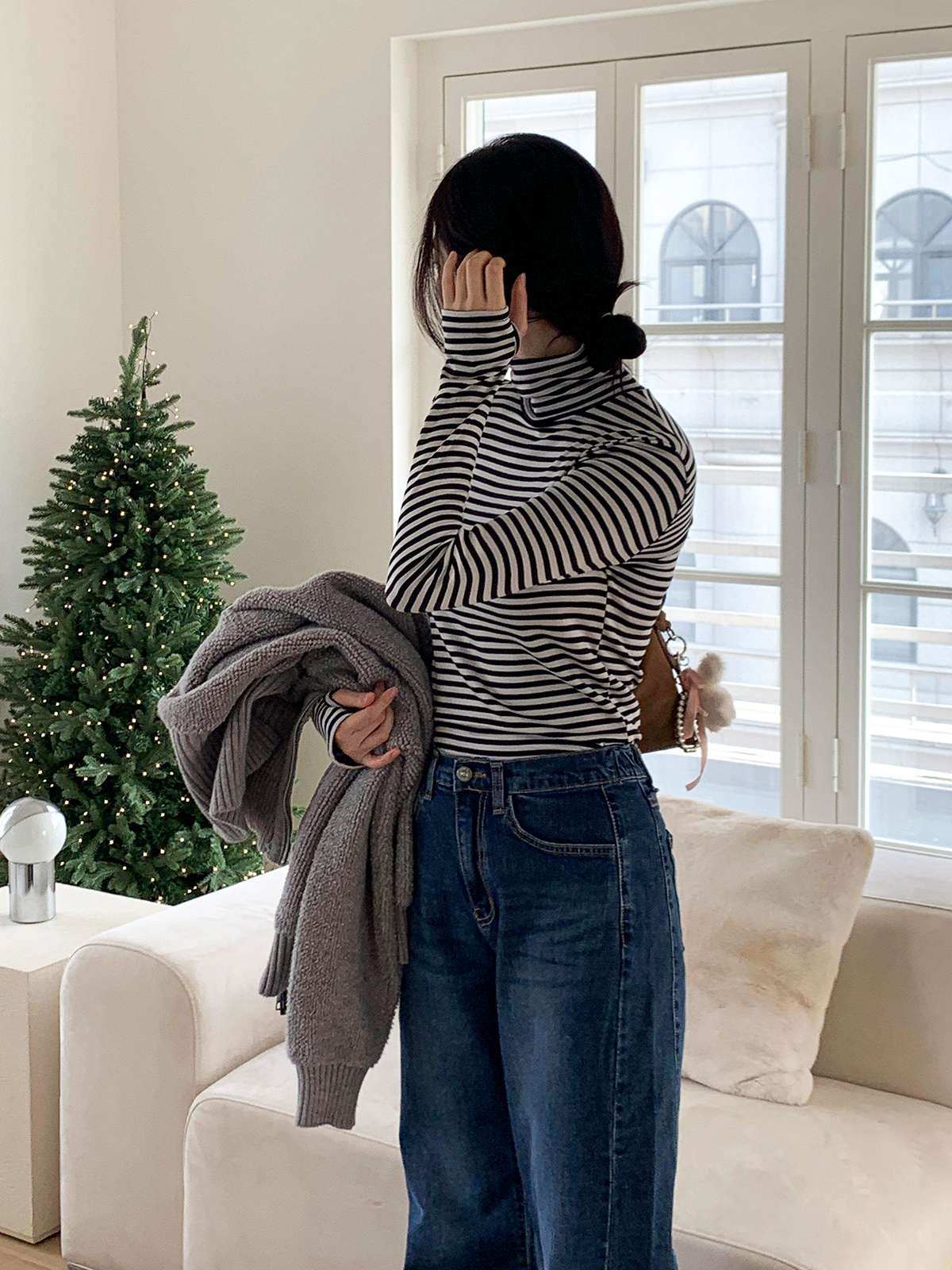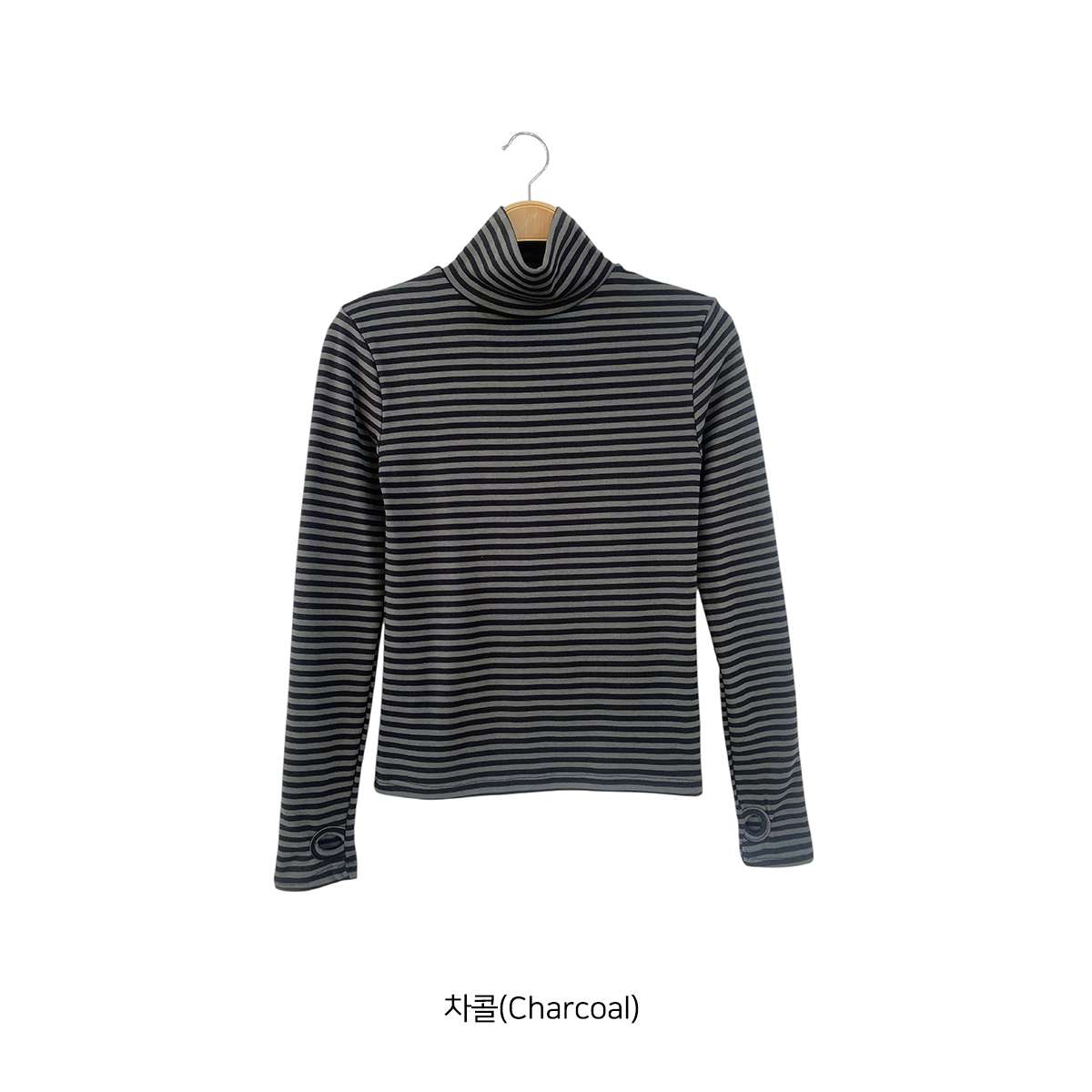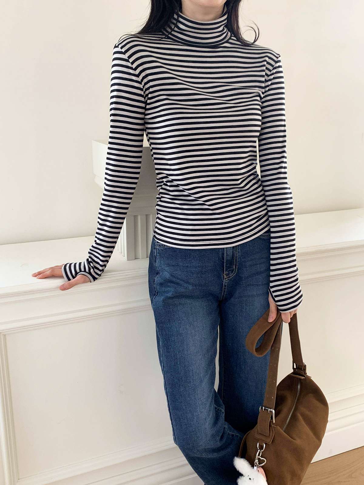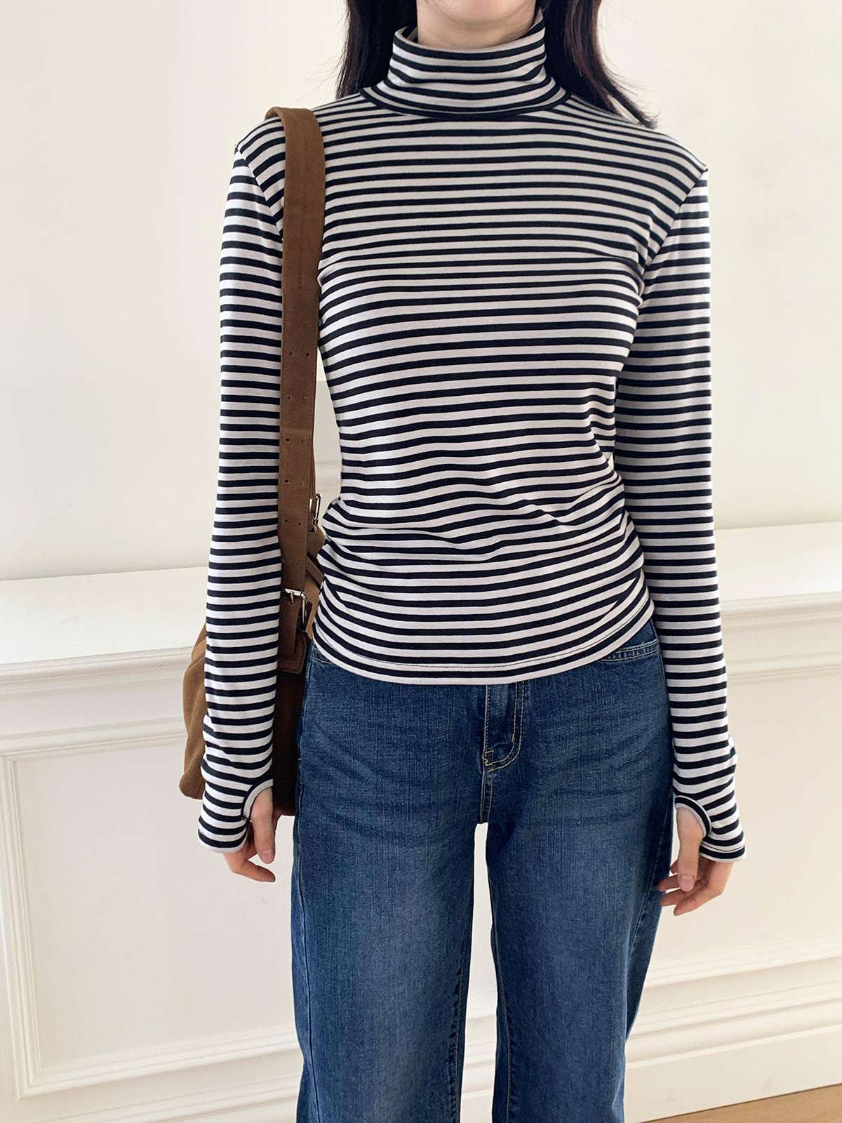트라이프 패턴과 목을 감싸는 터틀넥이 포근한 기모 티셔츠