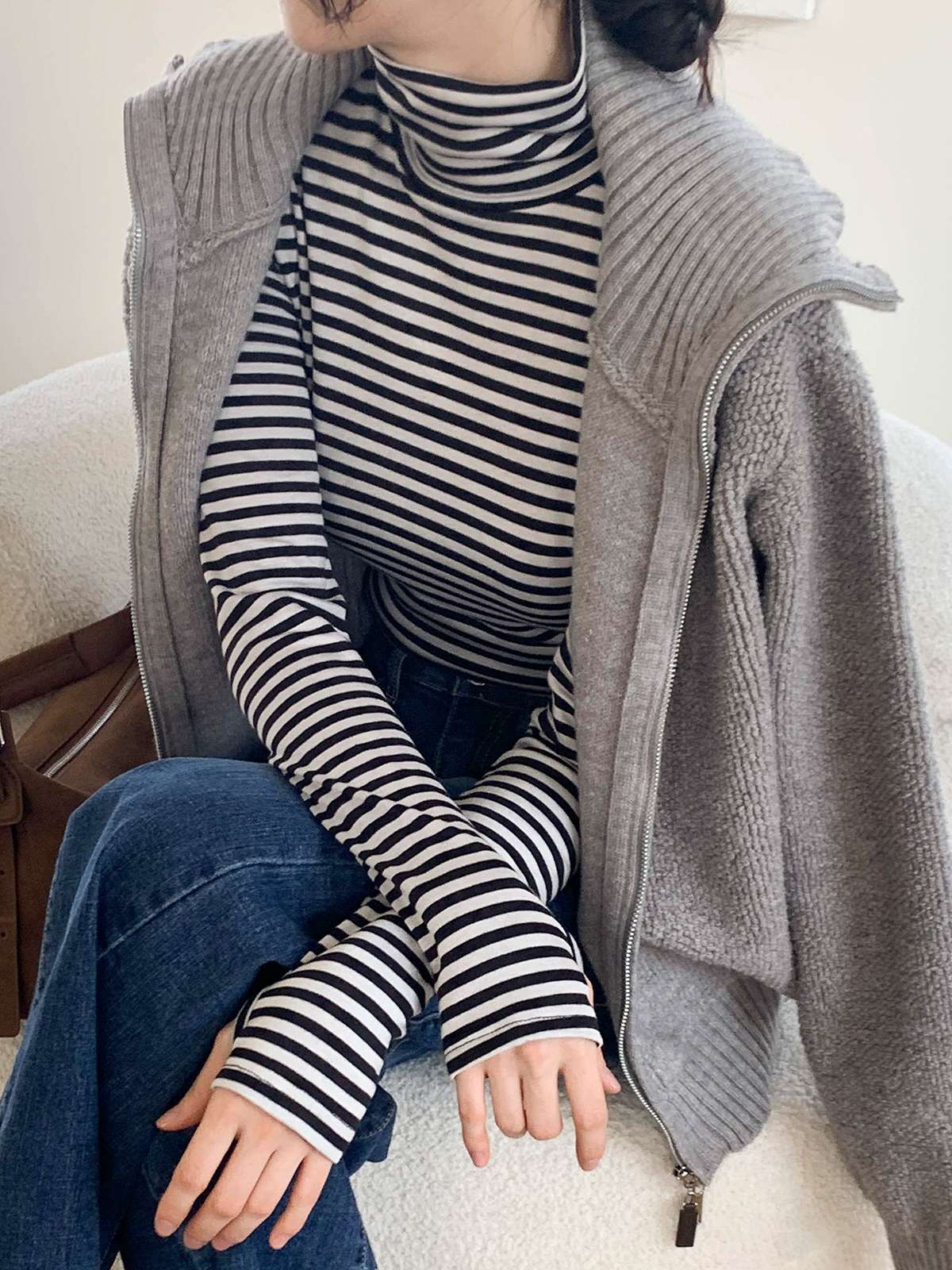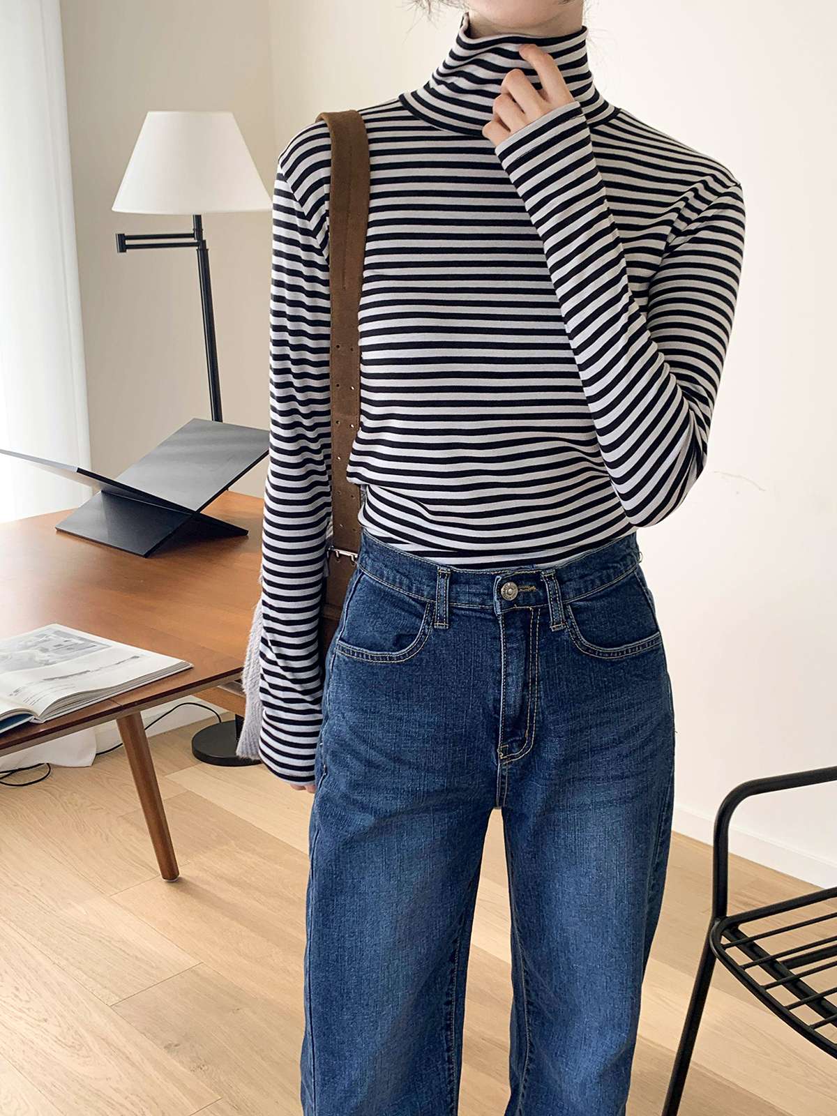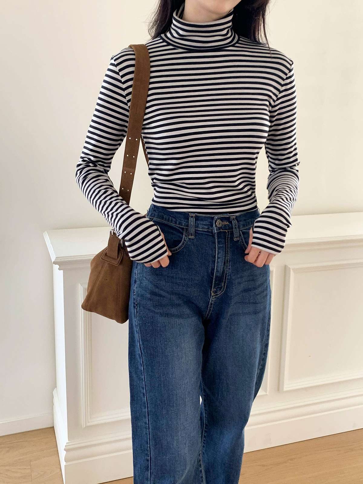 트라이프 패턴과 목을 감싸는 터틀넥이 포근한 기모 티셔츠