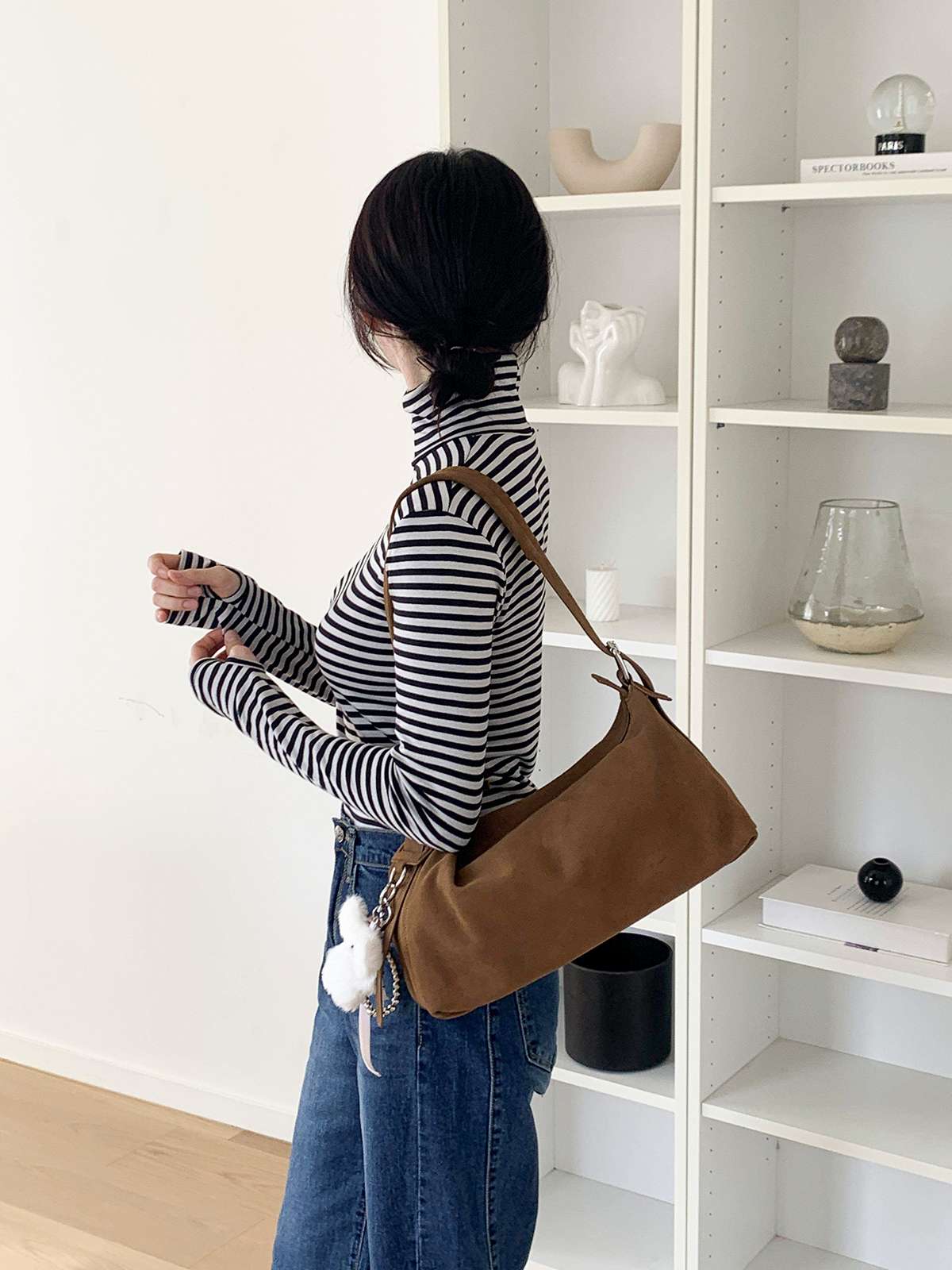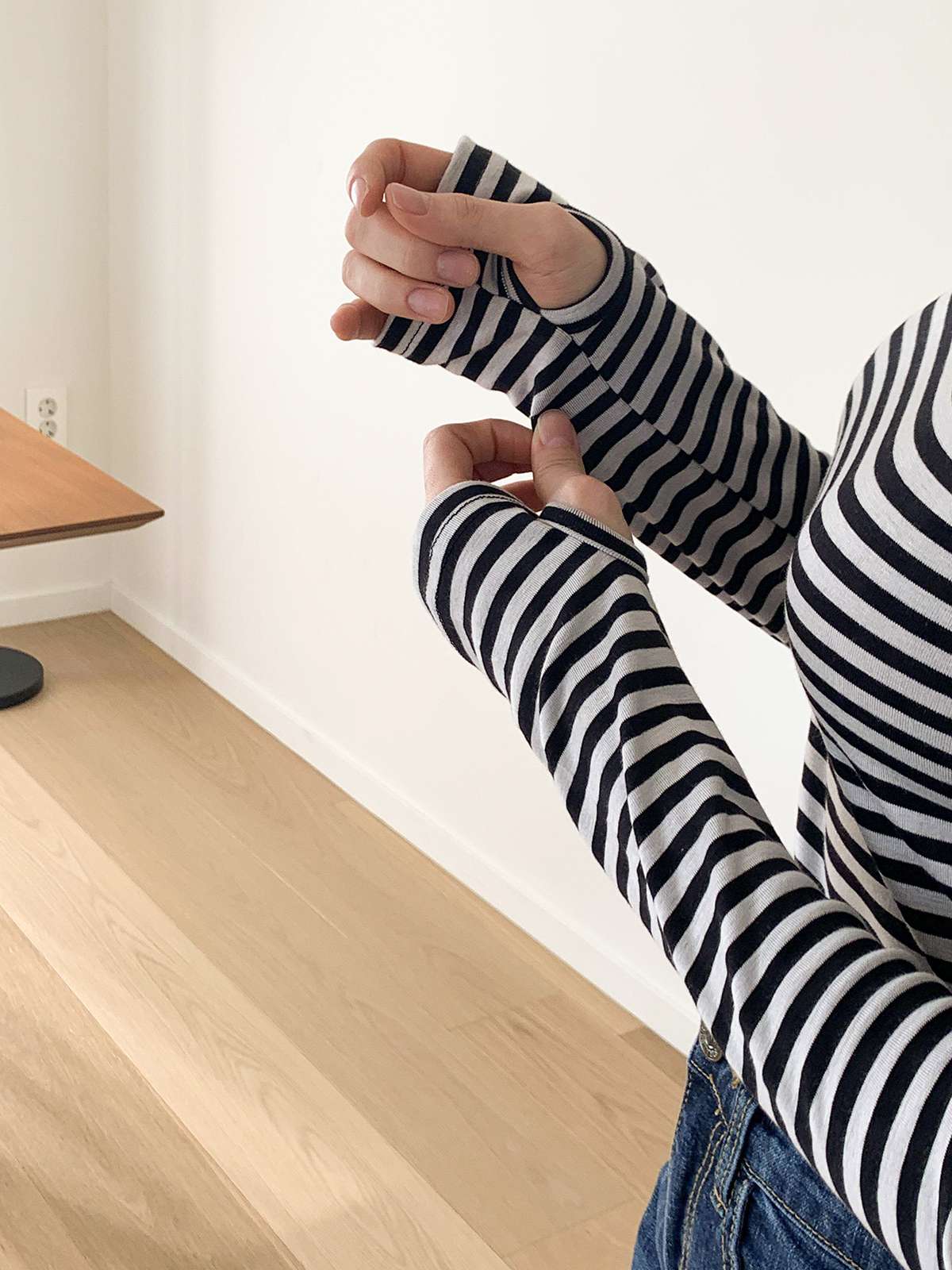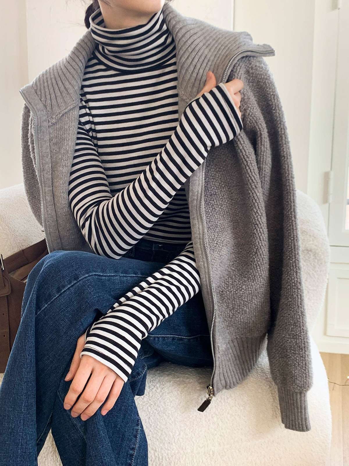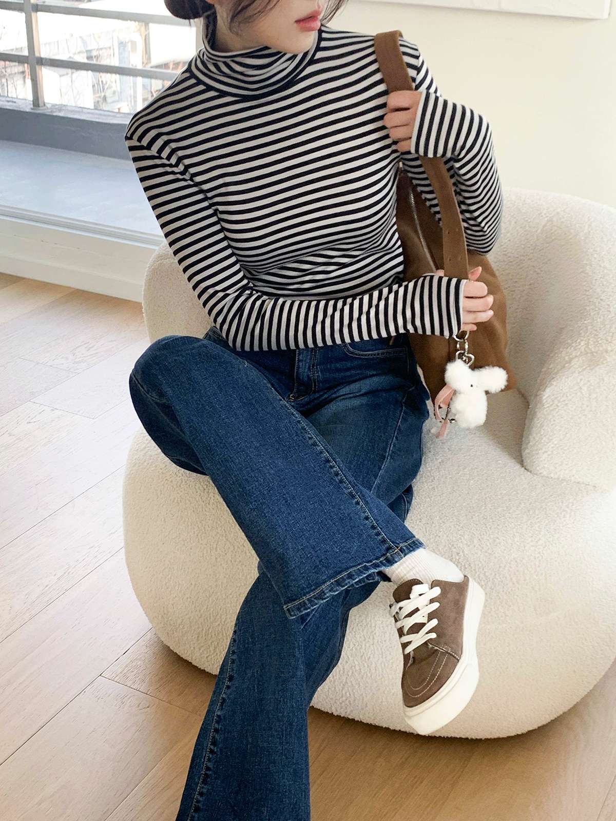 트라이프 패턴과 목을 감싸는 터틀넥이 포근한 기모 티셔츠