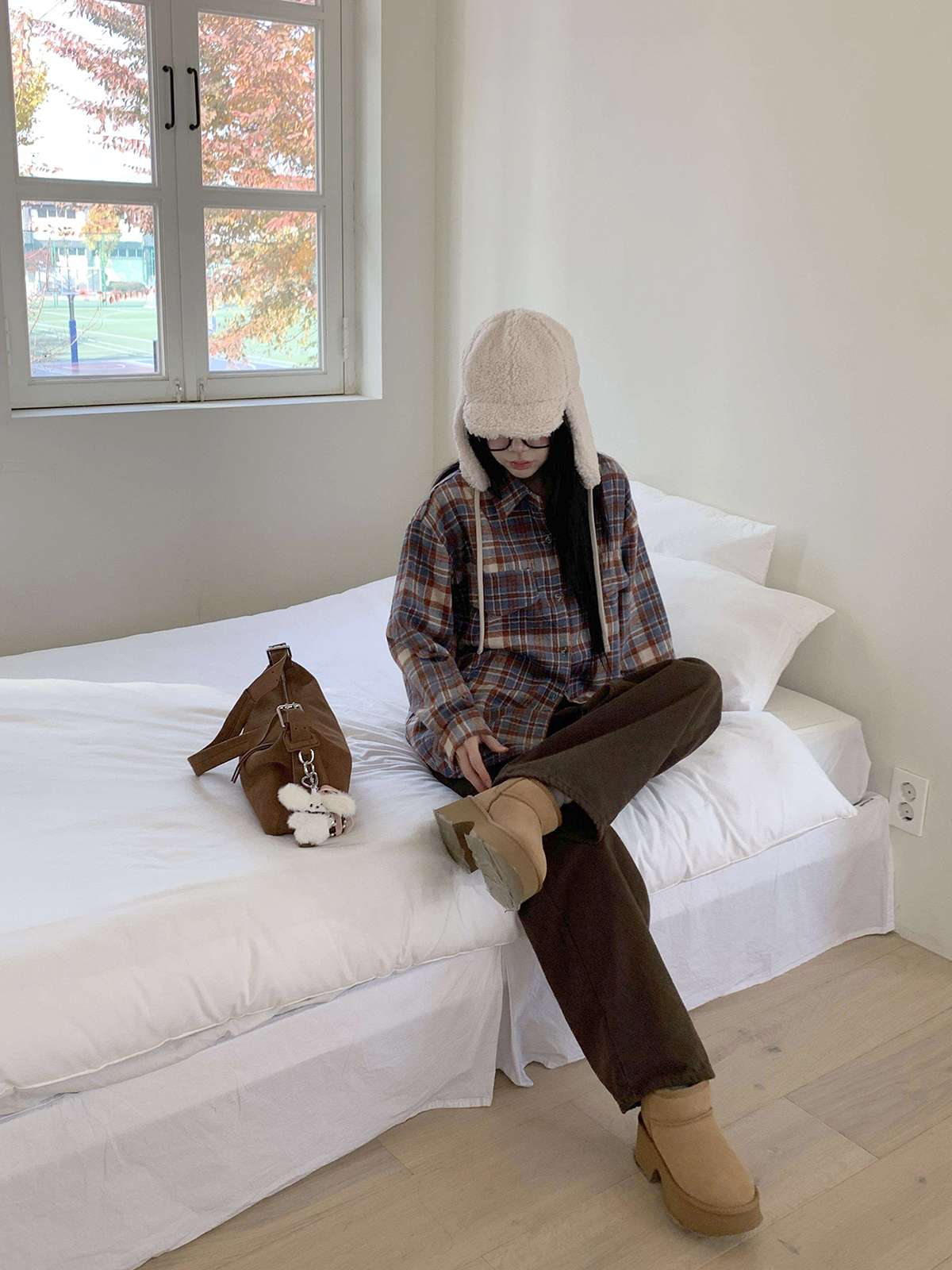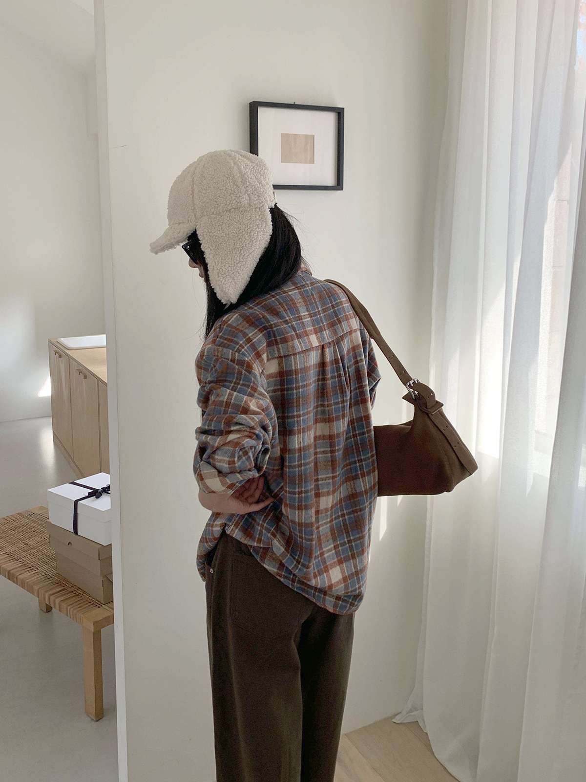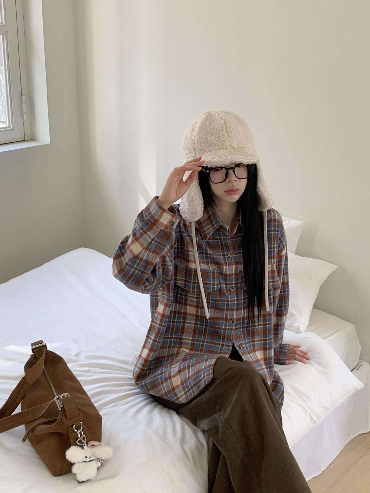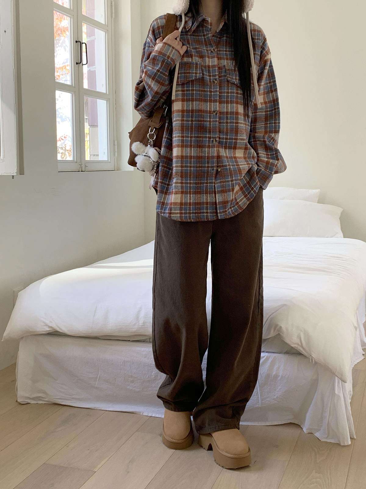 부드러운 피치 기모로 제작된 오버핏 체크 셔츠