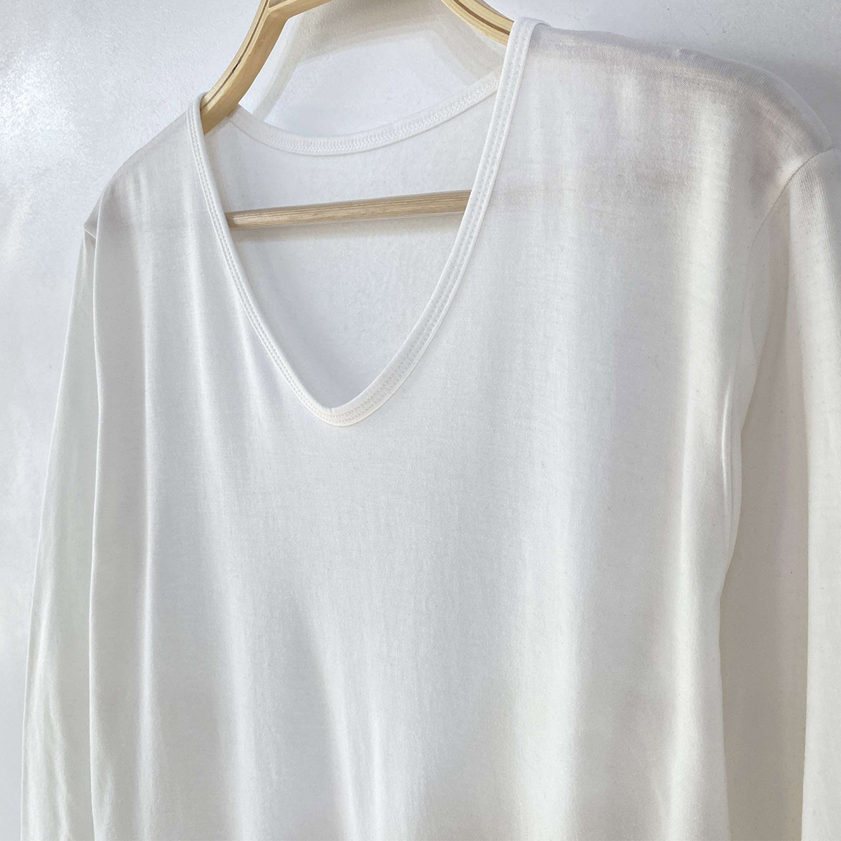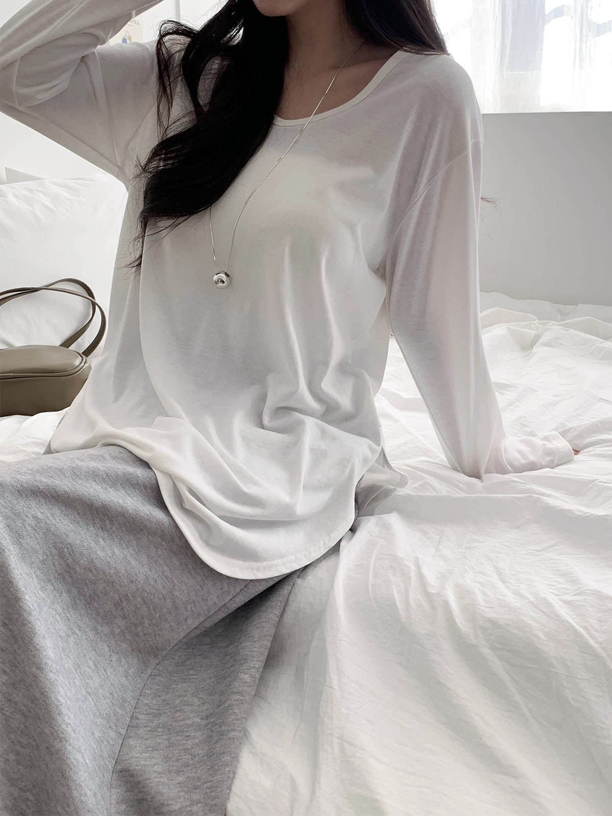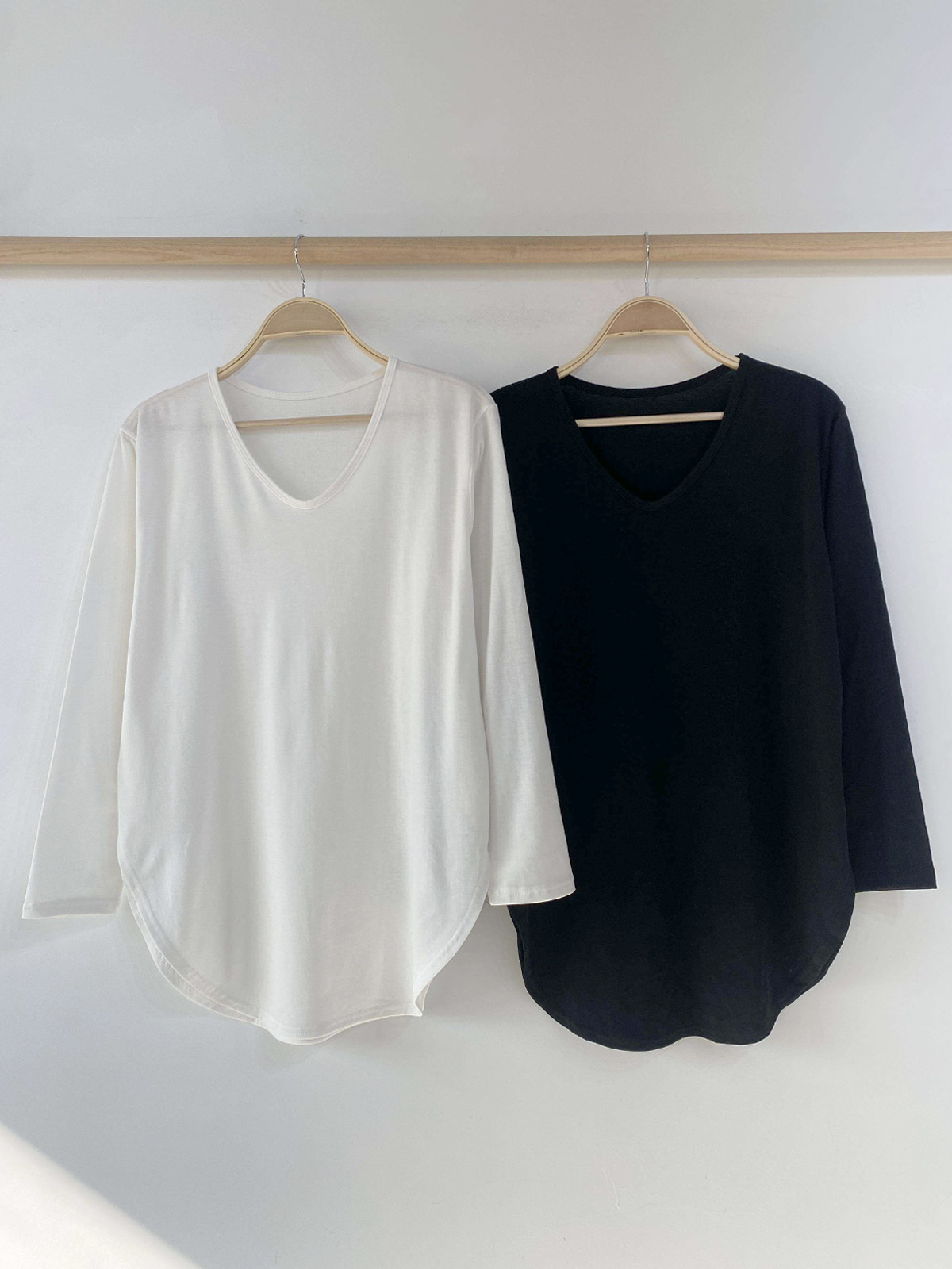 넉넉한 사이즈 핏의 브이넥 라인이 깔끔한 긴팔 티셔츠