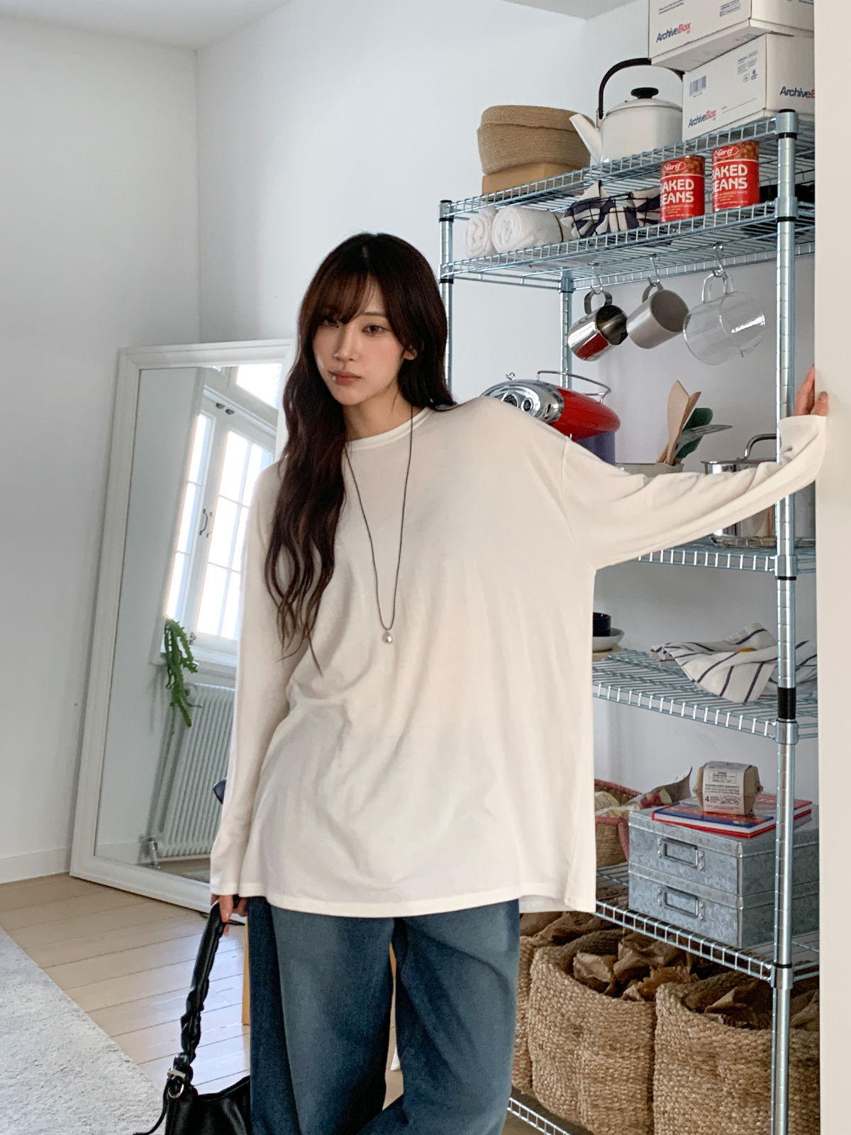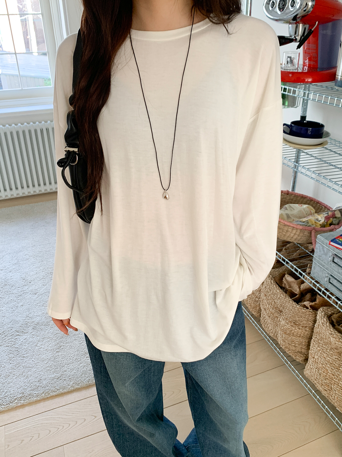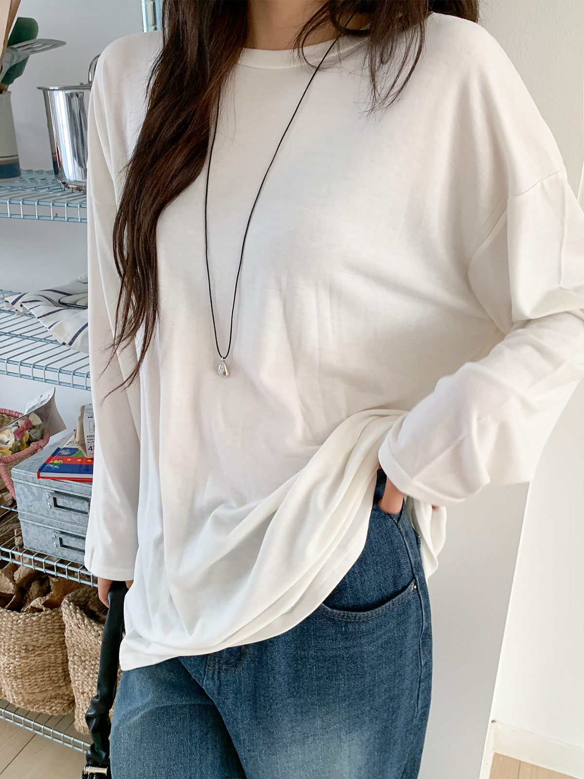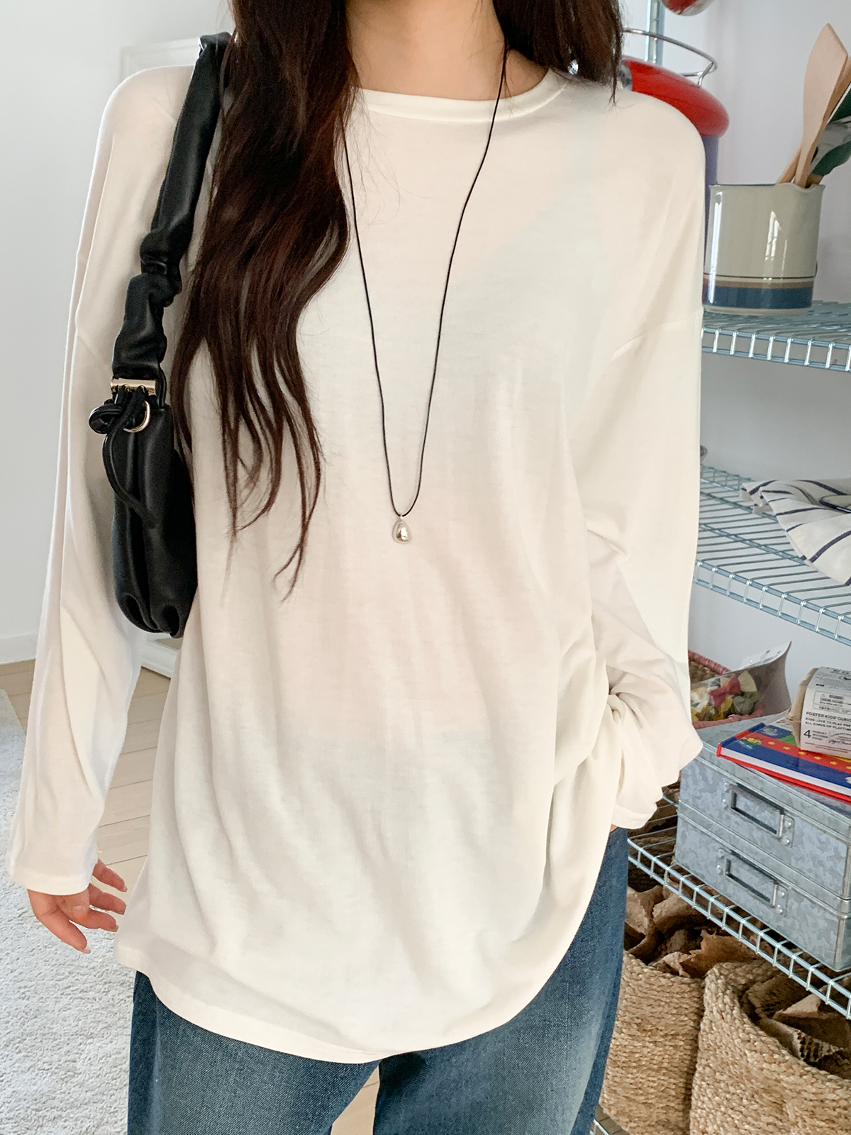 넉넉한 오버핏의 라운드넥 긴팔 티셔츠입니다!