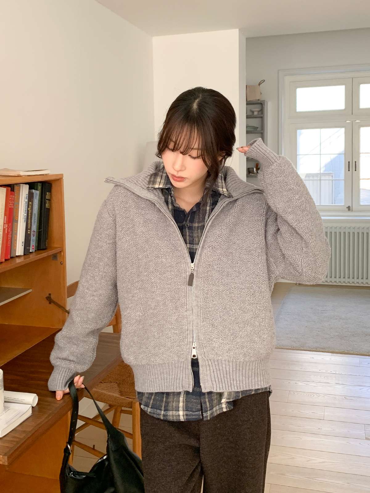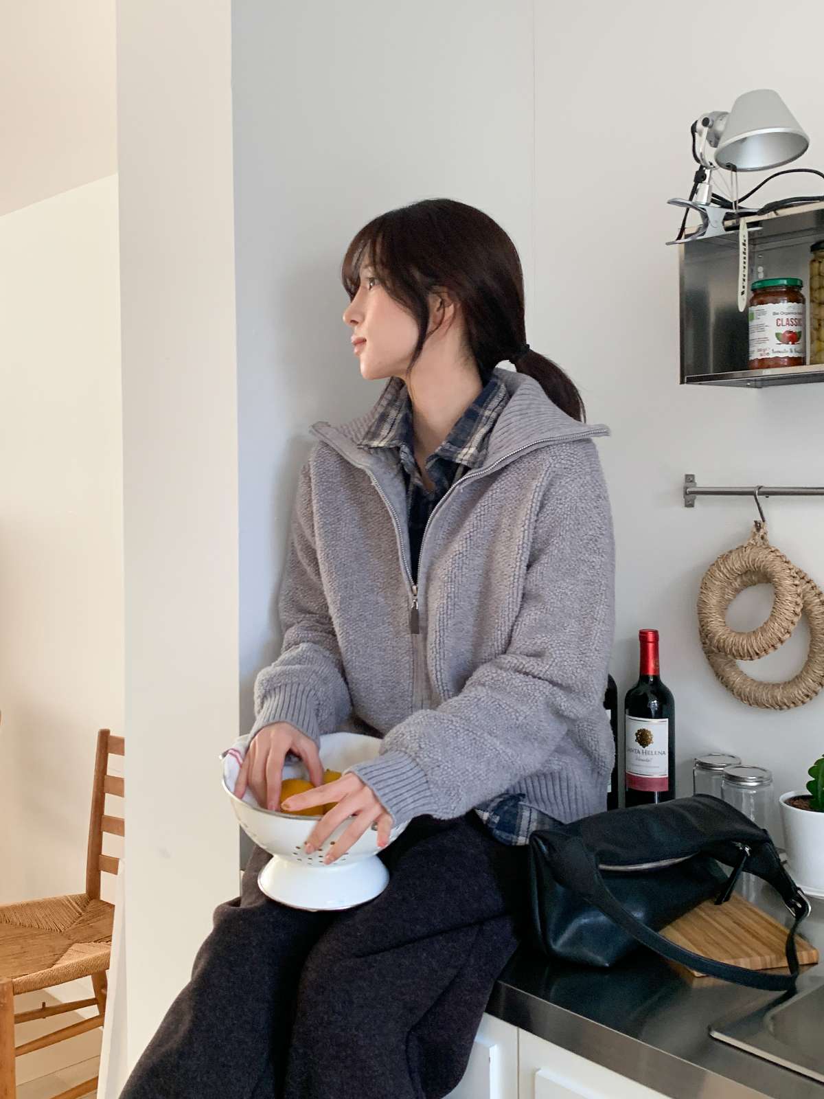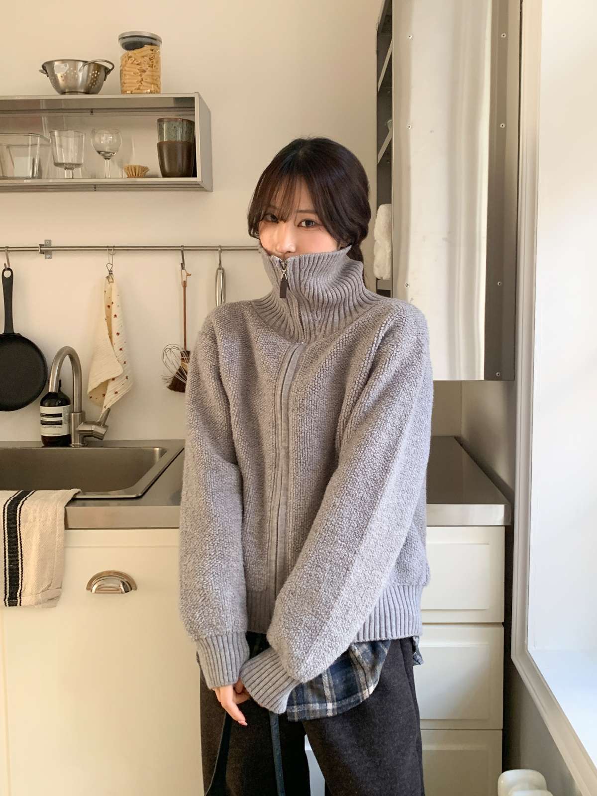목을 감싸는 도톰한 하이넥 디자인의 니트 집업