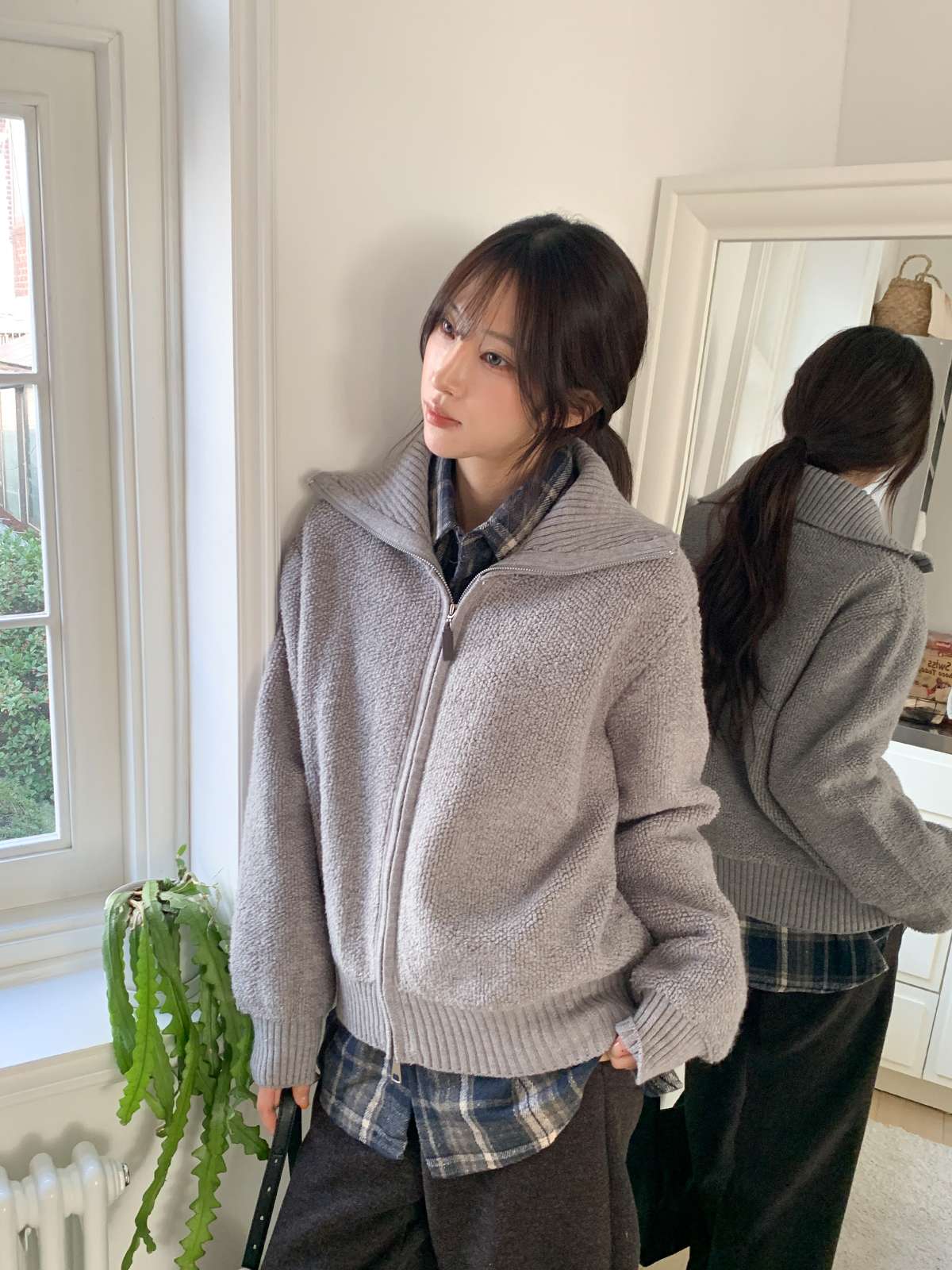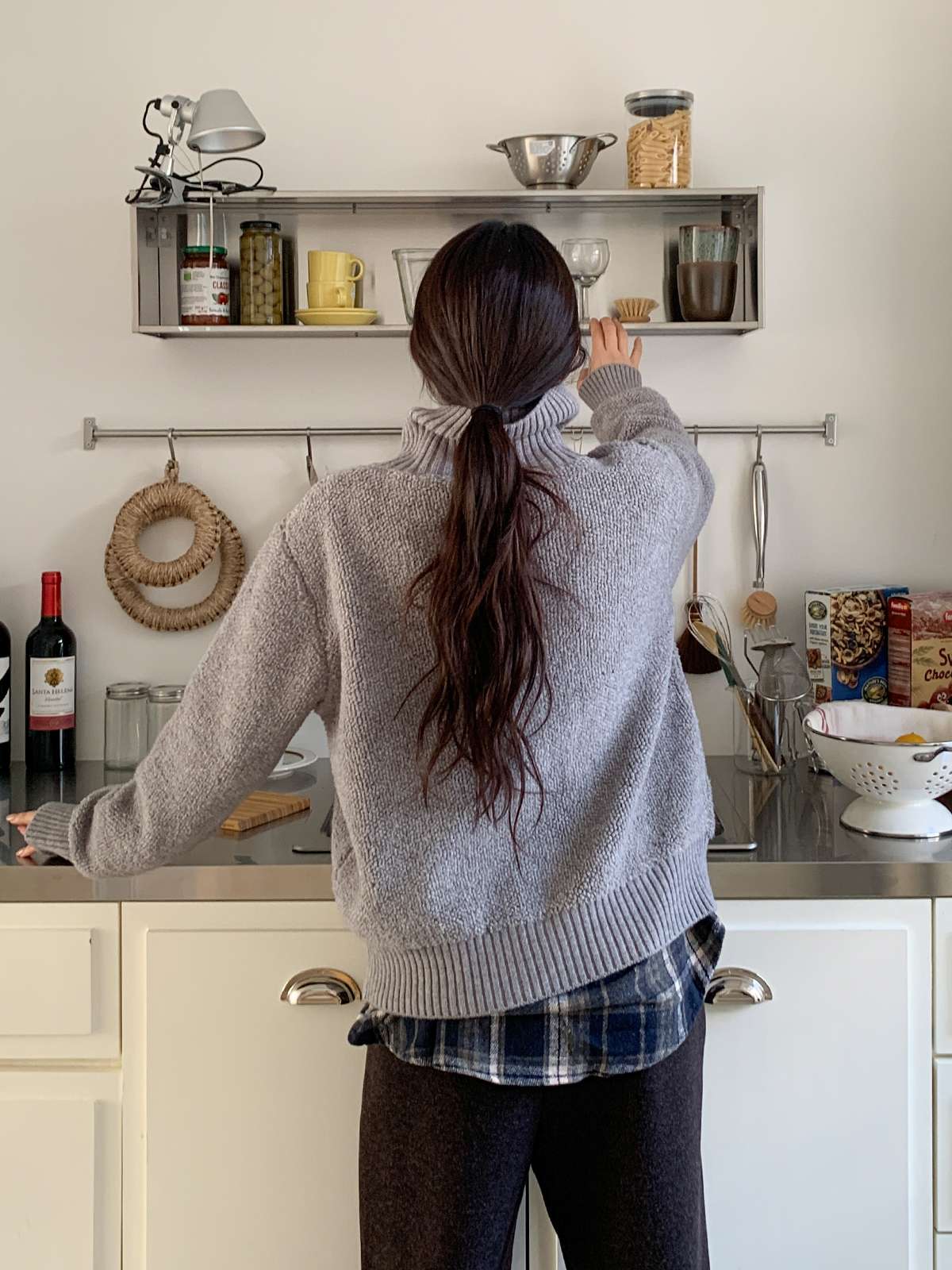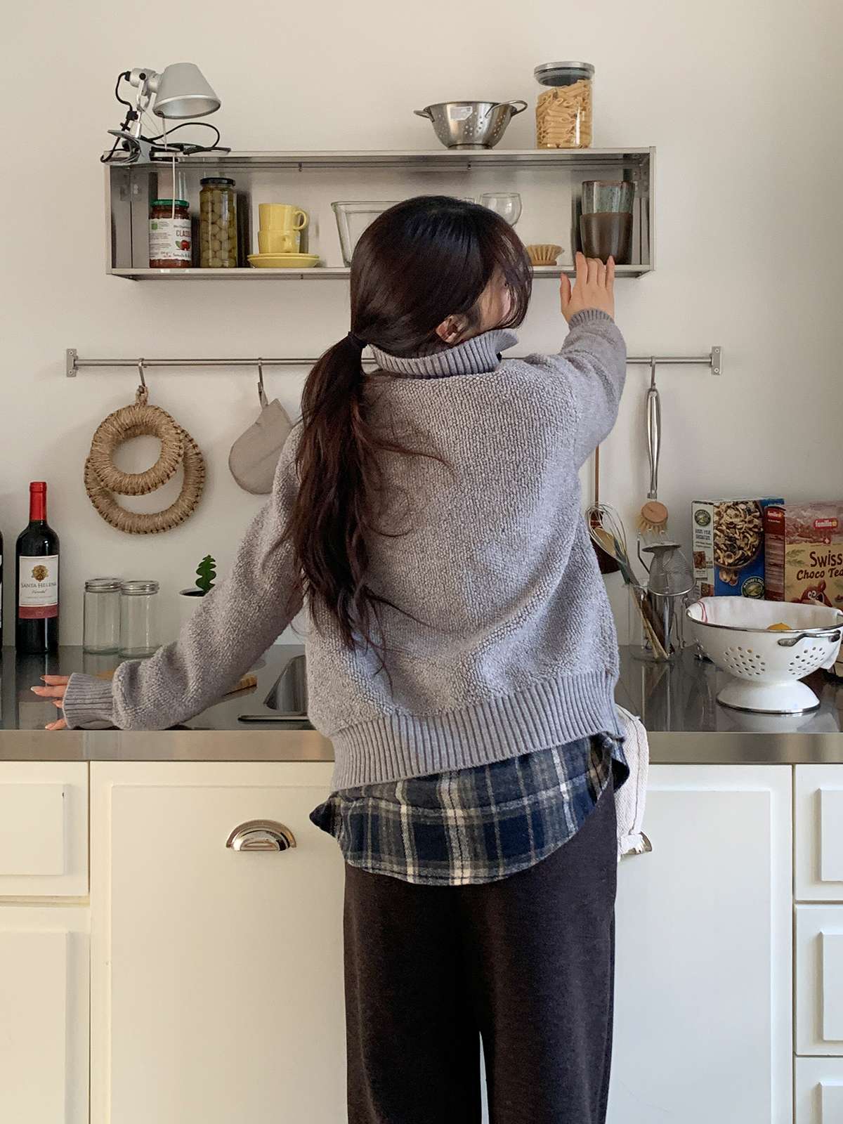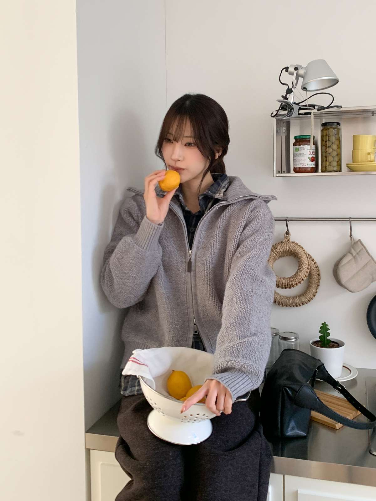 목을 감싸는 도톰한 하이넥 디자인의 니트 집업