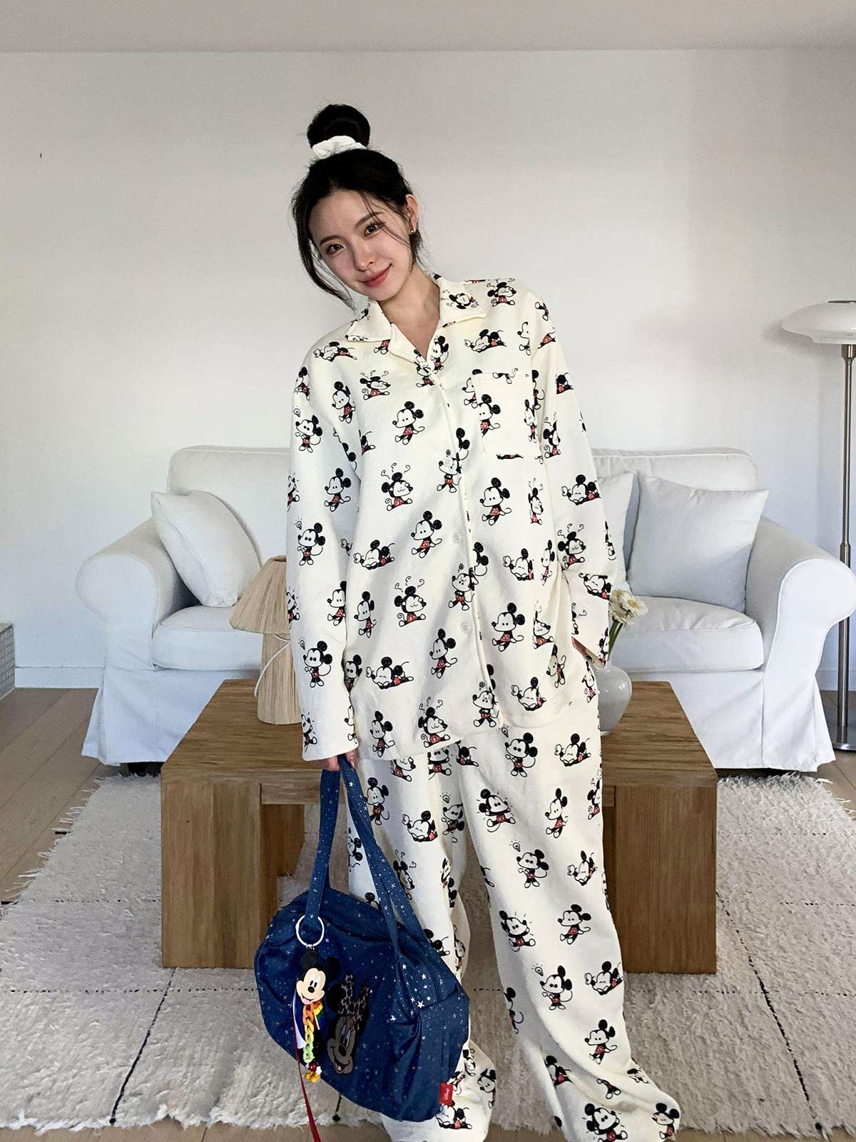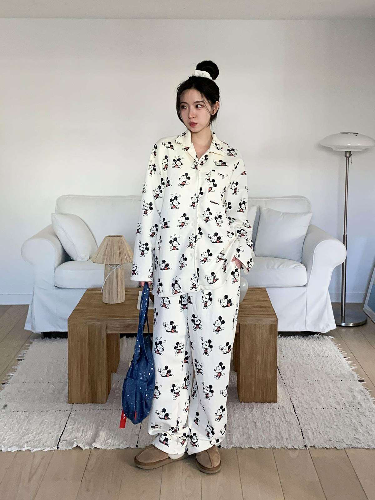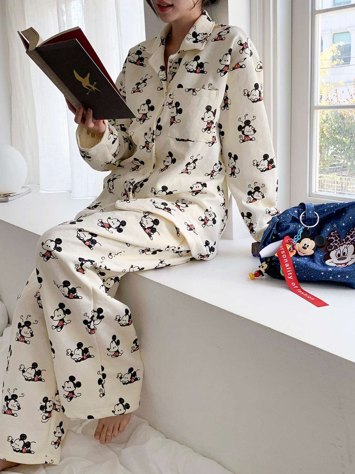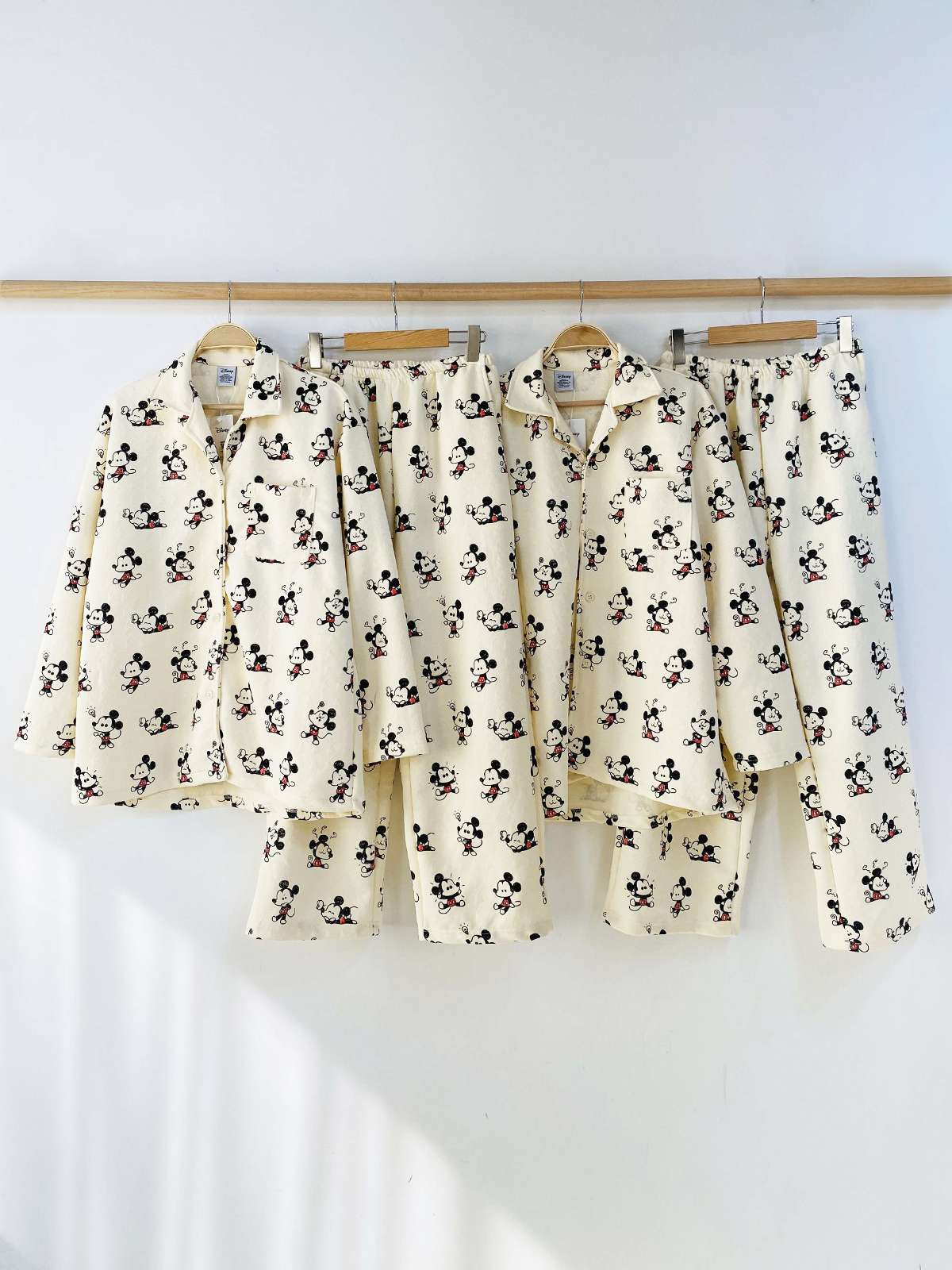 귀여운 미키마우스 캐릭터 패턴이 가득한 파자마 세트입니다.