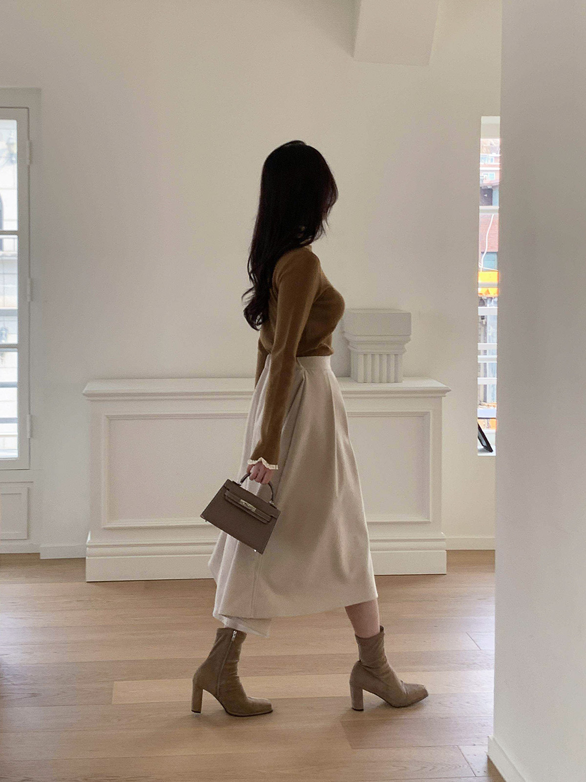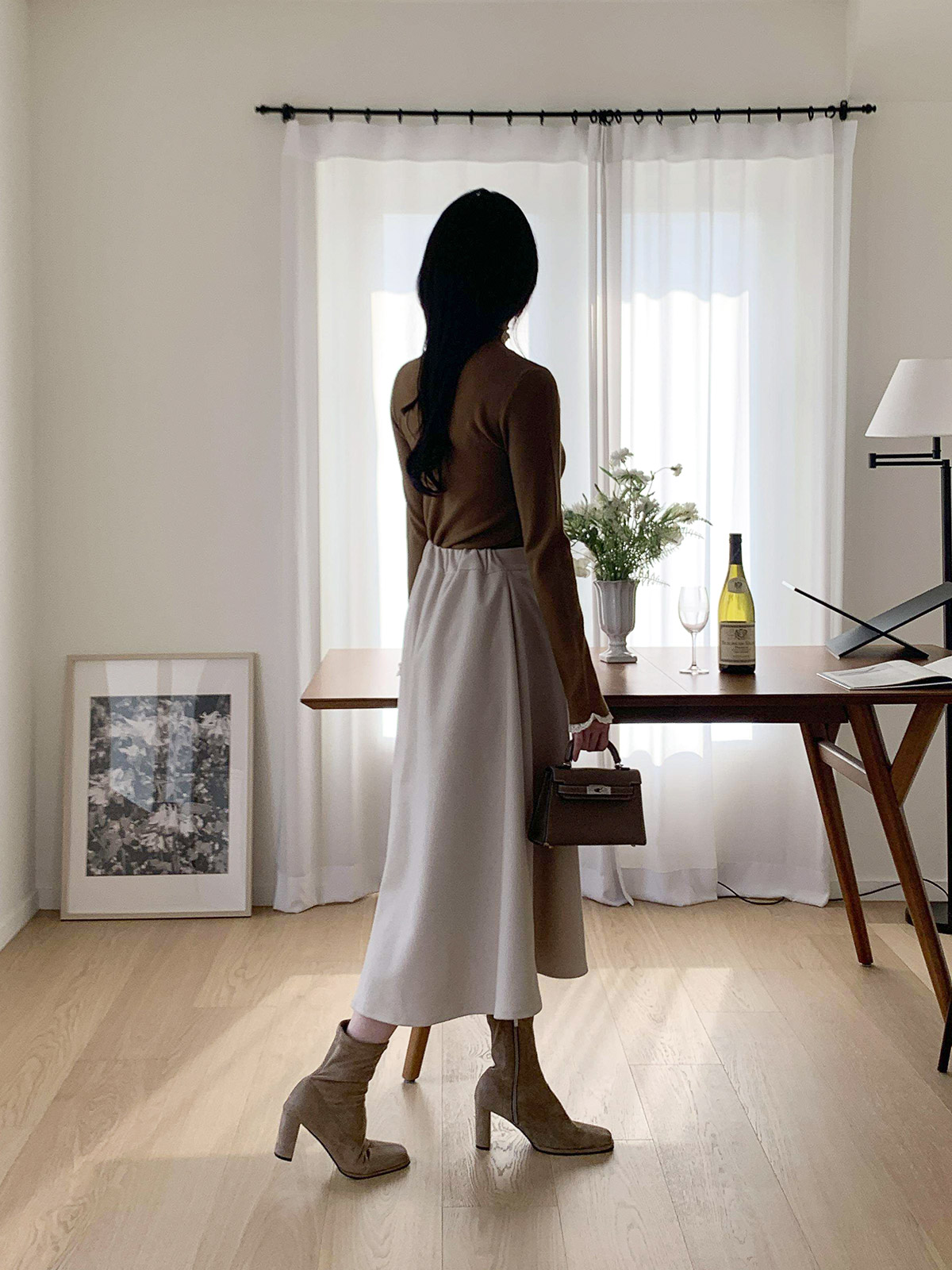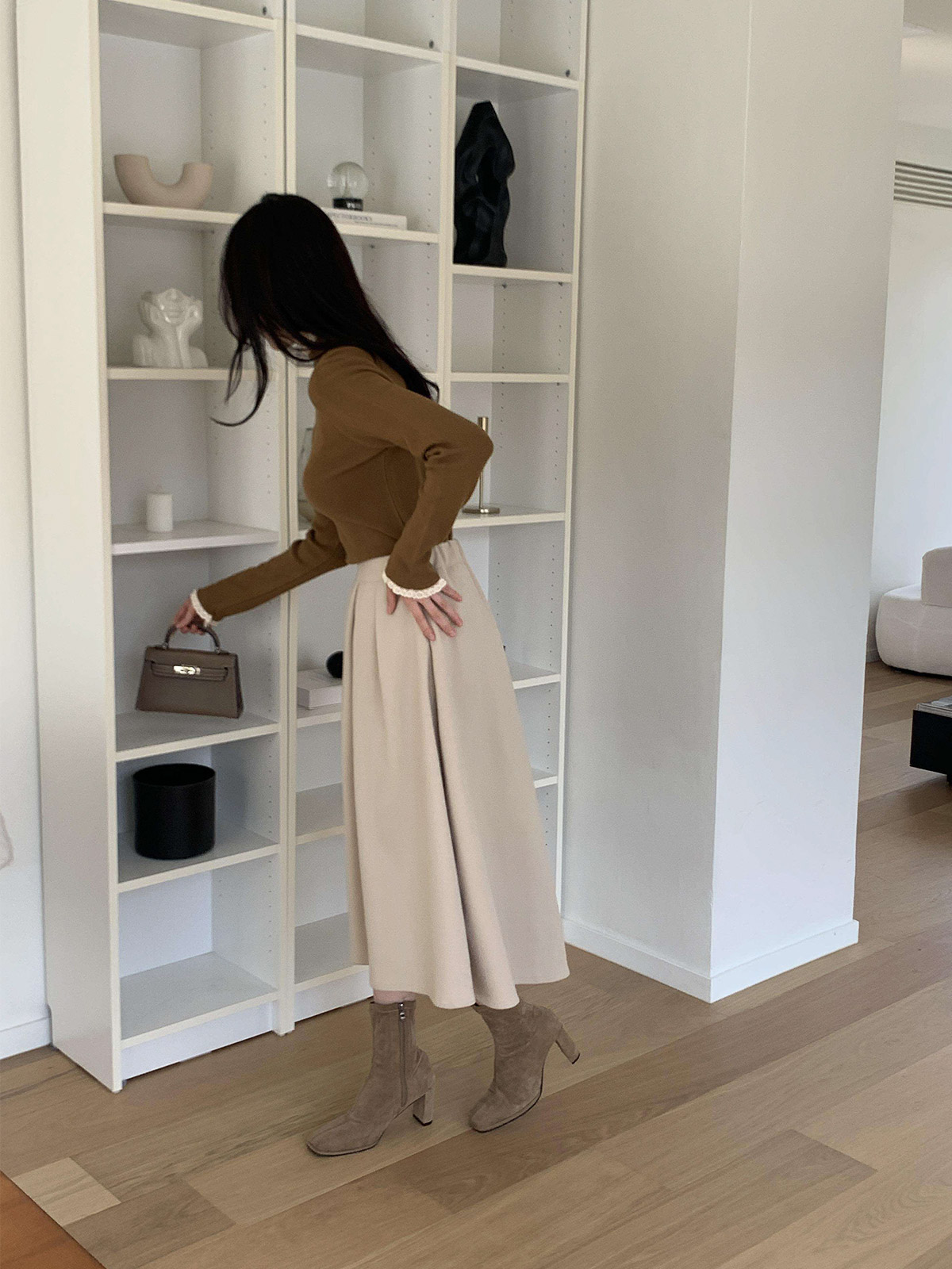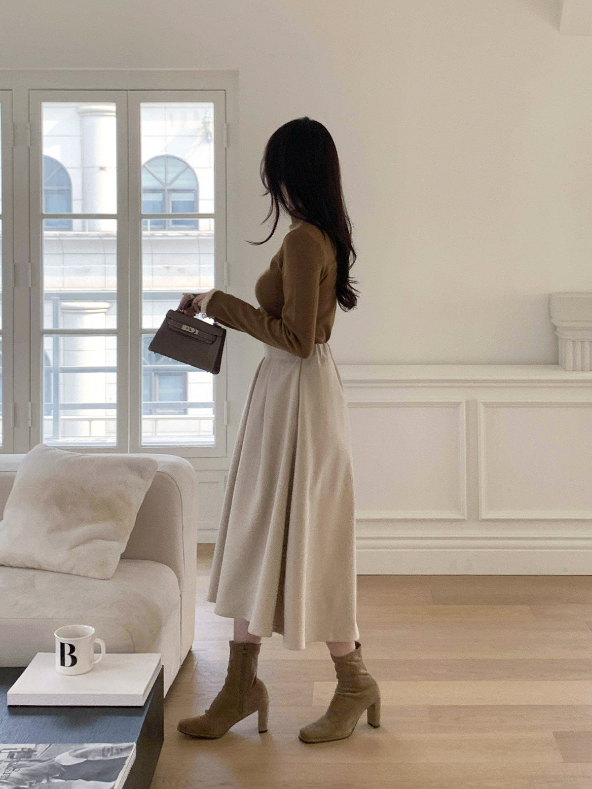 자연스럽게 퍼지는 플레어 핏의 스웨이드 스커트