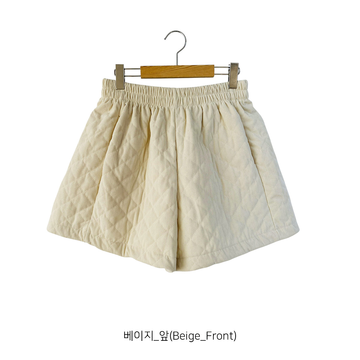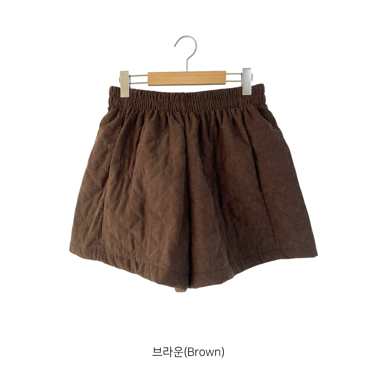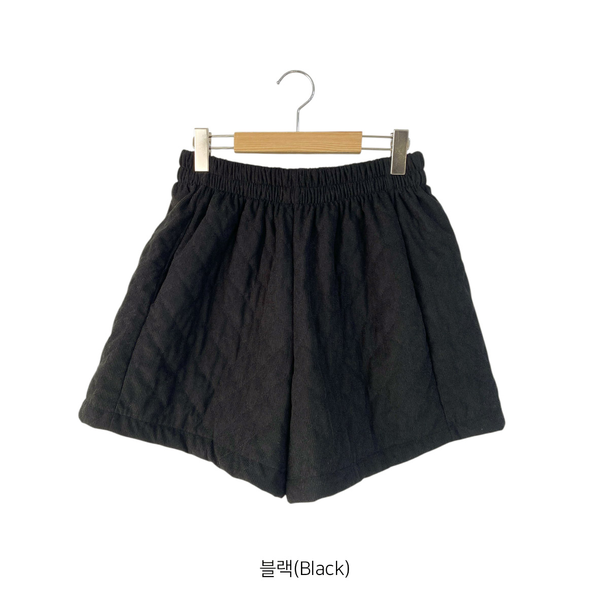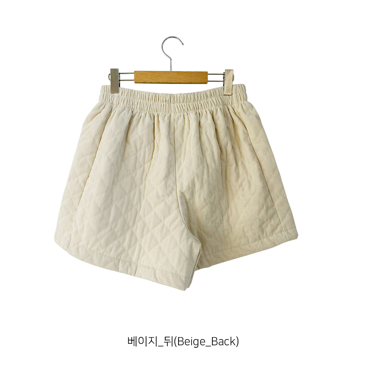 코듀로이 소재에 웰론 충전재를 넣어 누빔 처리된 반바지입니다.