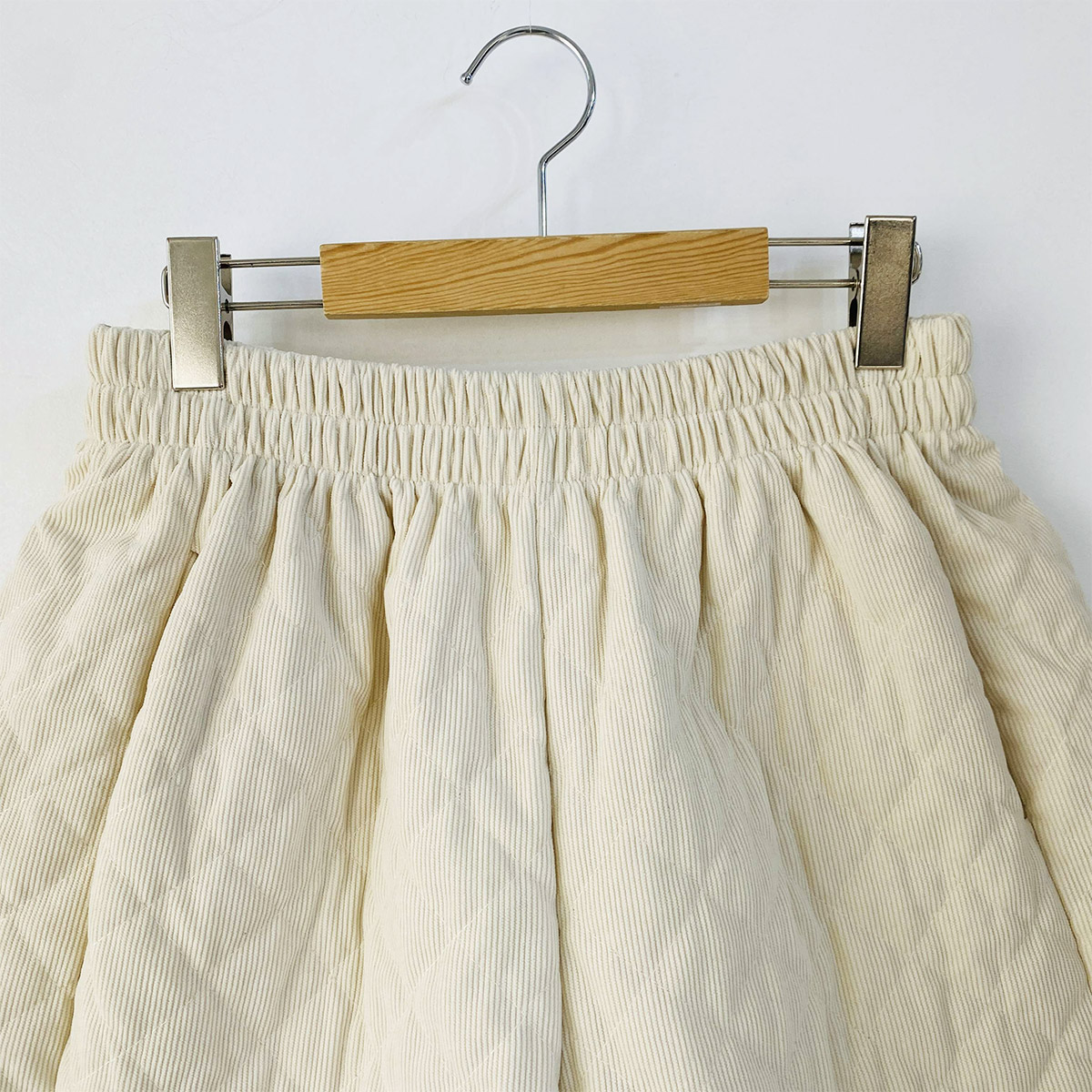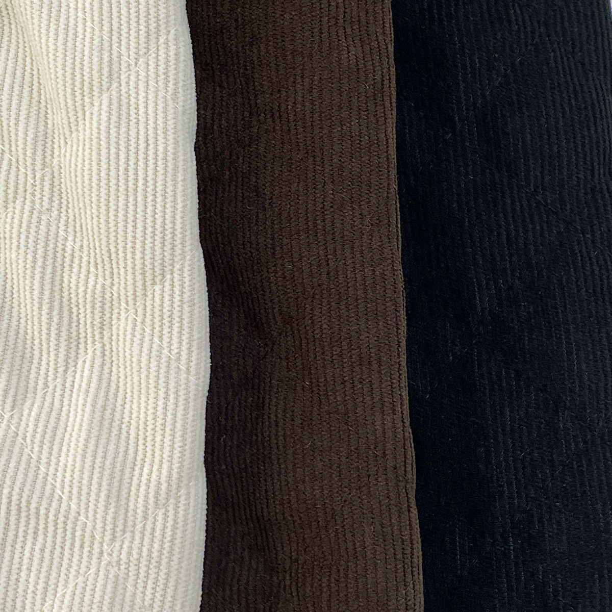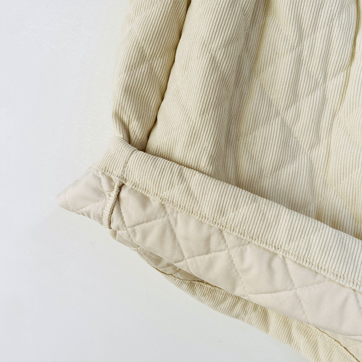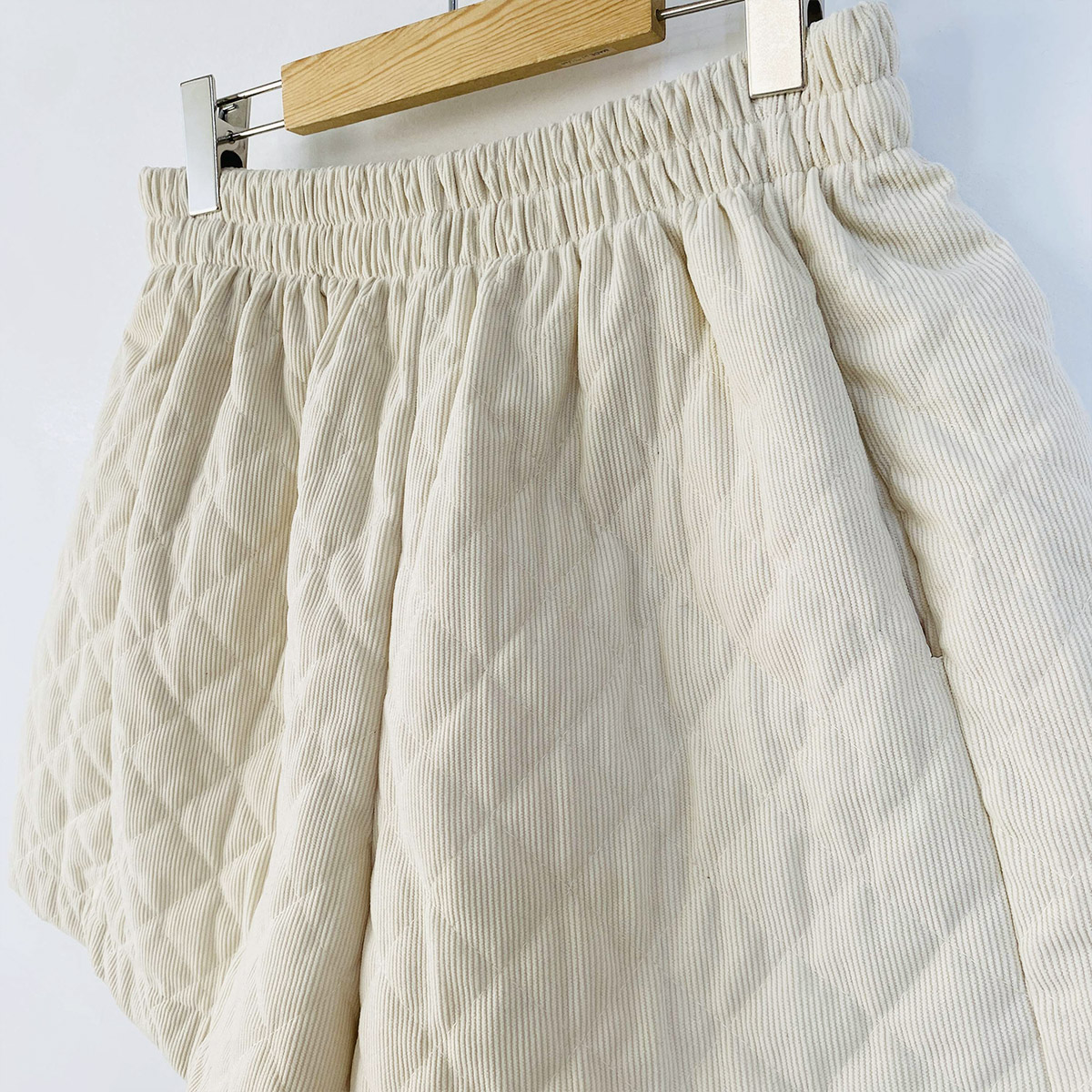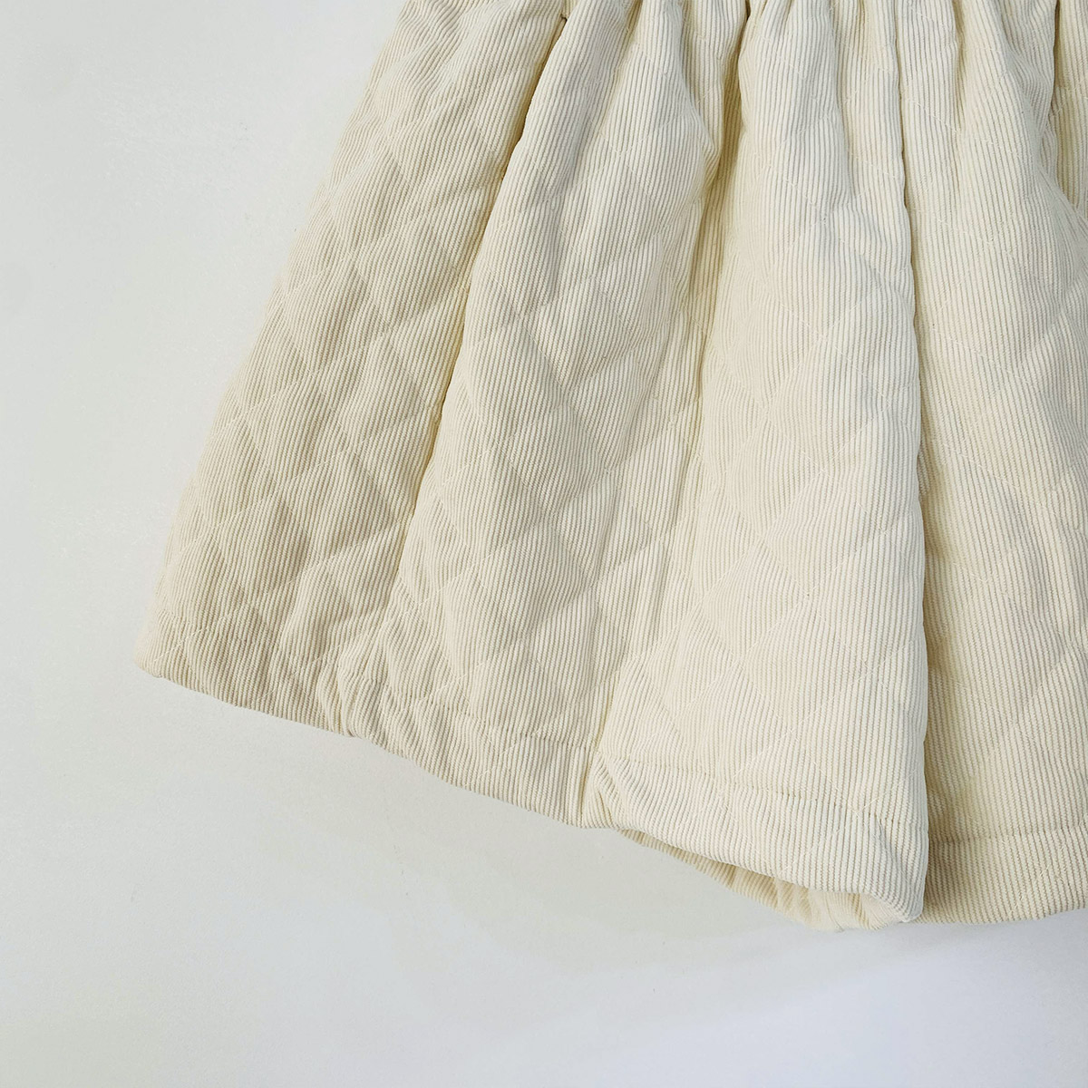 코듀로이 소재에 웰론 충전재를 넣어 누빔 처리된 반바지입니다.